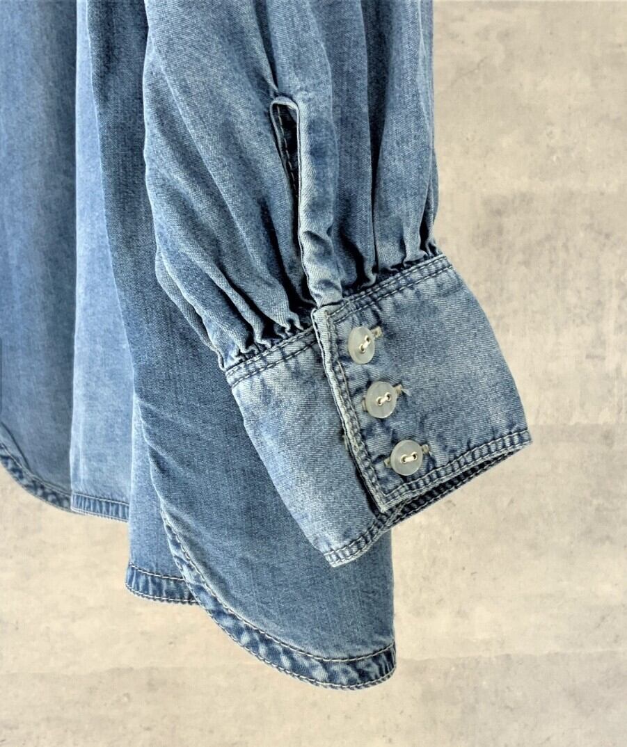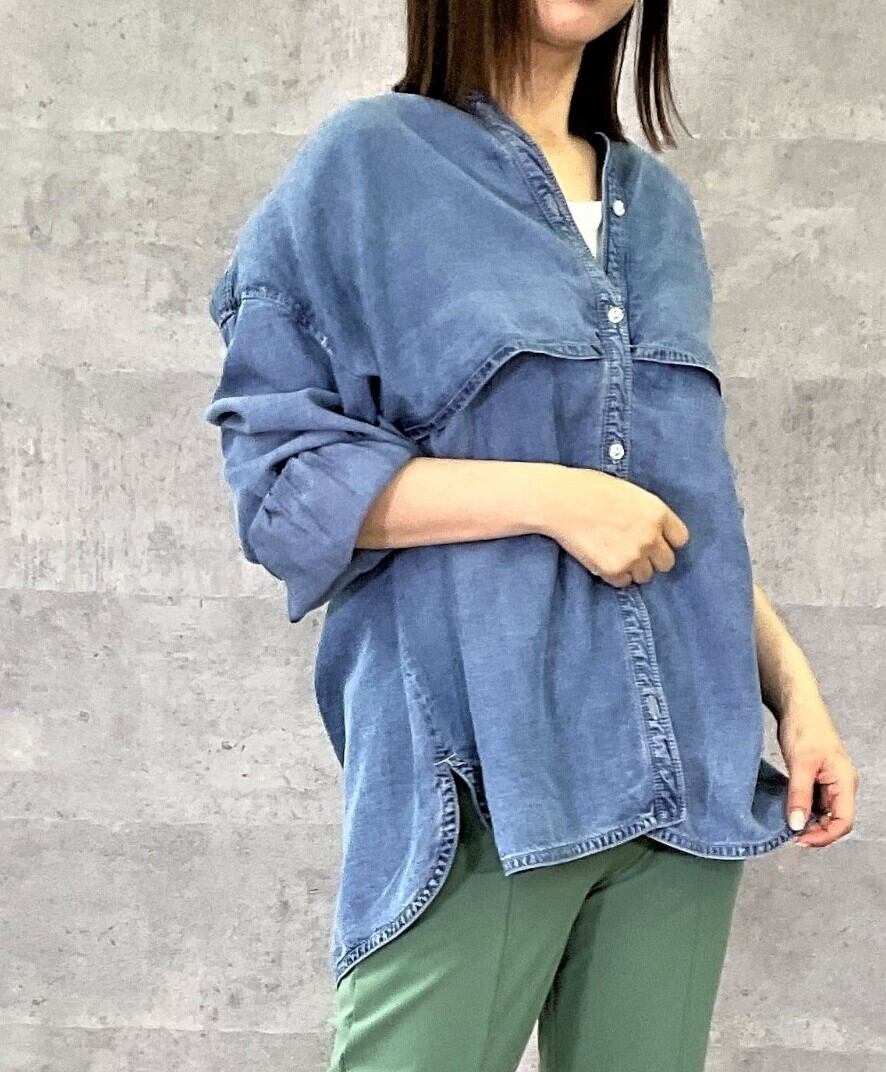 肩から身頃にかけて生地を二重にする今季HOTなデザインをテンセルシャツで作りました。