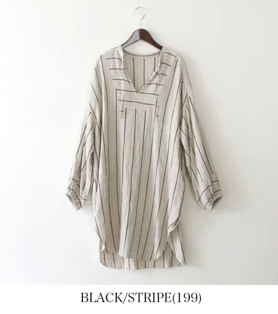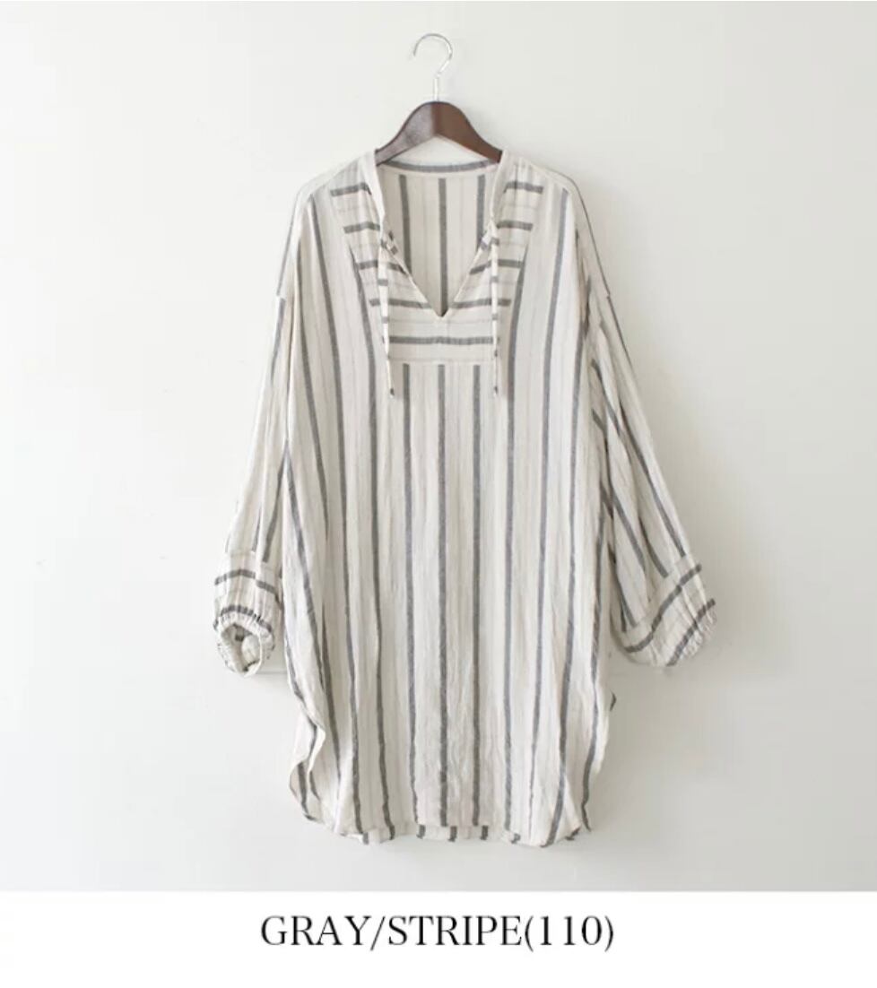 ボーダーの生地をストライプ使いした、ヨーク切り替えのスキッパーシャツチュニック。