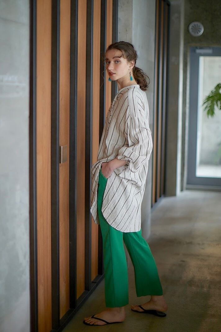 前後差のある着丈と、深めに入ったスリットが幅広いボトムと好相性。