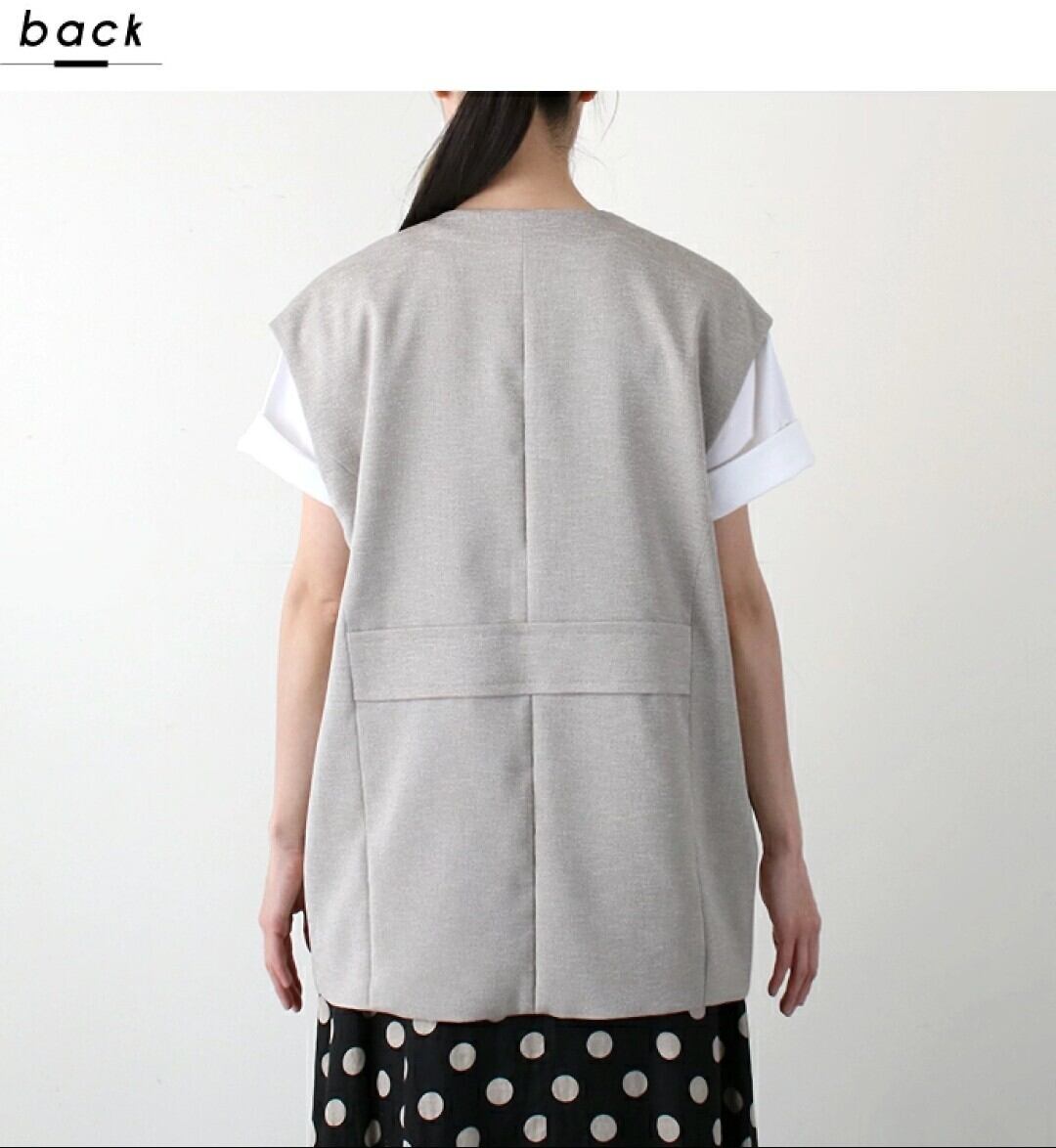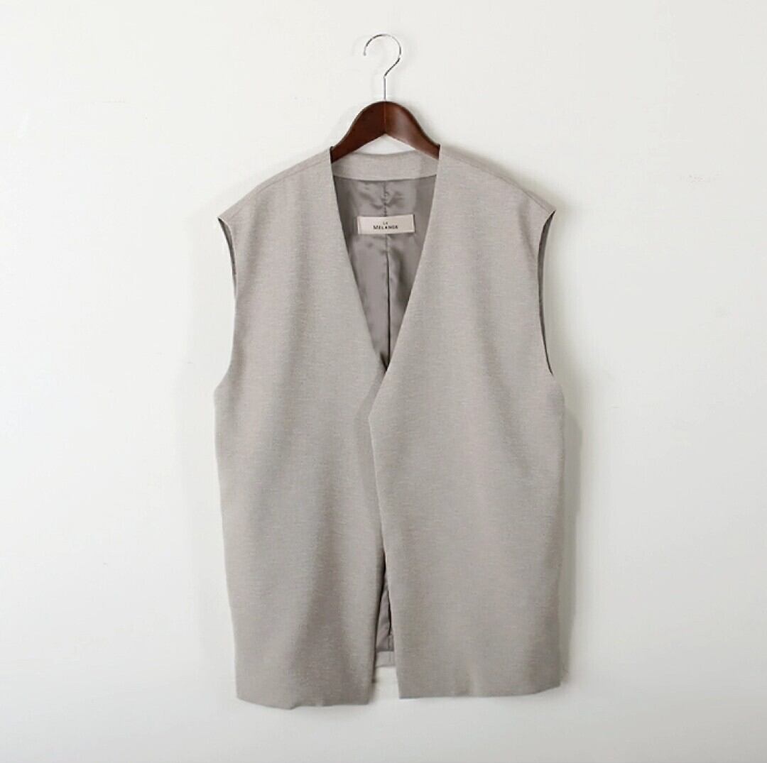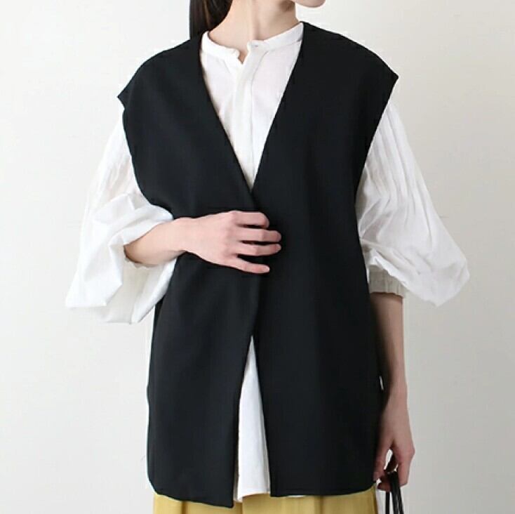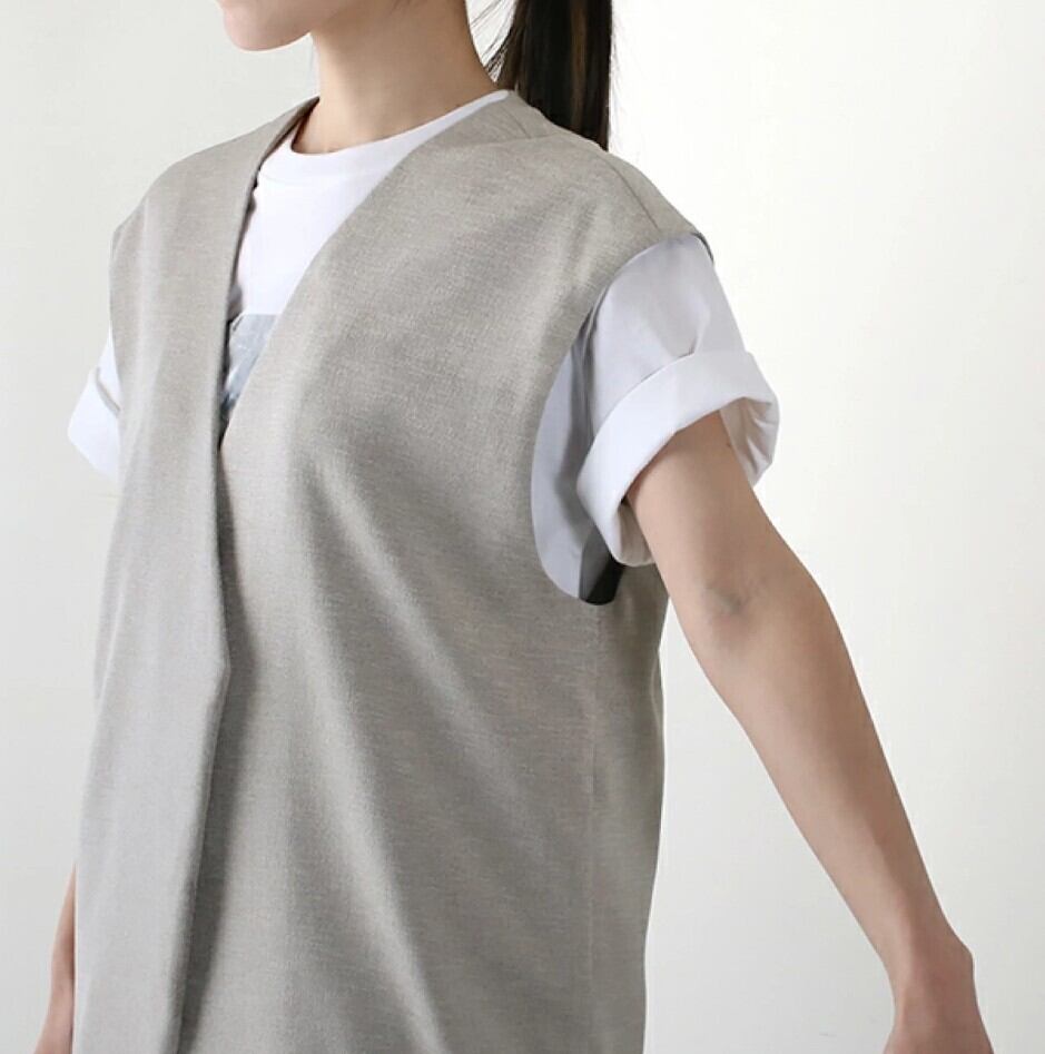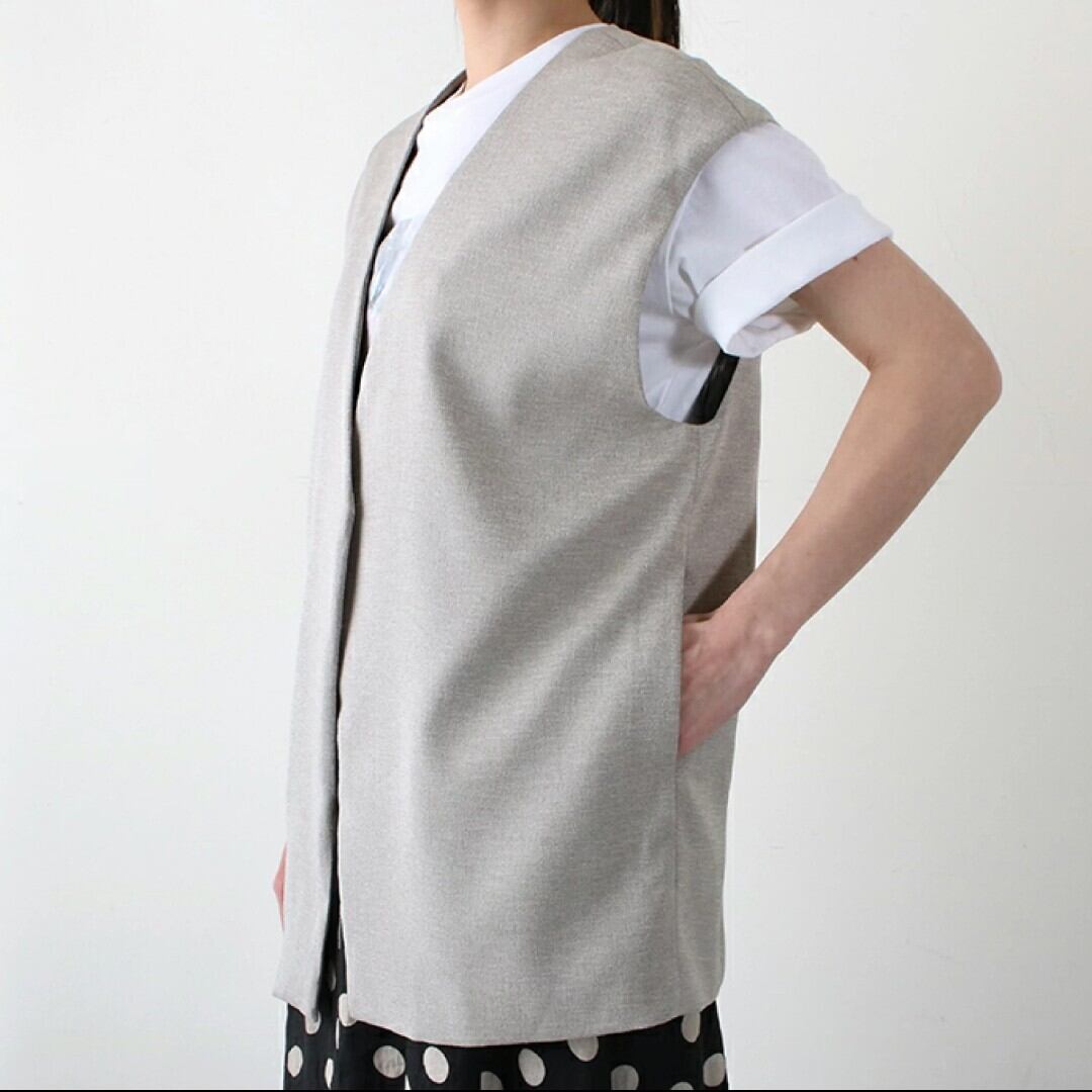 フロントボタンはなく、クリーンでシンプルなノーカラーベスト。