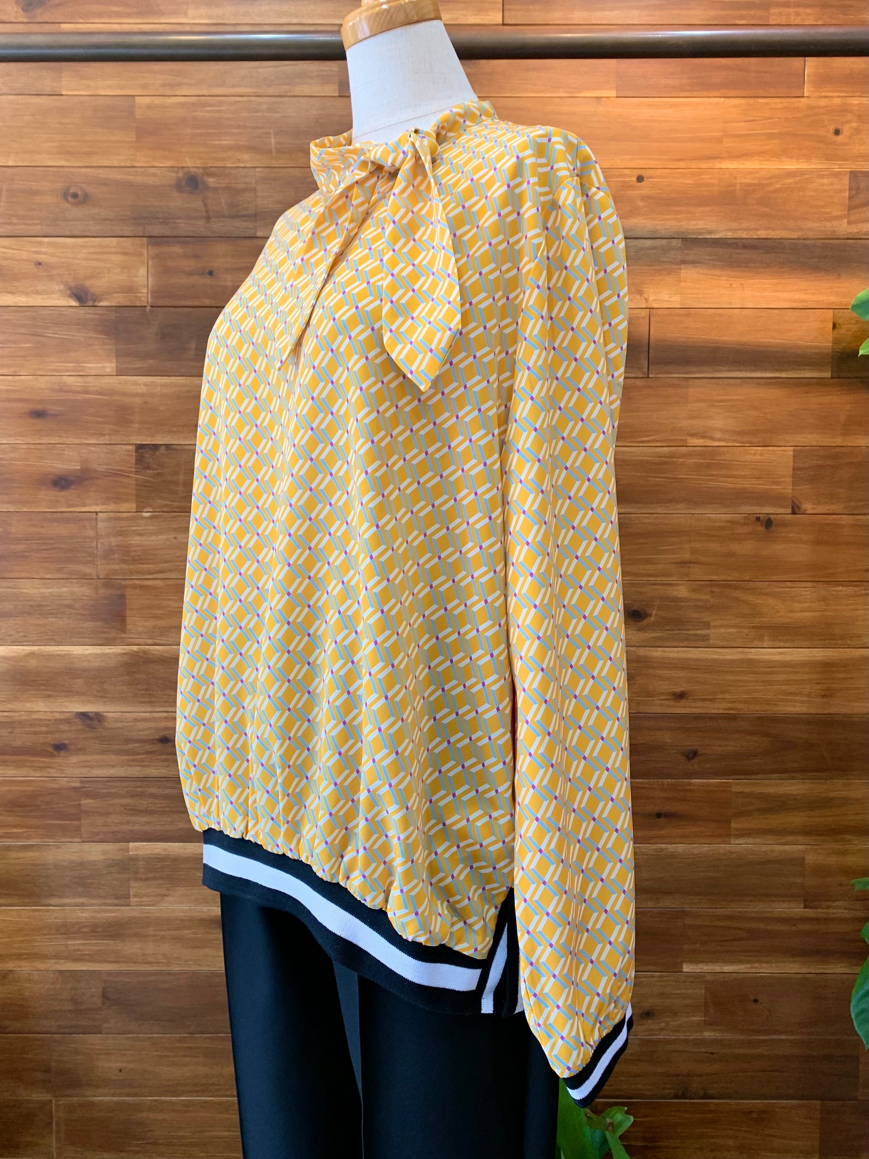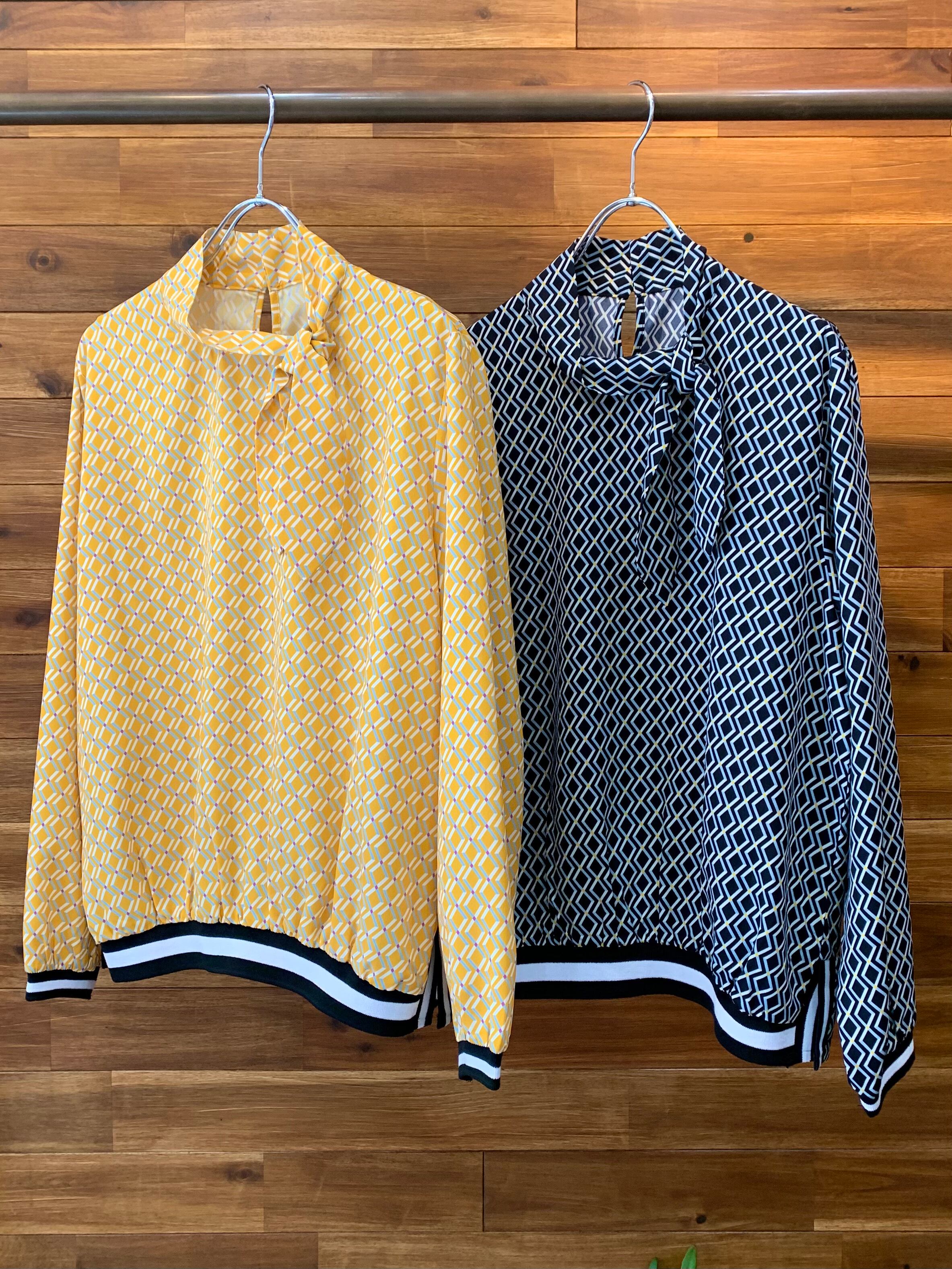 スカーフを巻いたようなリボンタイの襟元がオシャレな、どこかレトロな雰囲気のブラウス♪