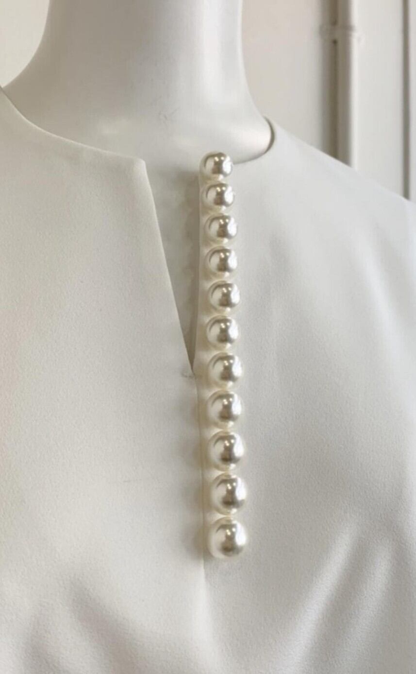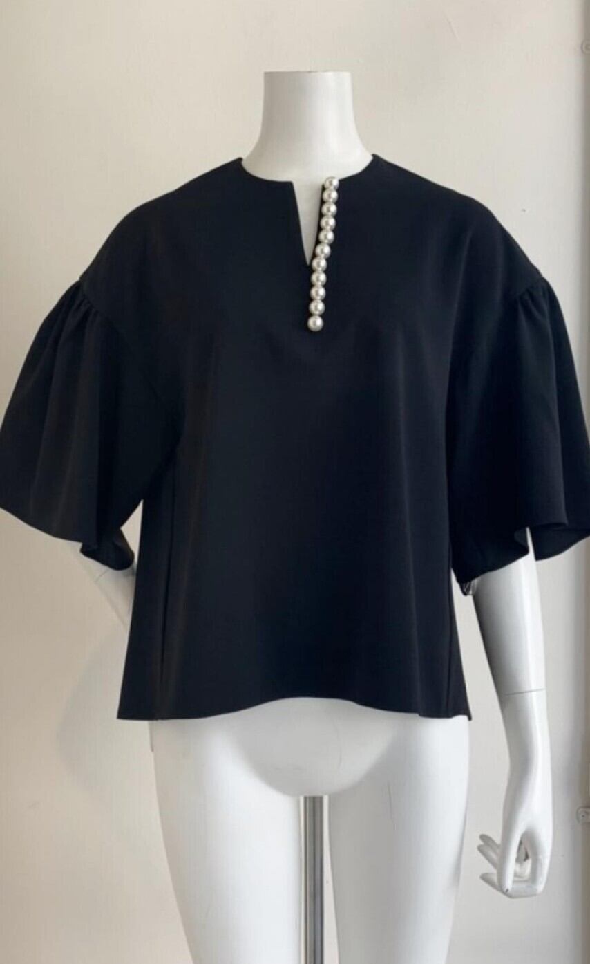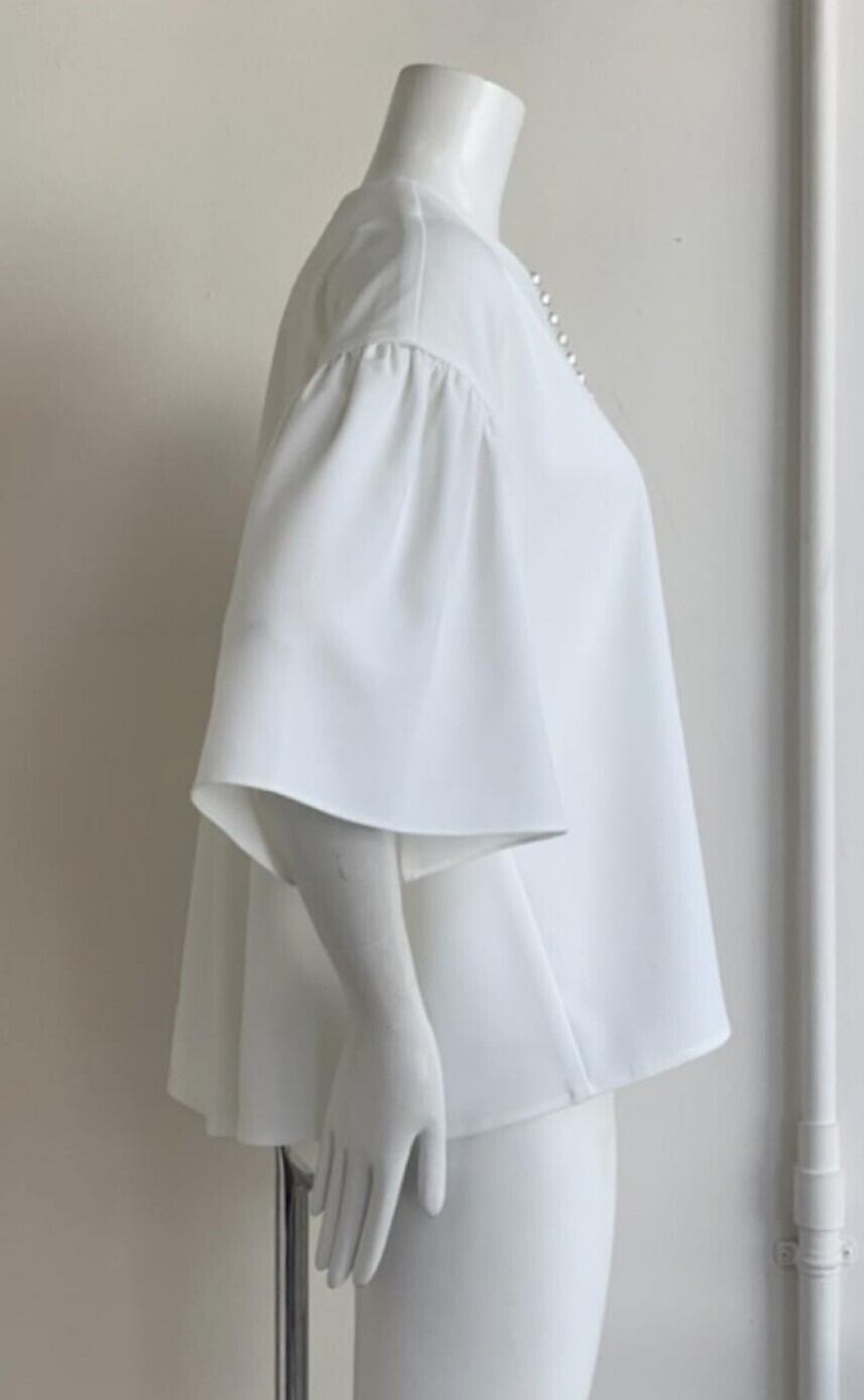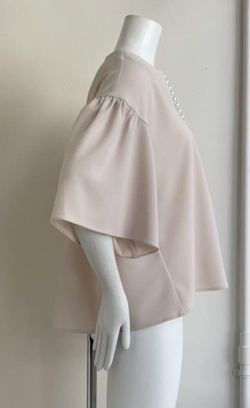 華やかなパールと落ち感のあるフレアスリーブが魅力のキーネックブラウス。
