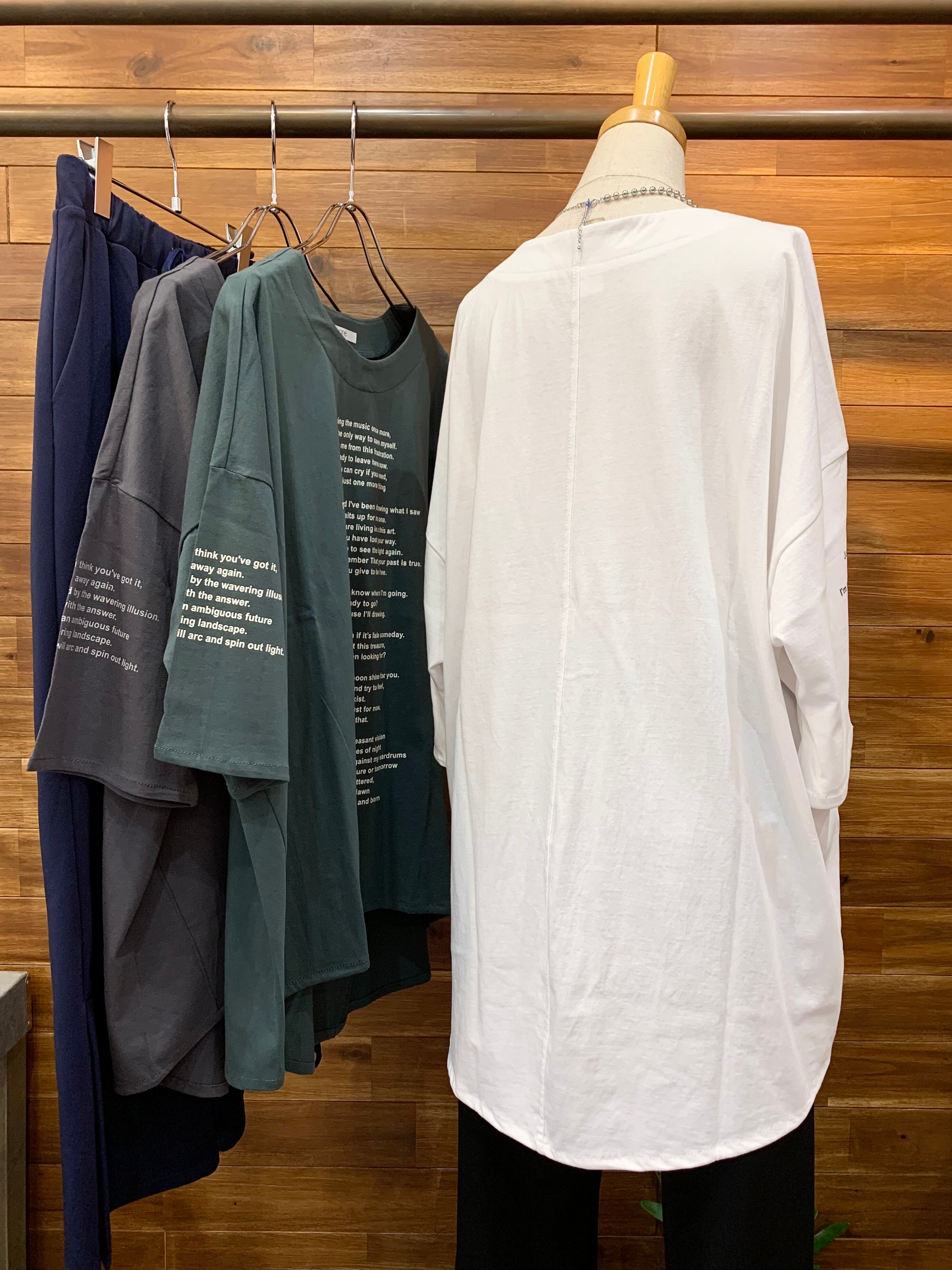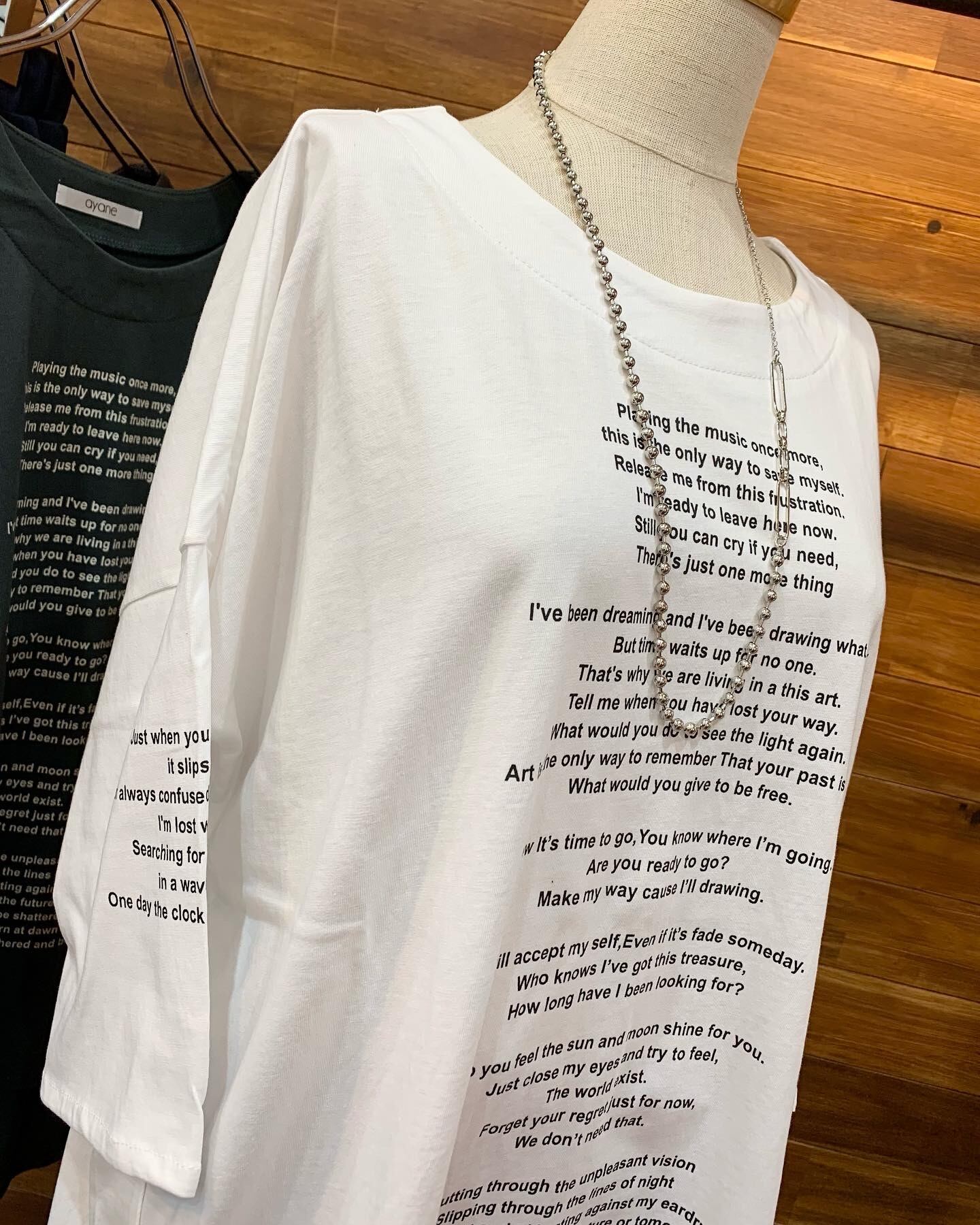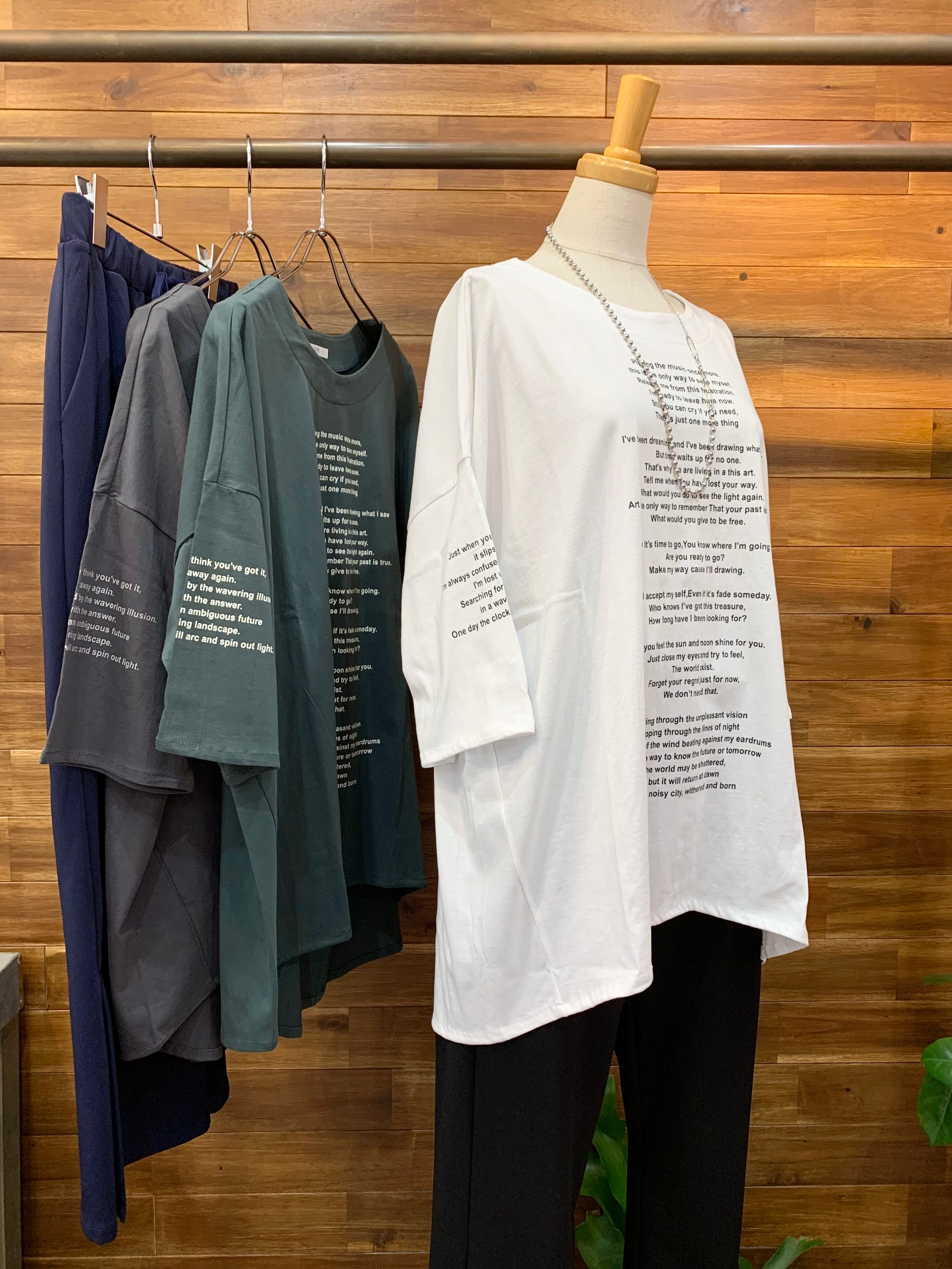 フロントには細かな文字の沢山のロゴ、右袖にもアシメトリーに細かなロゴが入っており、大人女子な雰囲気のTシャツに仕上がりました◎