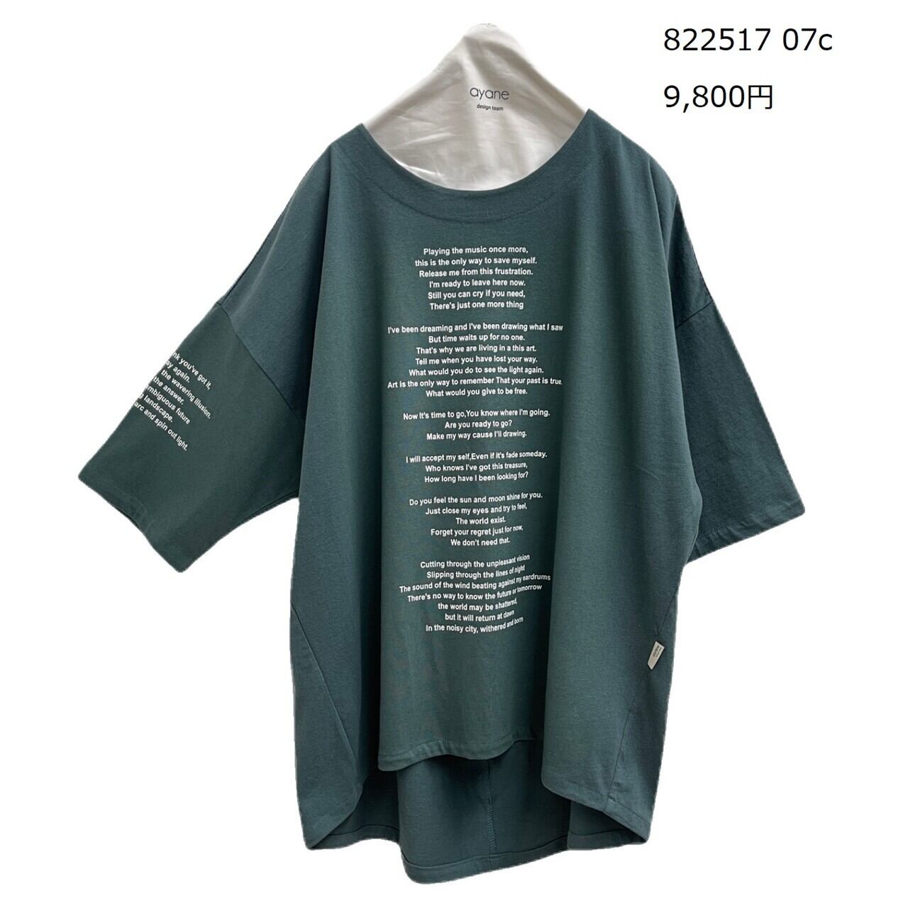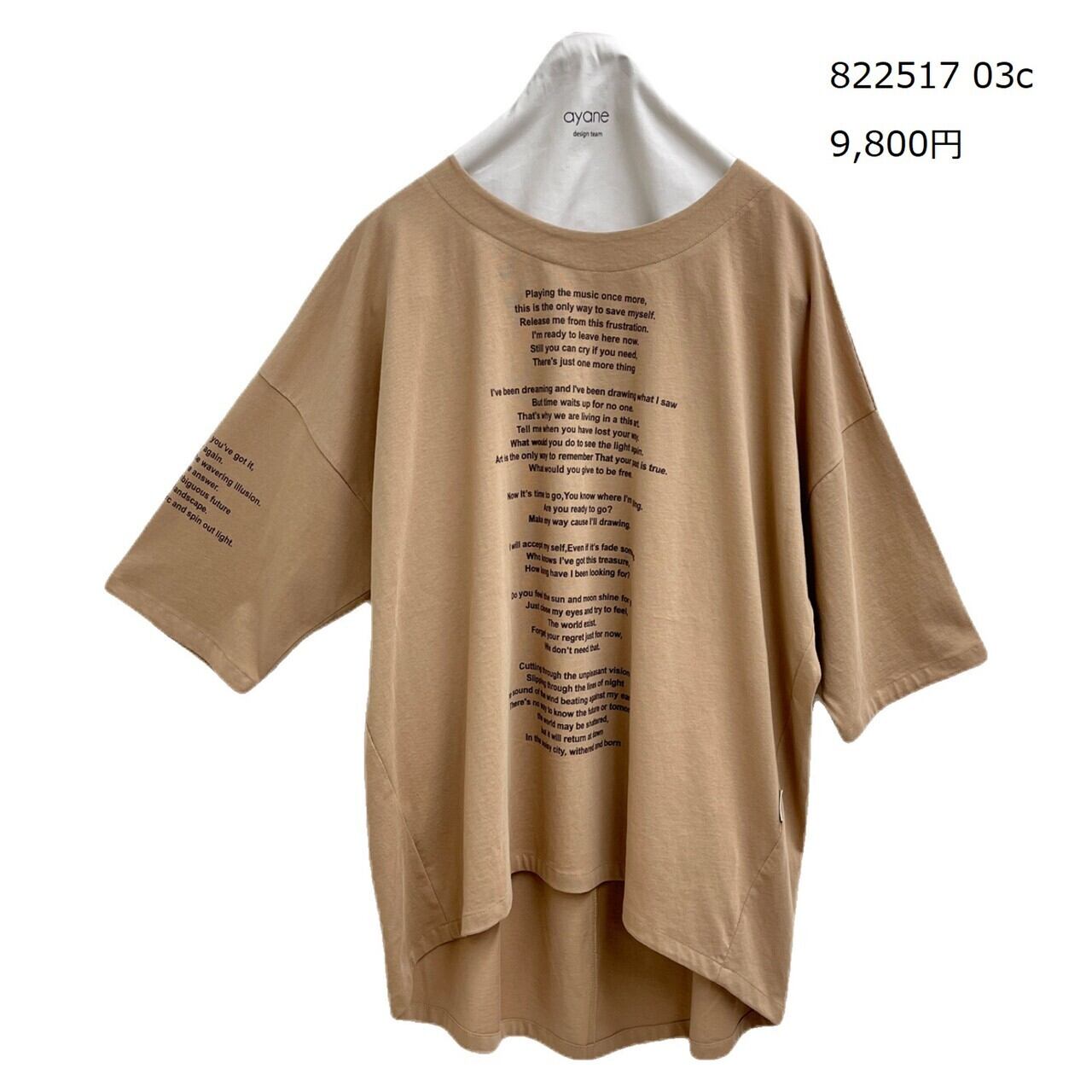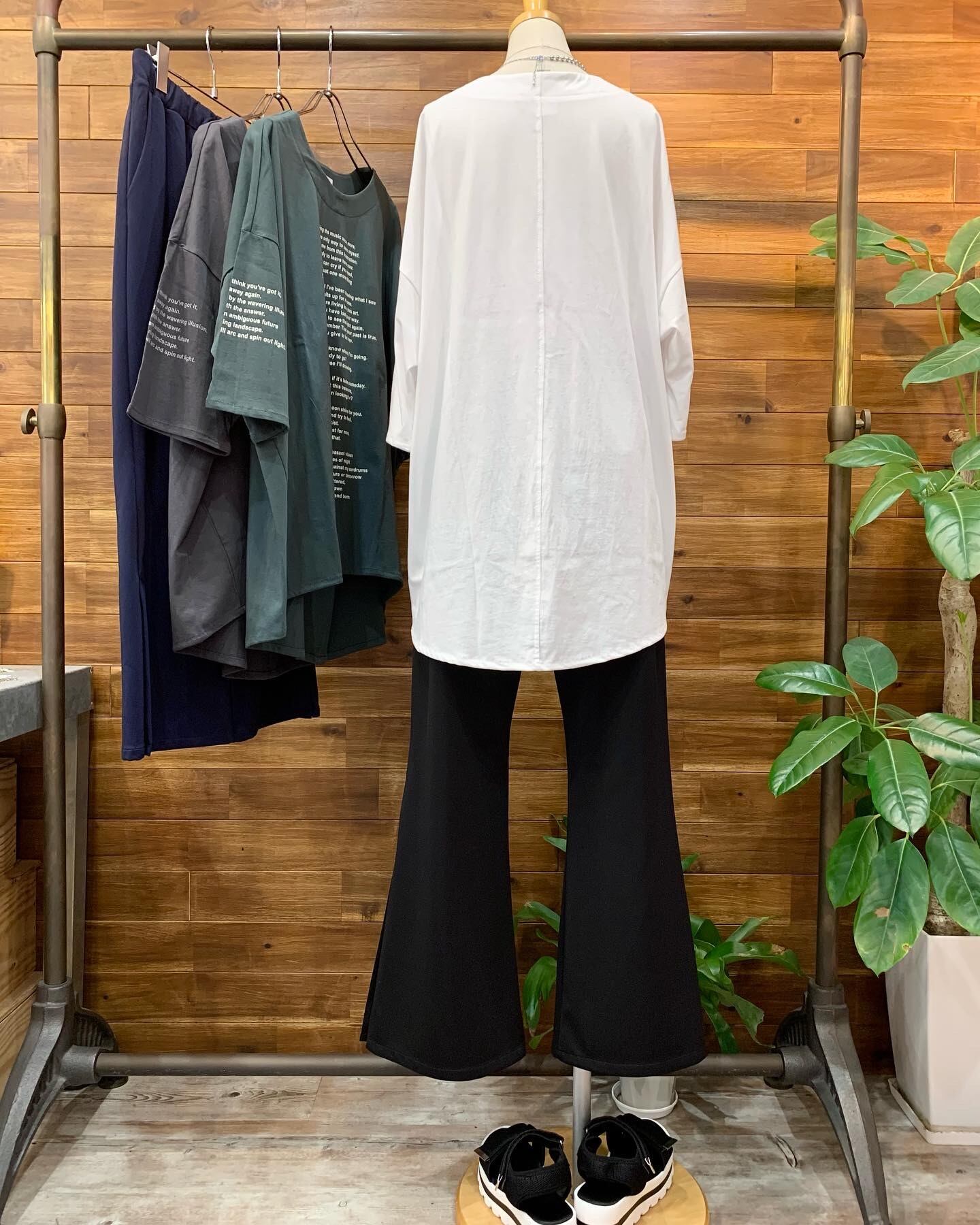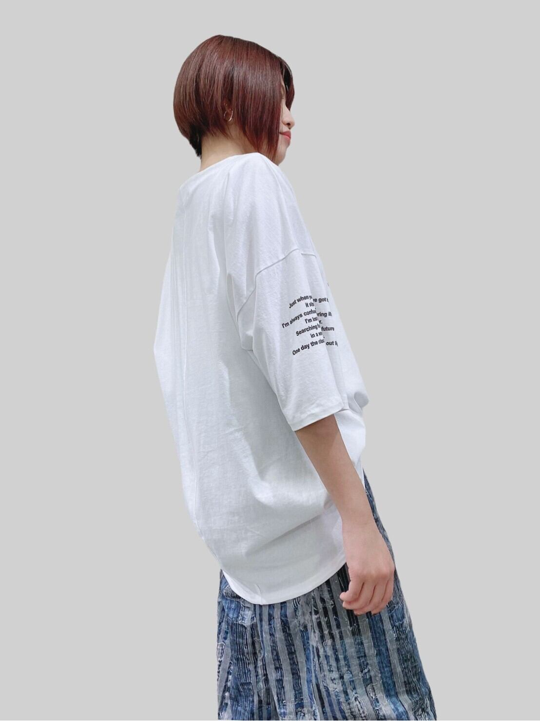 フロントには細かな文字の沢山のロゴ、右袖にもアシメトリーに細かなロゴが入っており、大人女子な雰囲気のTシャツに仕上がりました◎