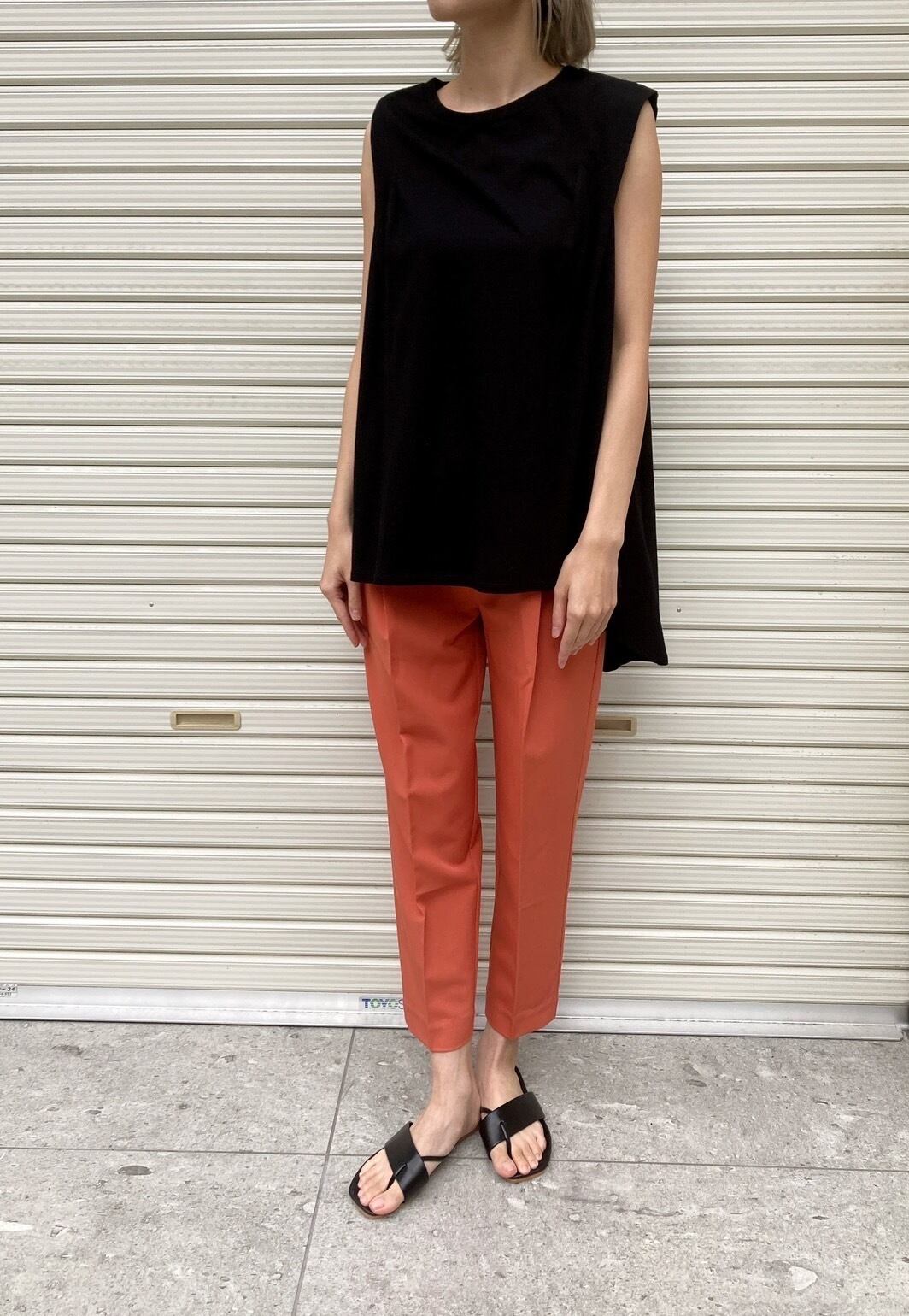 程良い開きのアームホールでインナーが見えず、ノースリーブで涼しげな印象に。