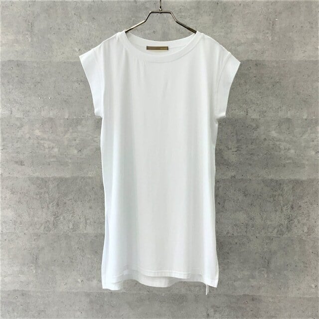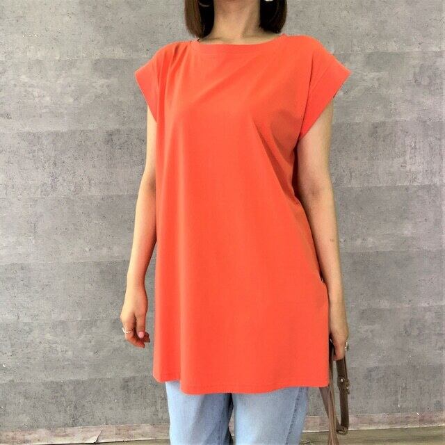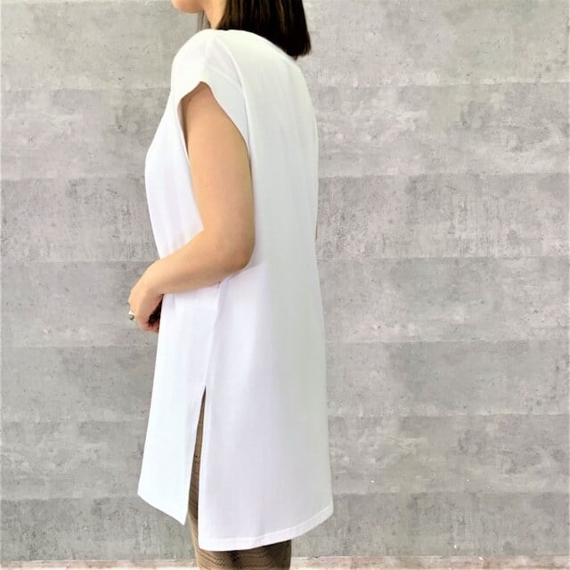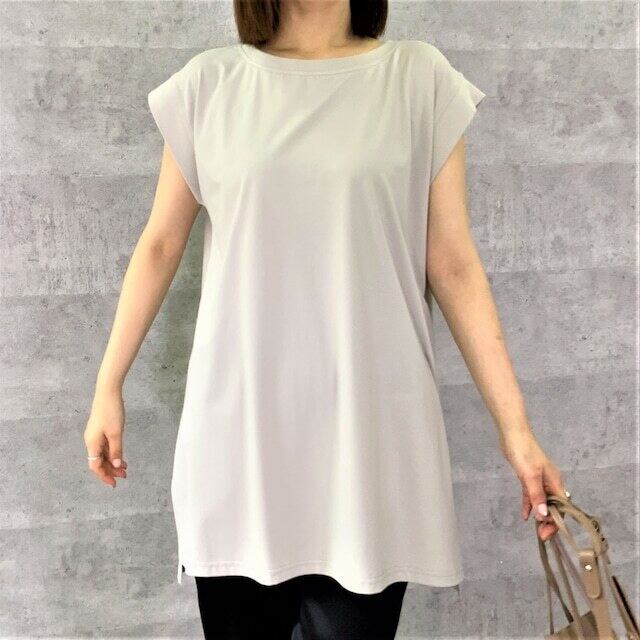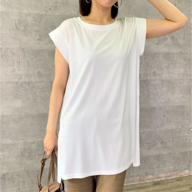 安心のフレンチスリーブと、ヒップまですっぽり隠れる長めのレングスに深めのサイドスリット。
