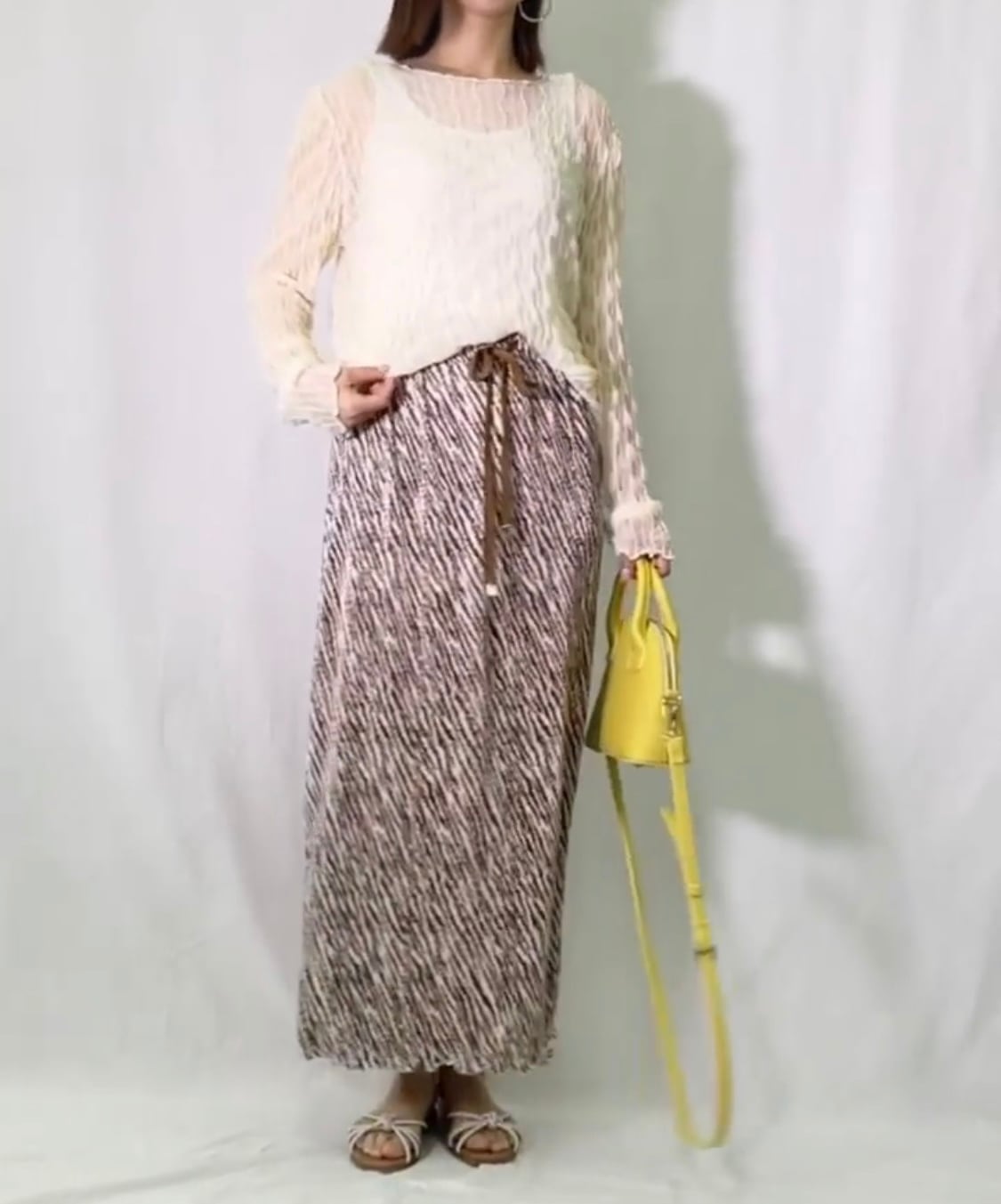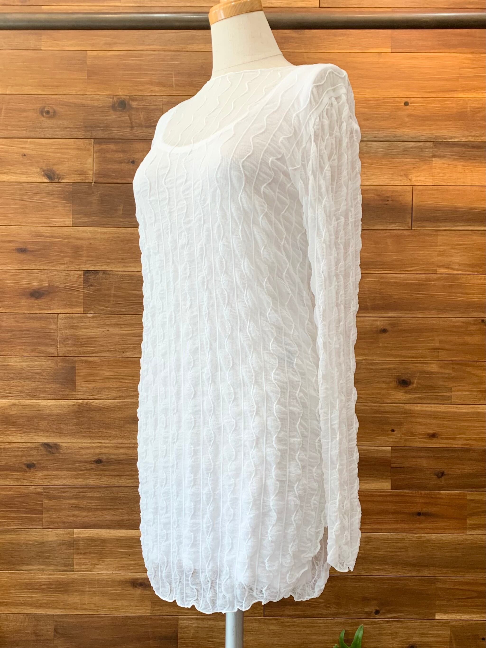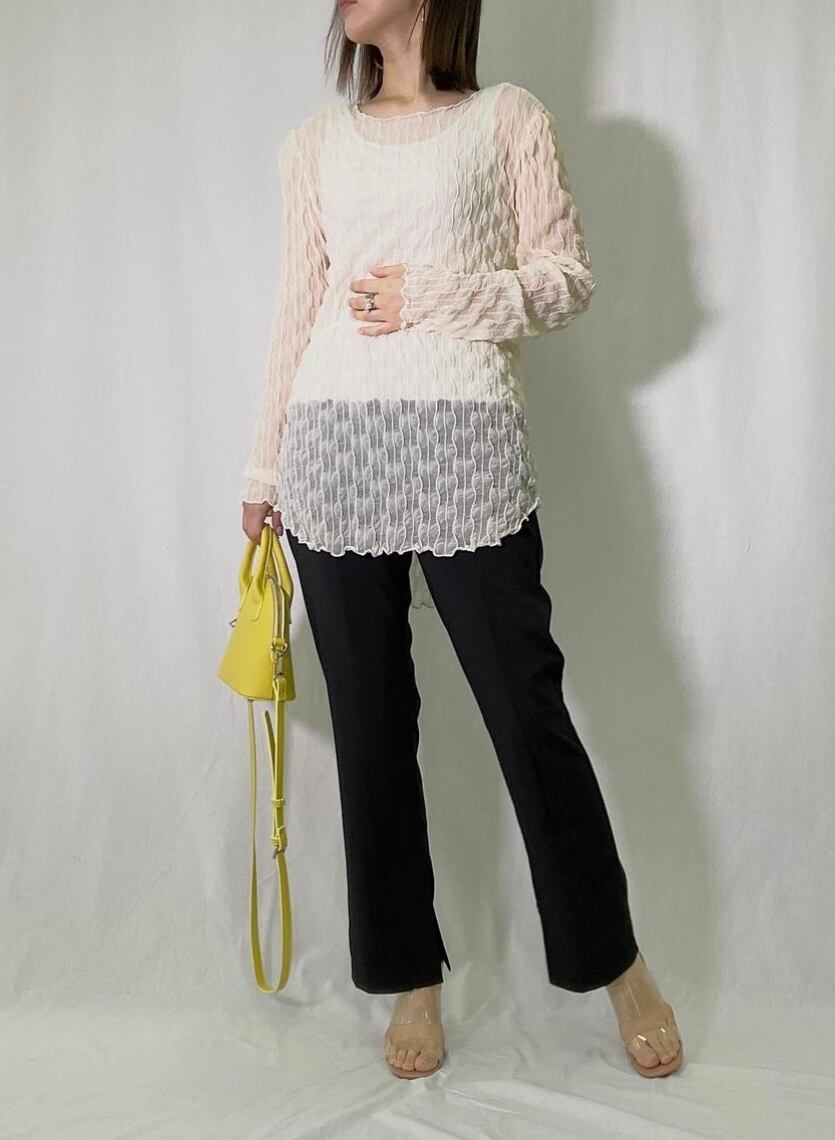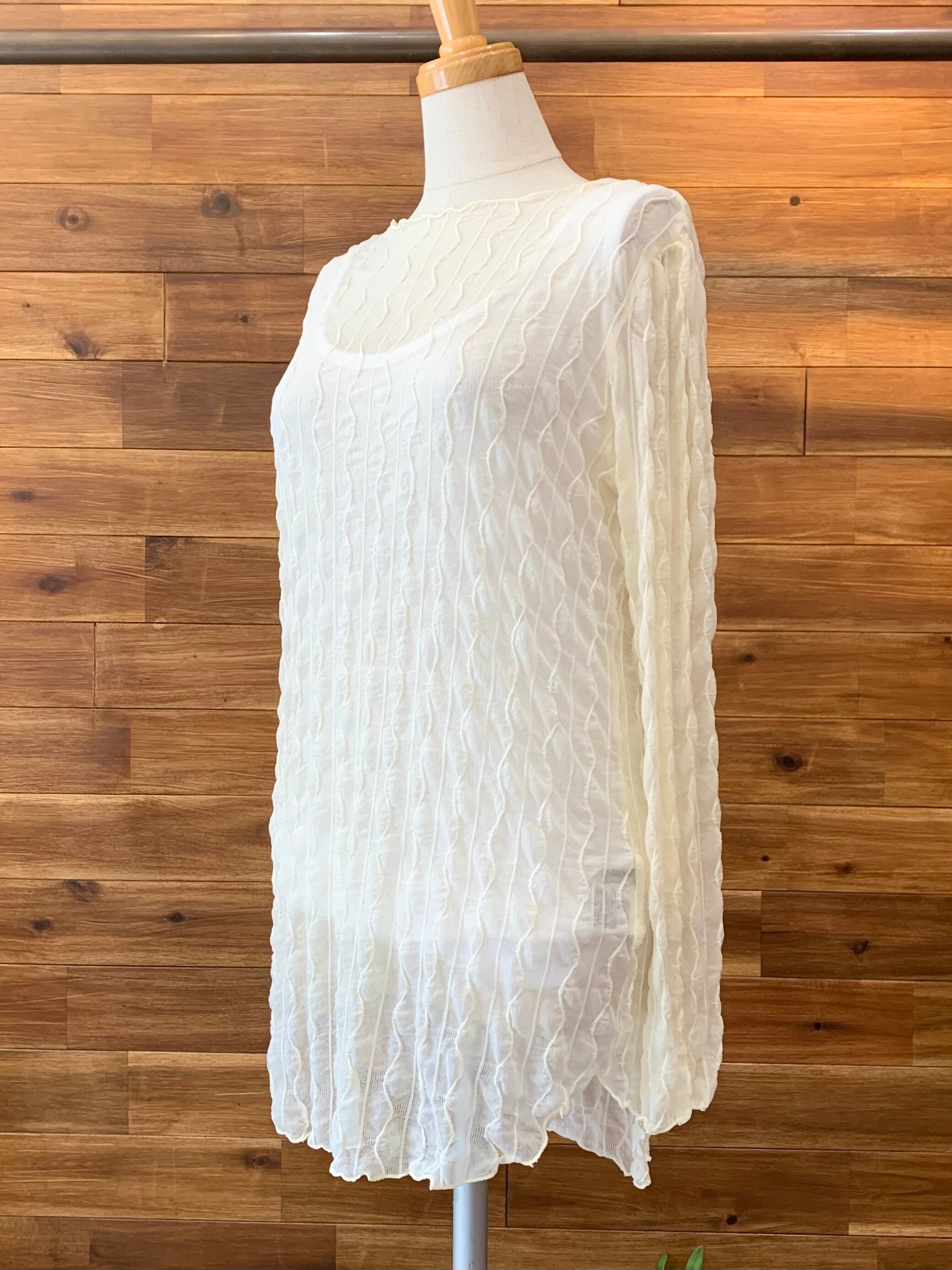 お色はホワイトとアイボリー♫中に濃い色のタンクトップを入れてシアーな表情を出して着ても良いですね◎