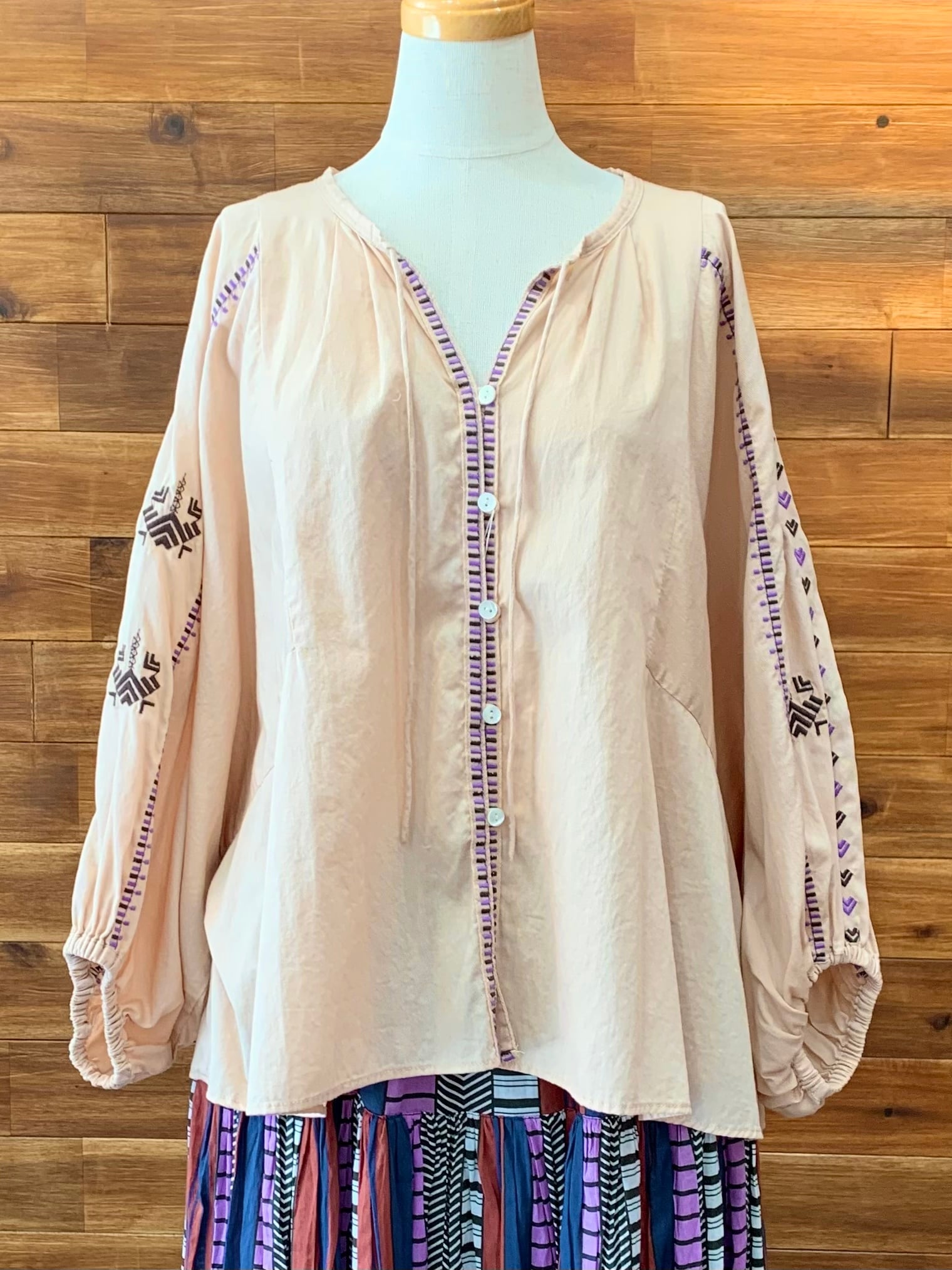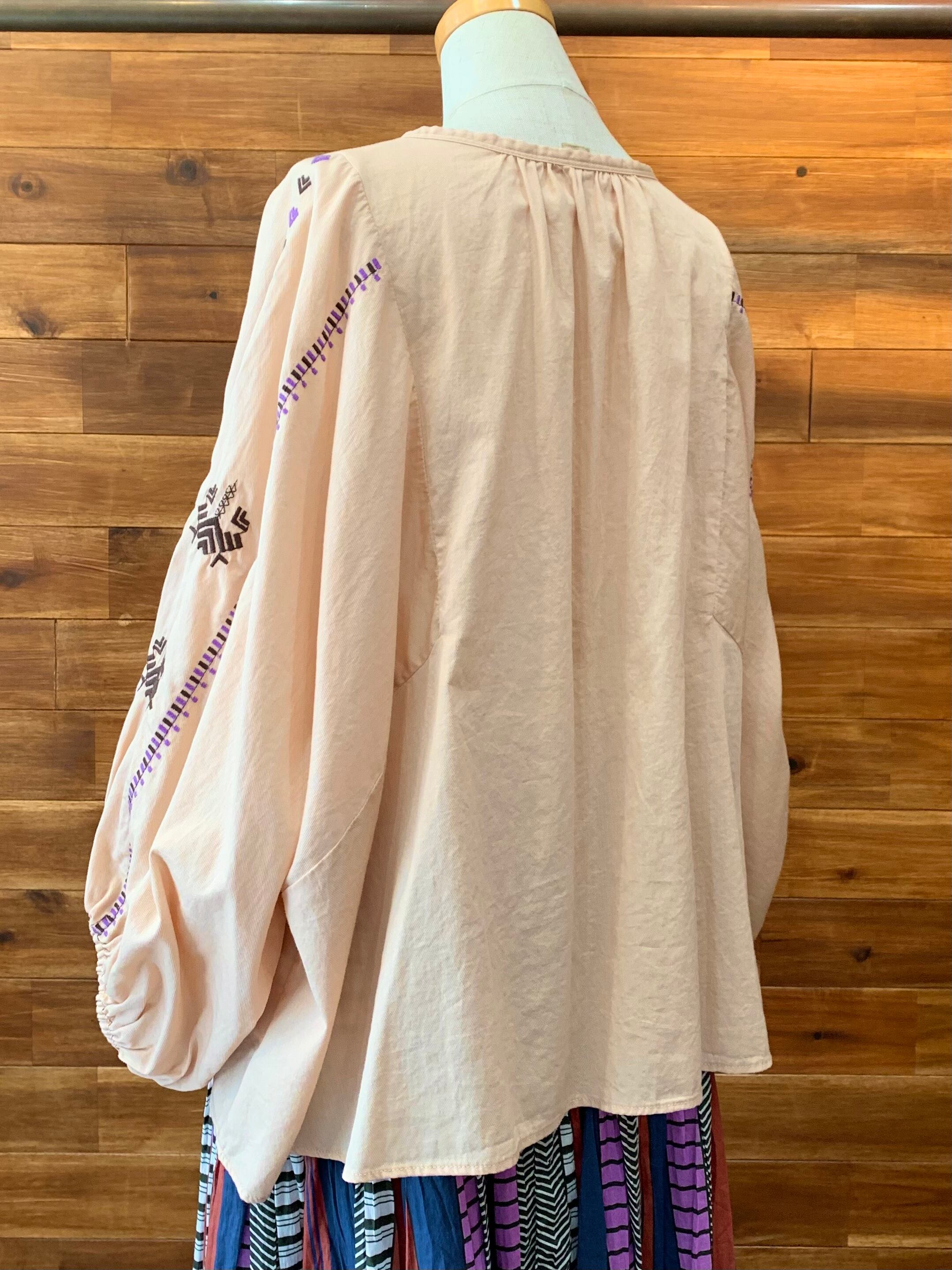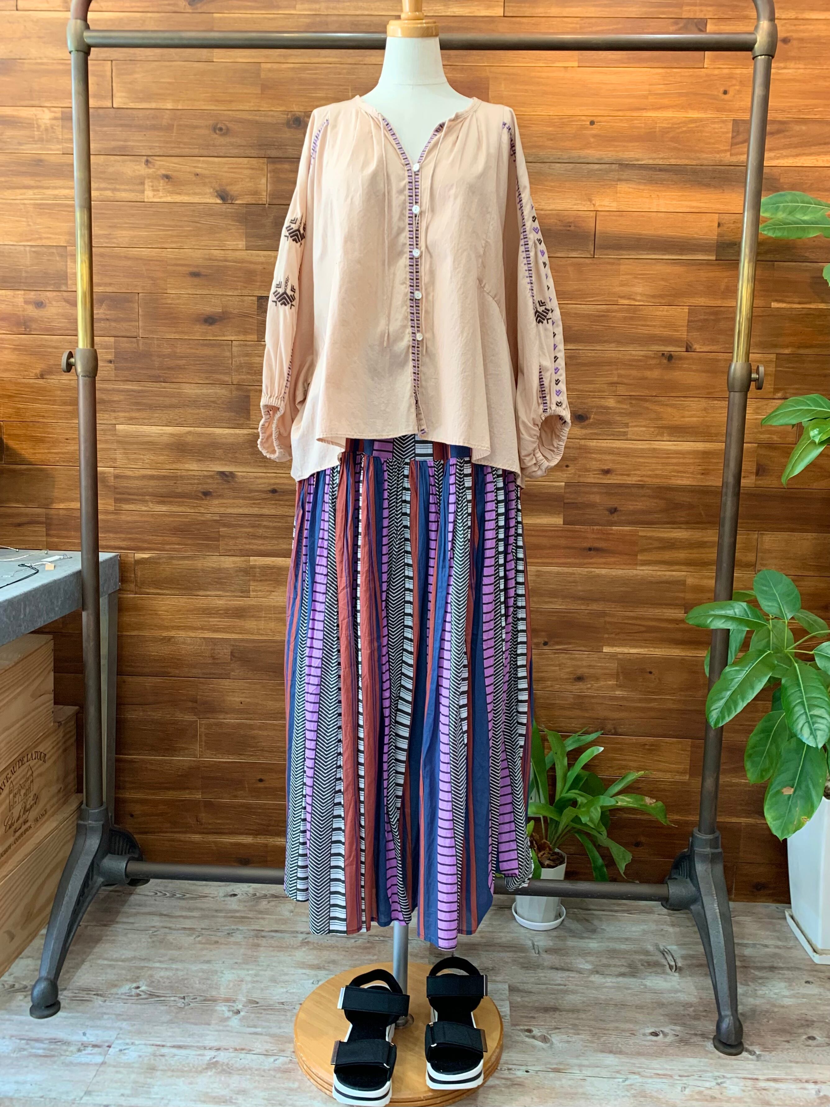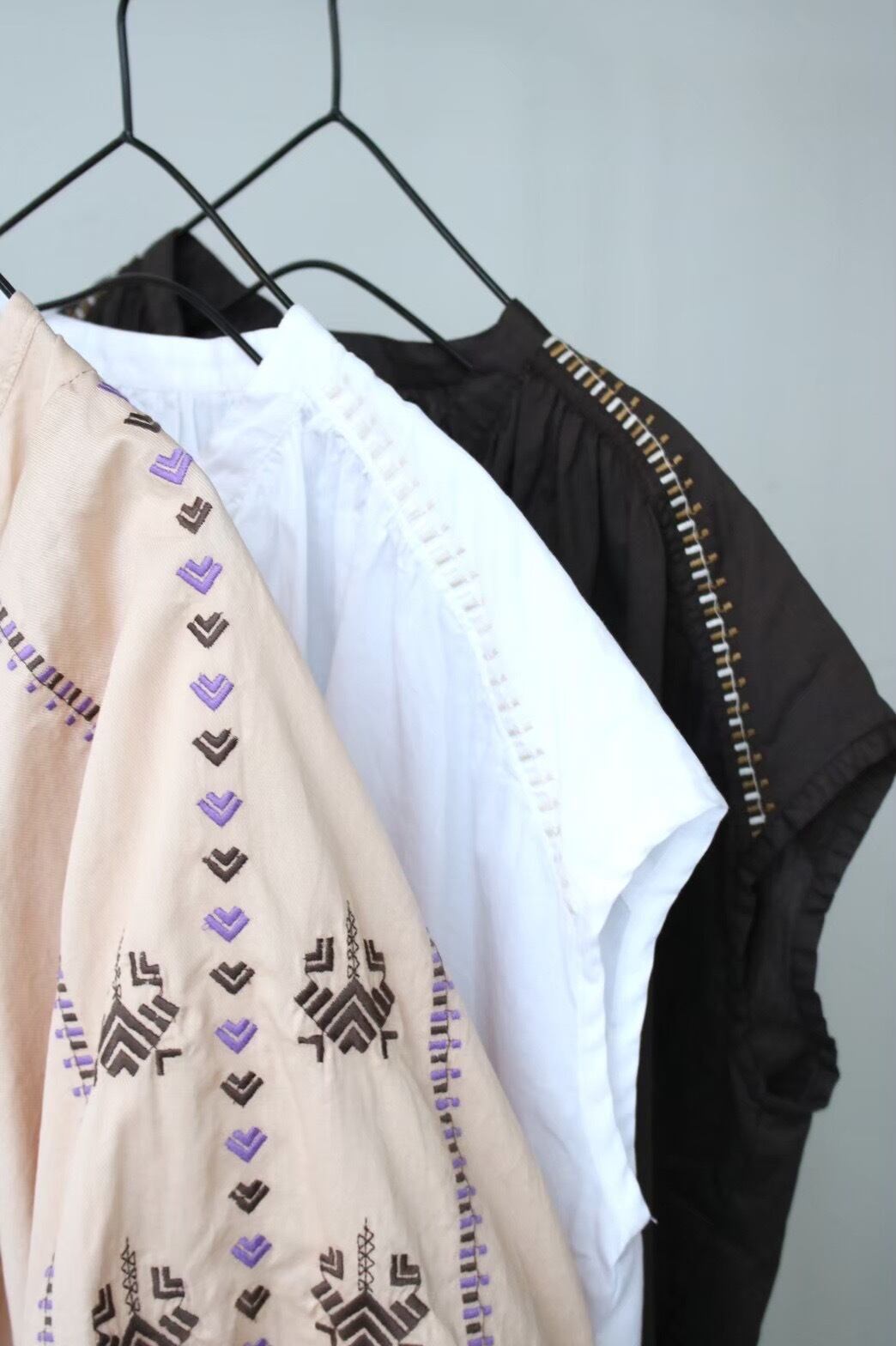 2色使いの幾何学的な刺繍をフロントと袖に施しており、ゴム入りのボリューム袖を腕まくりしても刺繍が隠れないようにレイアウトしています♫