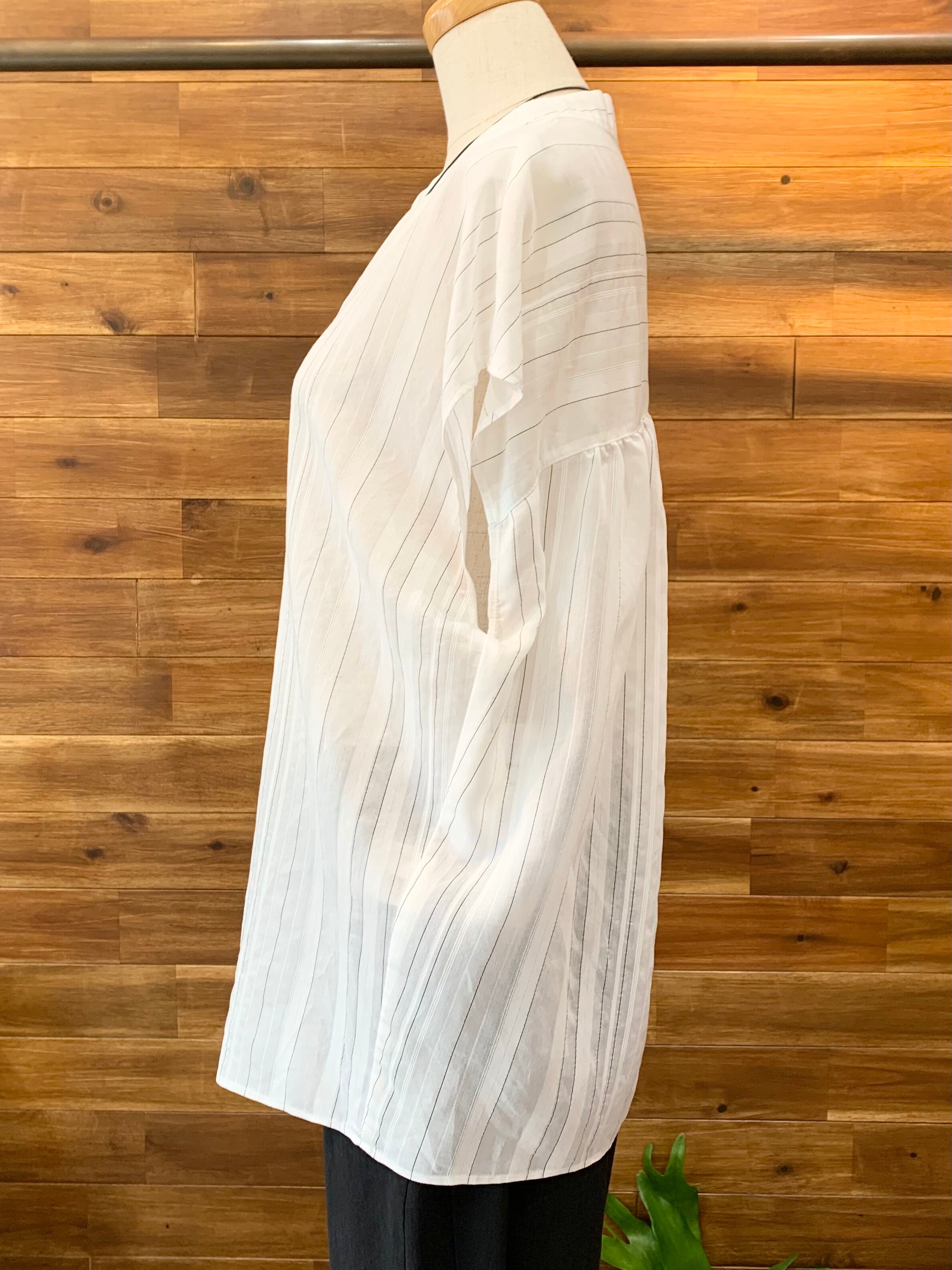 後ろヨークは縦横ストライプの切り替えに細かなギャザーと、繊細な作りで大人女子にオススメの技ありのブラウスです◎