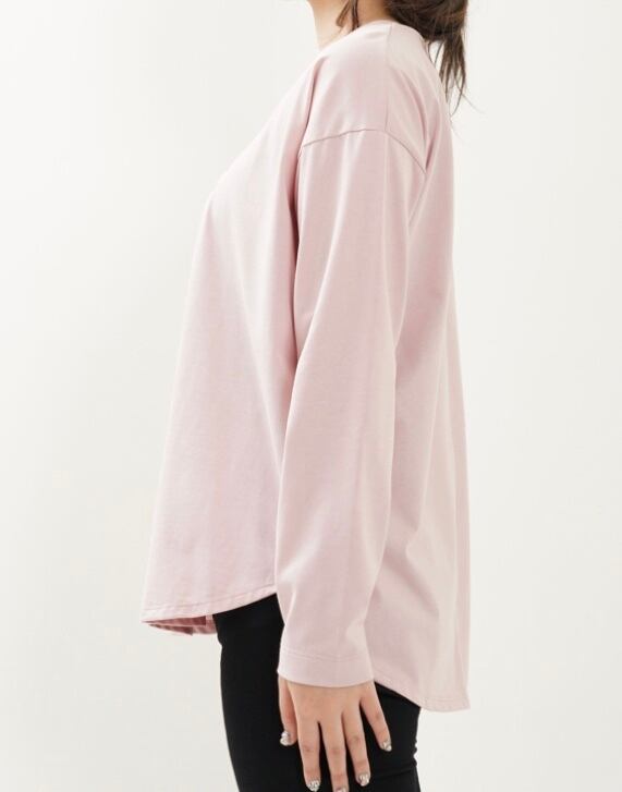 ゆるっとしたオフボディのシルエットと腰回りをカバーする長めの着丈がリラックス感を醸し出します。