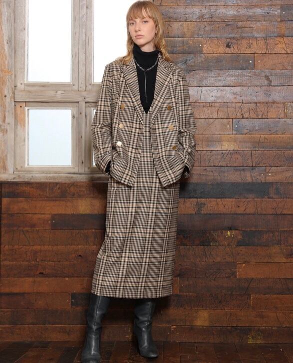 同素材のジャケットとセットアップで着られるジャンスカは、オフボディのストレートシルエットで体のラインを拾わず安心感のあるシルエット。
