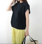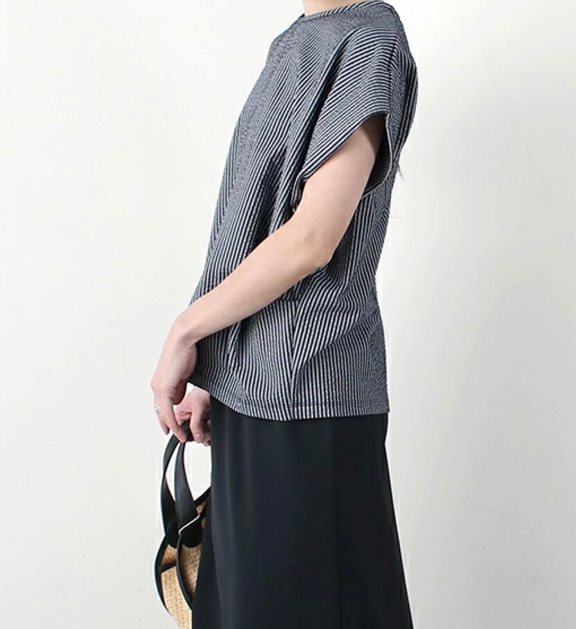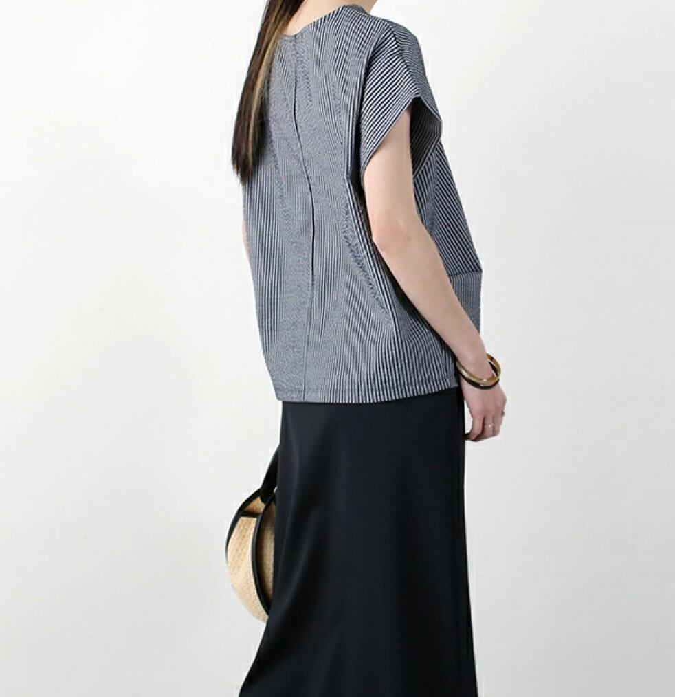 肩がすっぽりと隠れるフレンチスリーブは、袖口に折り込みタックが入り、二の腕をすっきりとカバーしてくれる嬉しいポイント。