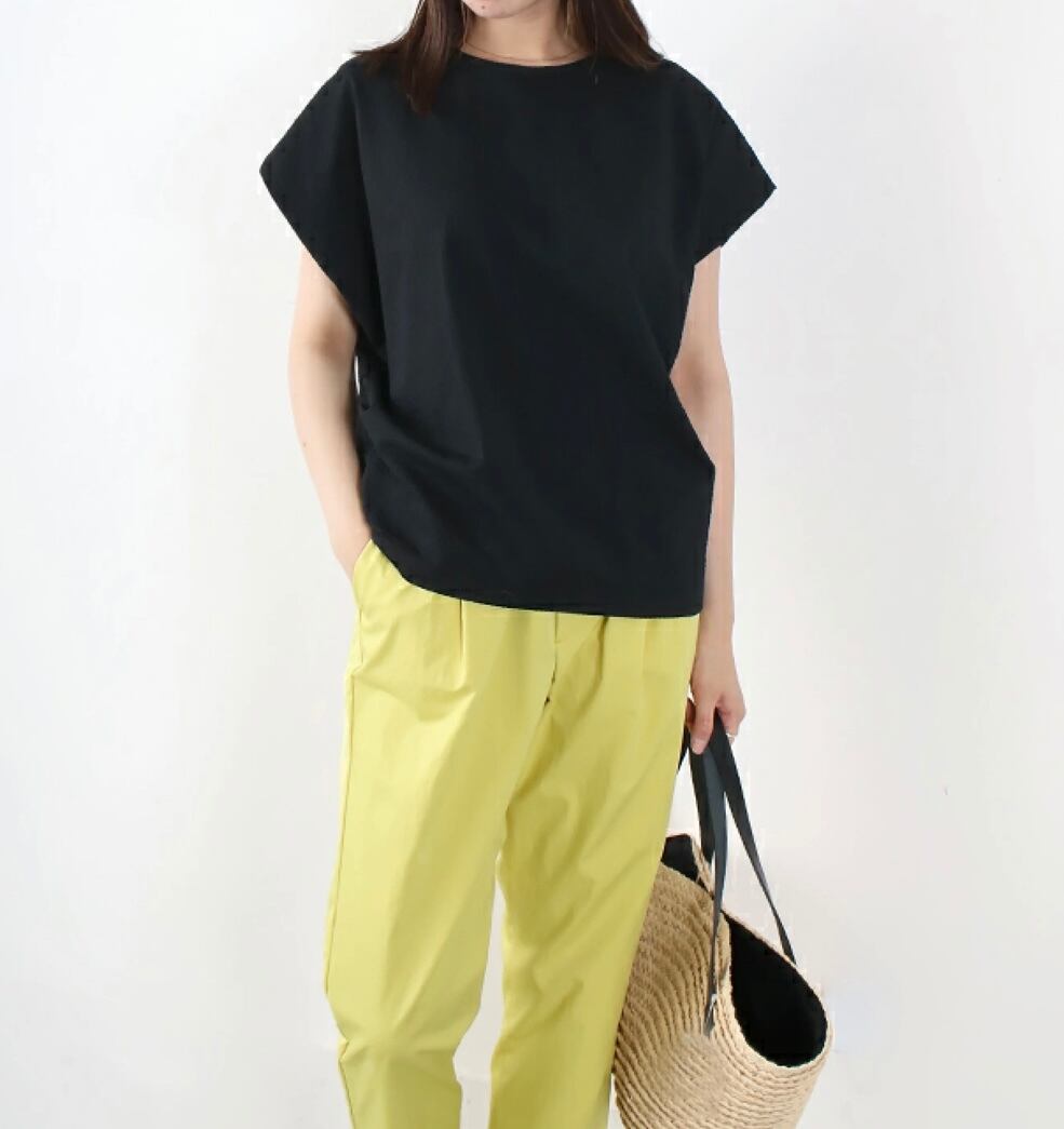 程よくゆとりあるサイズ感に前ウエストにもタックをとり、立体的で体のラインを拾いくいデザインになっています。