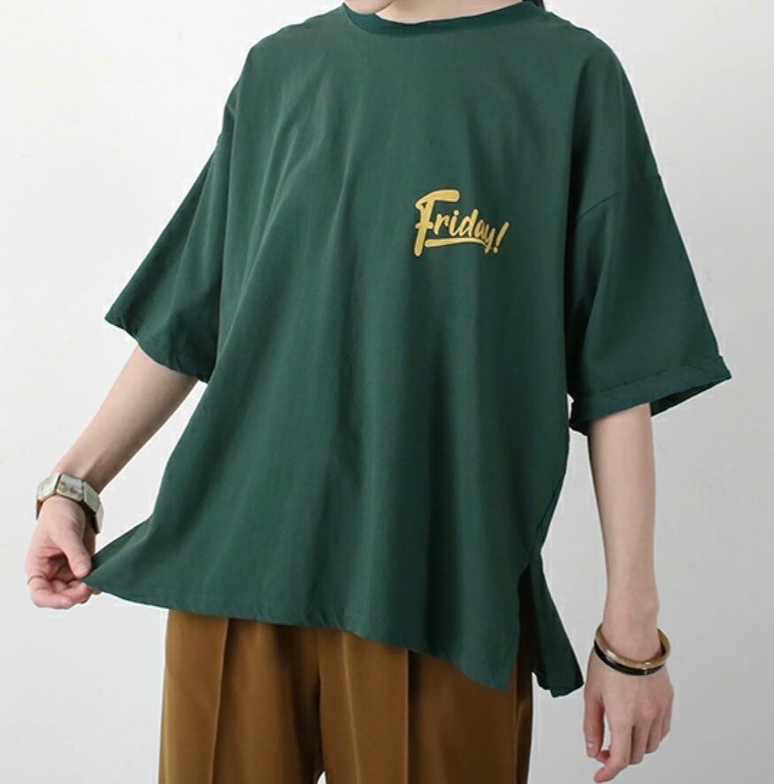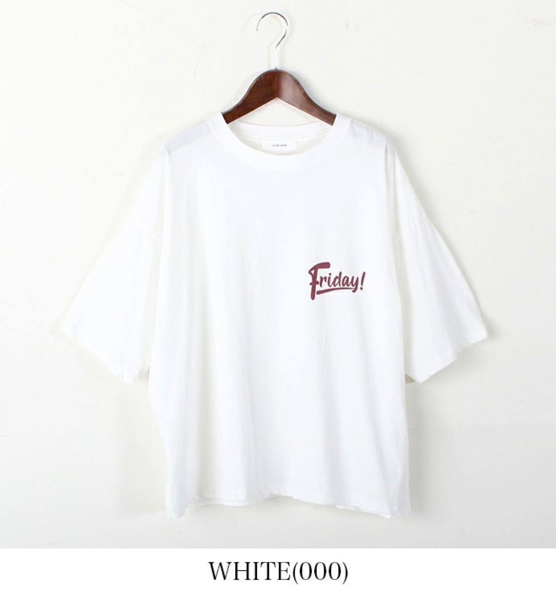 前は左胸に「Friday」、後ろは衿ぐりに沿って「WHAT ARE YOU DOING?」のカーブしたロゴデザインで、【金曜日何してる?】の意味。
