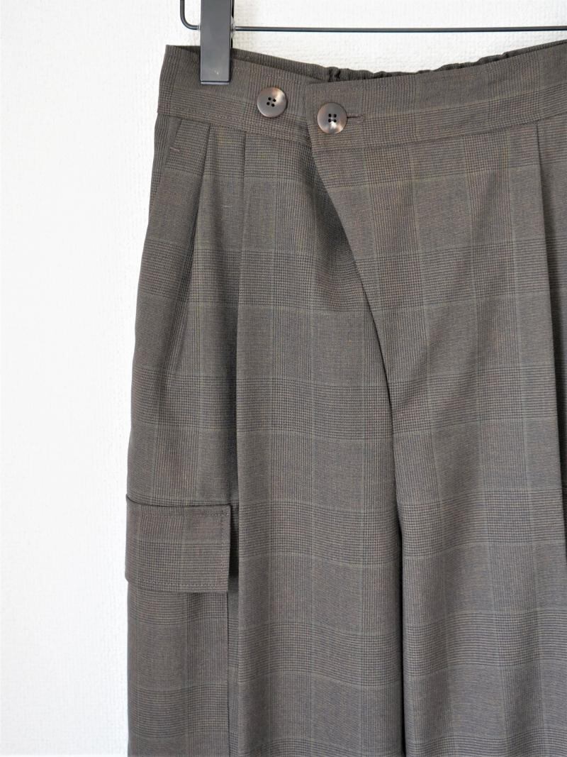 チェックのTR素材を使用した、ラップベルトタイプのパンツ。