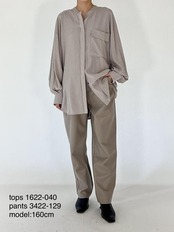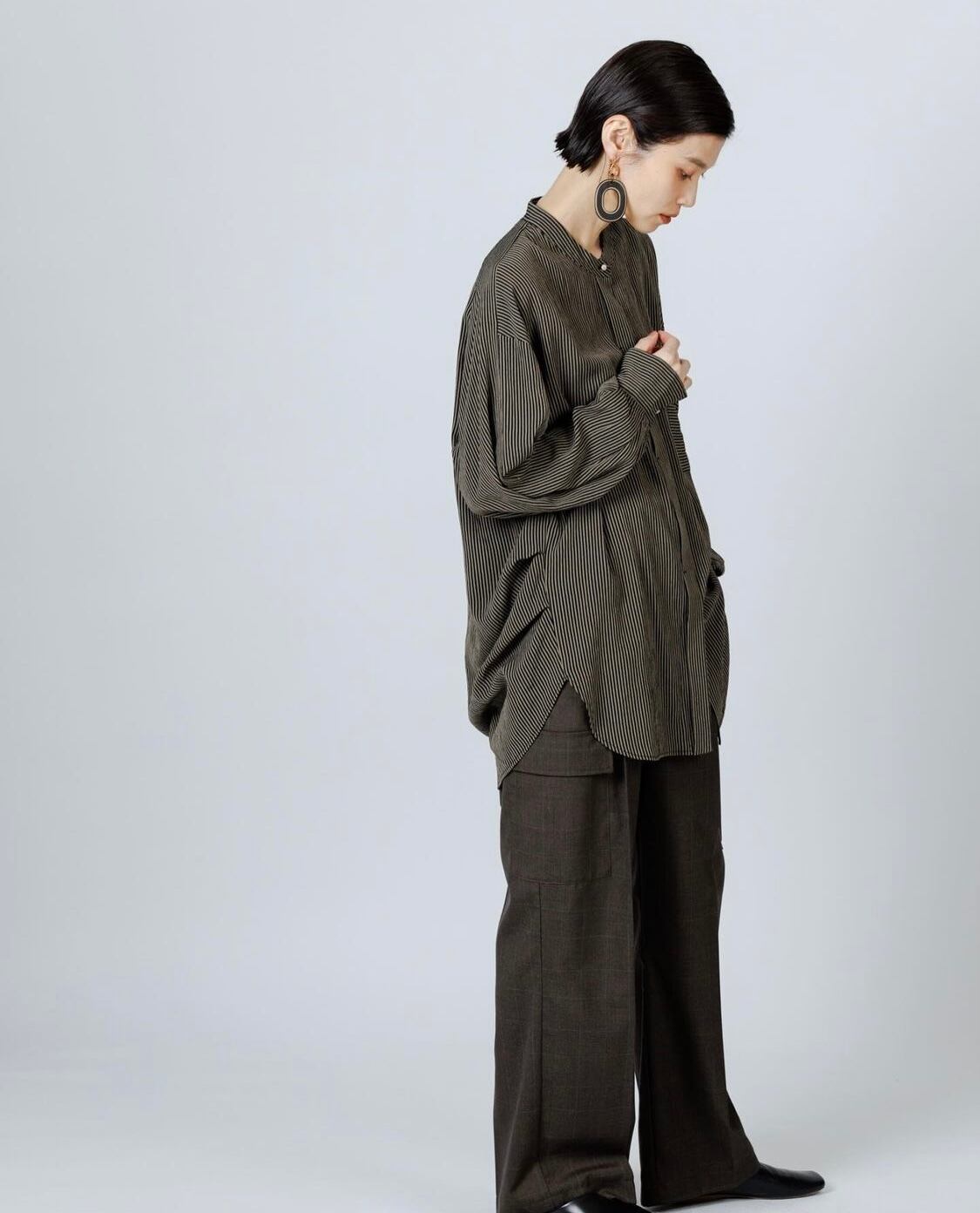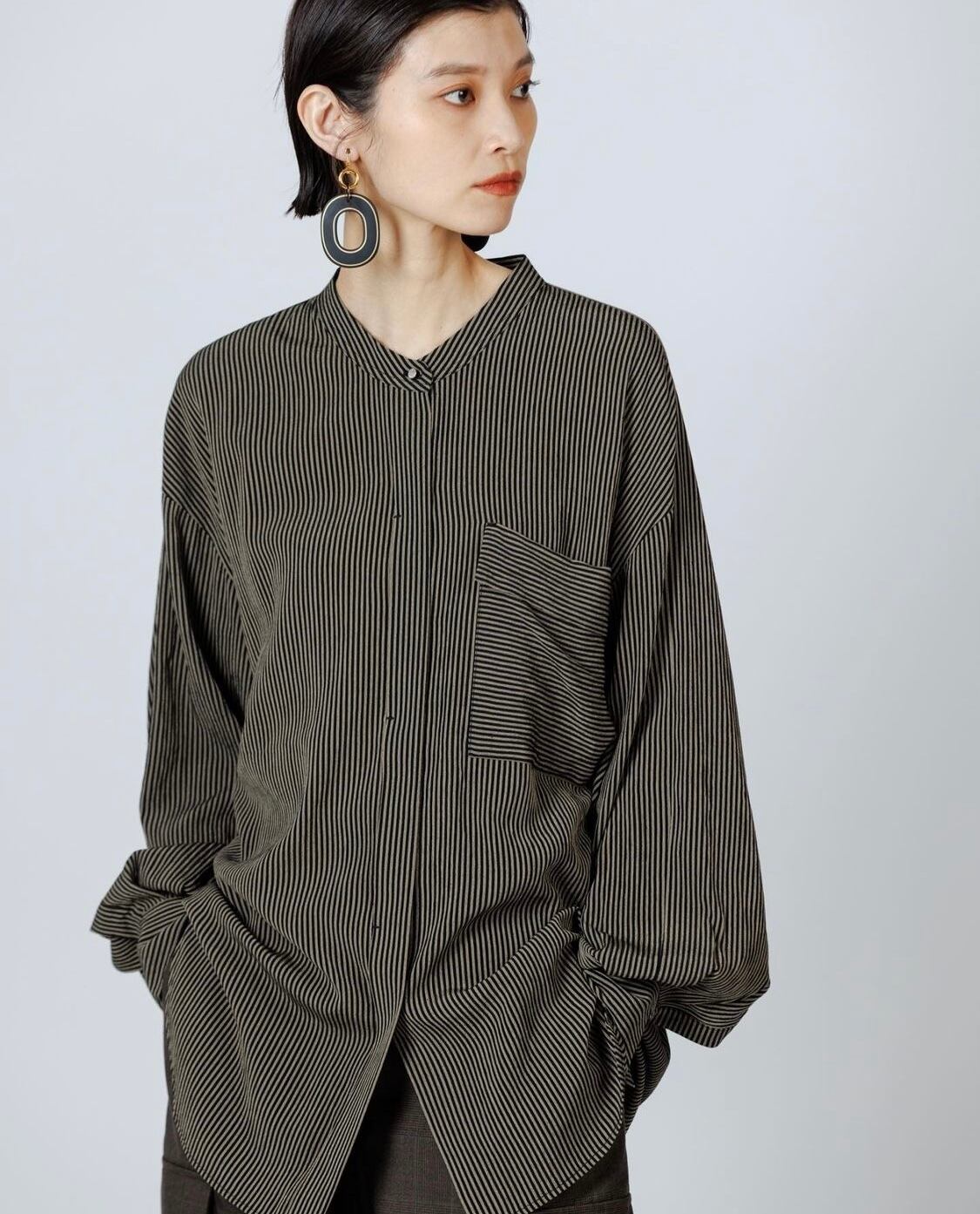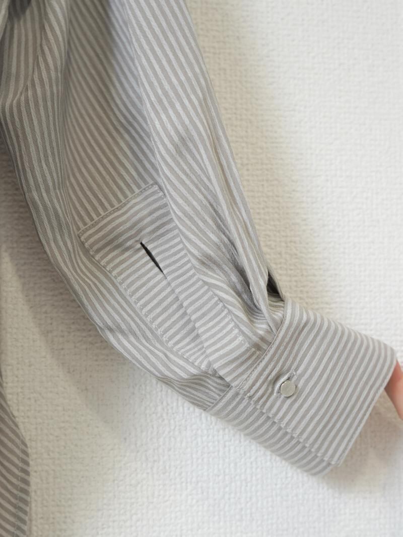 落ち感と表面感のあるストライプ生地を使用し、バックにたっぷりとタックをいれ、女性らしい程よい肌見せデザインを施した、バックシャンなシャツアイテムです♪
