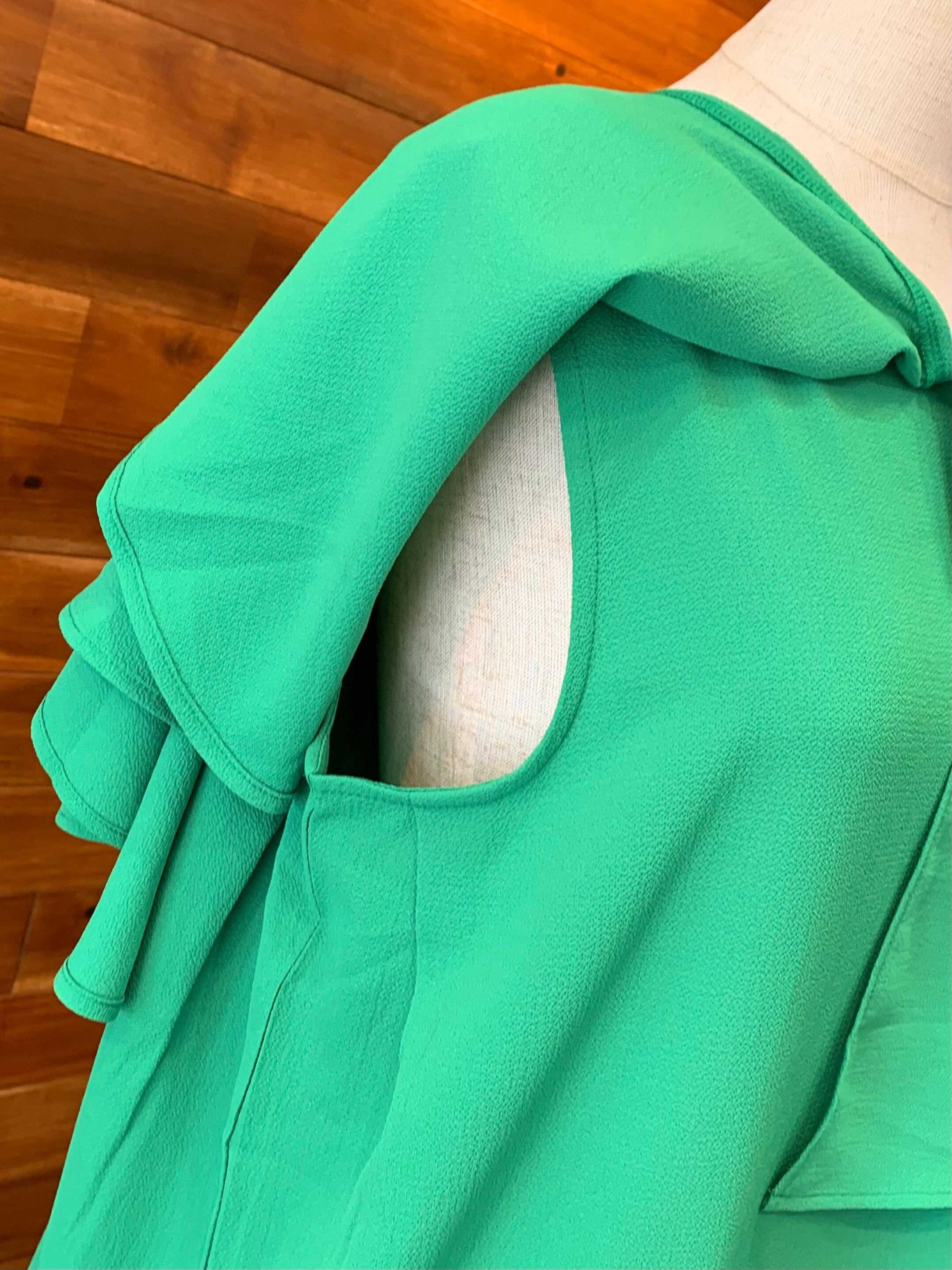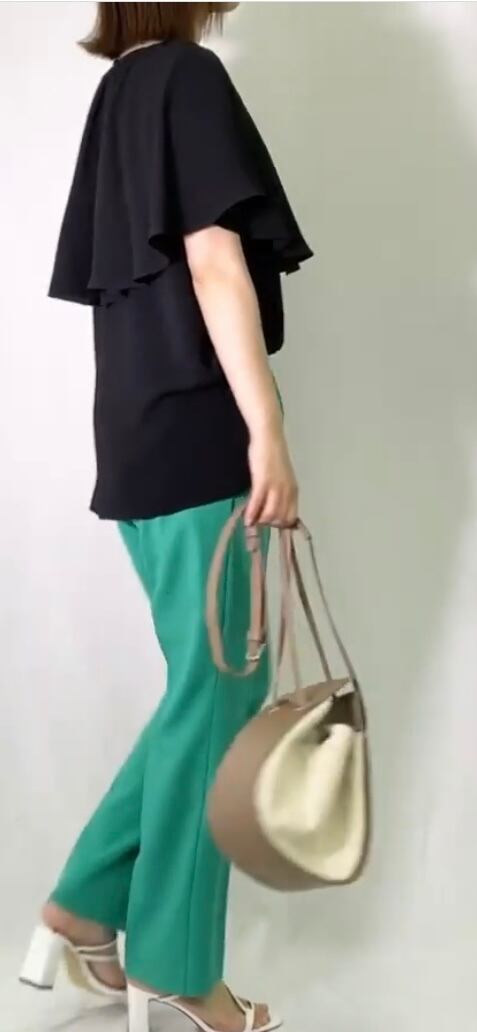 ケープデザインの襟元に細かなギャザー、後ろにはループボタン♪ 前後中央にスリットが入っています。