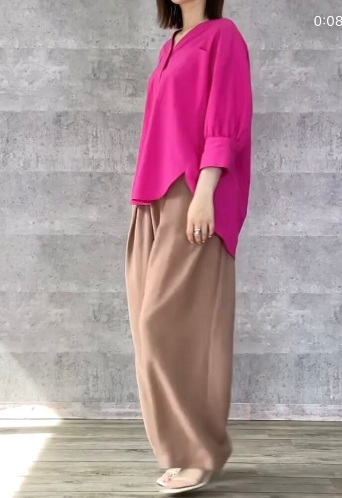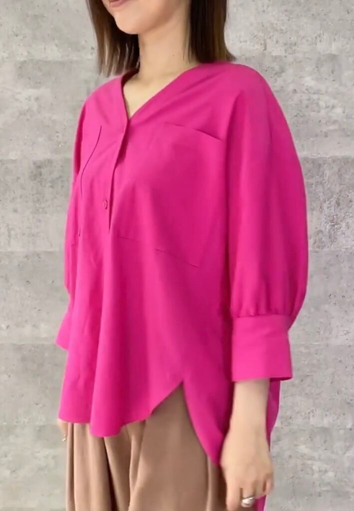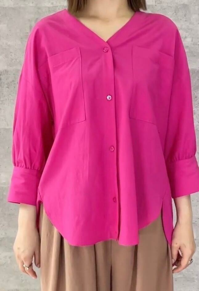 デコルテラインがすっきり見えするVネックで前開き、羽織りとしてもお使い頂けます◎