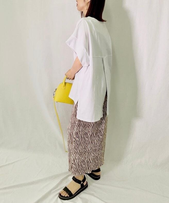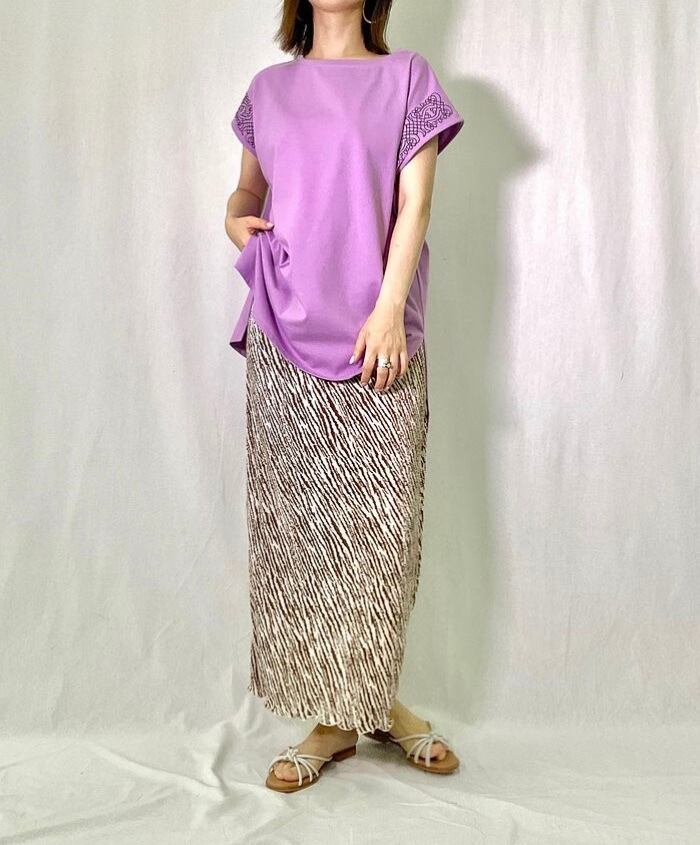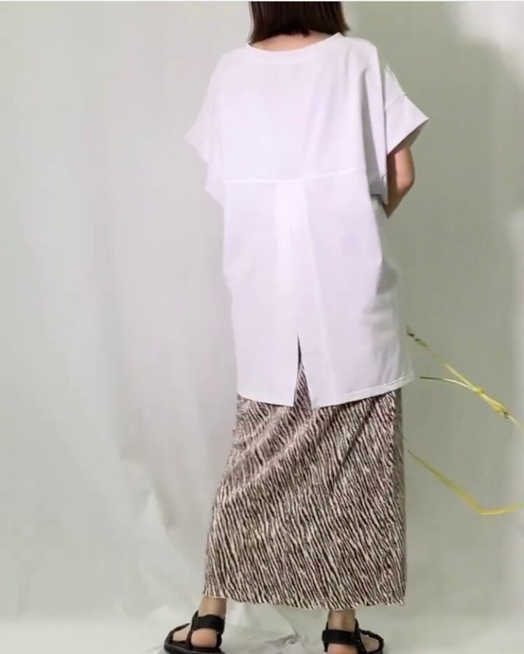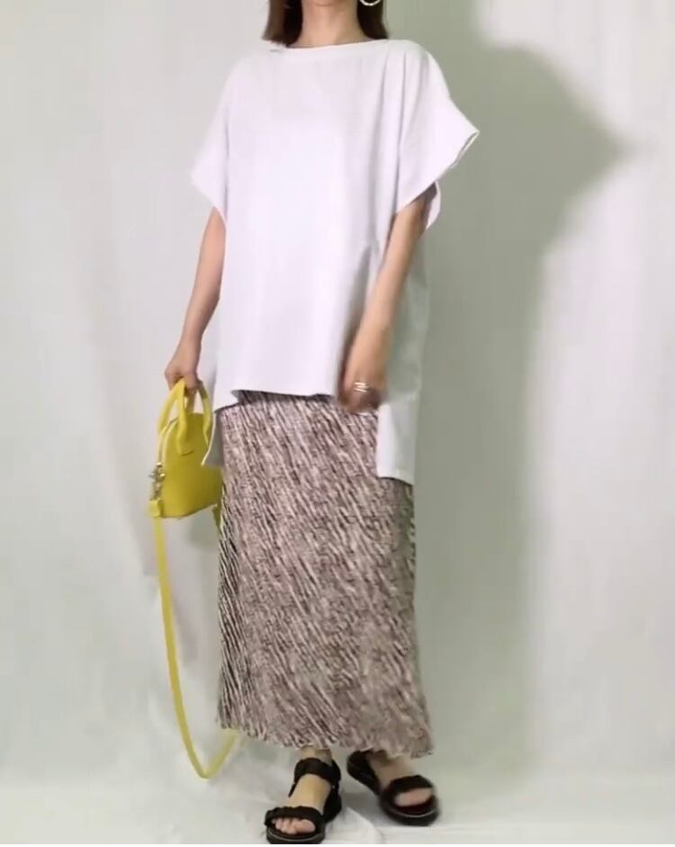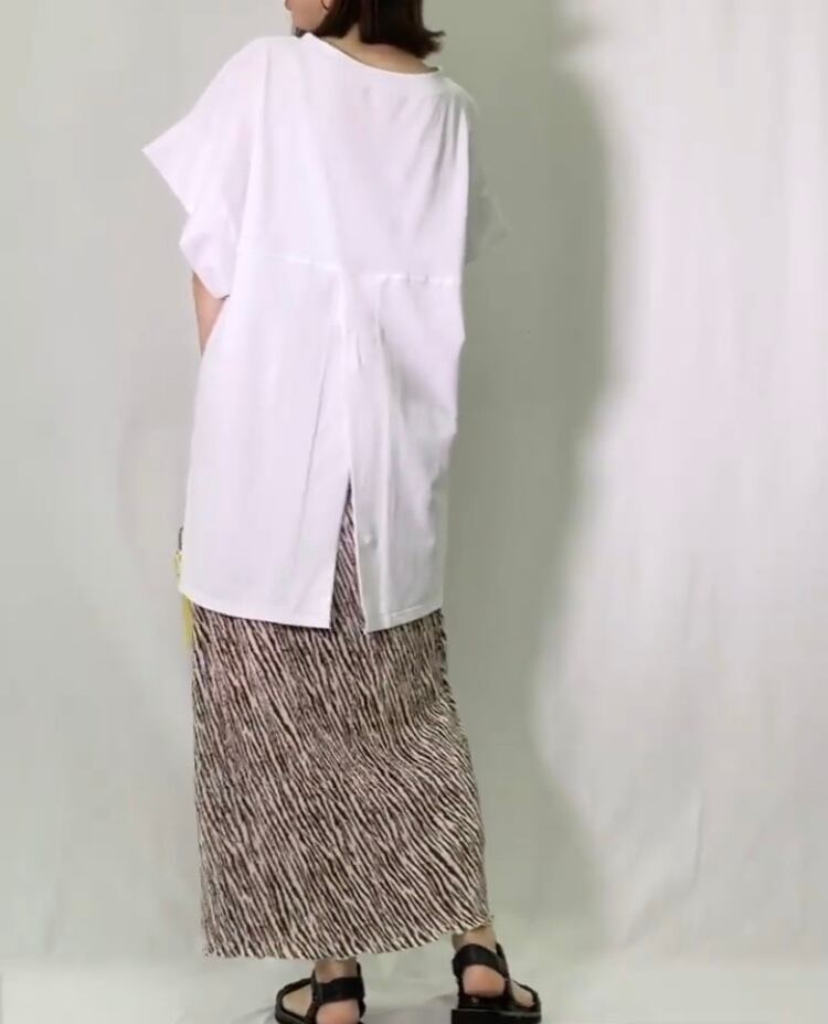 すっきりとしたストレートラインながら、プリント柄とプリーツの効果で身体のラインを拾いにくく、細見え効果も抜群です◎
