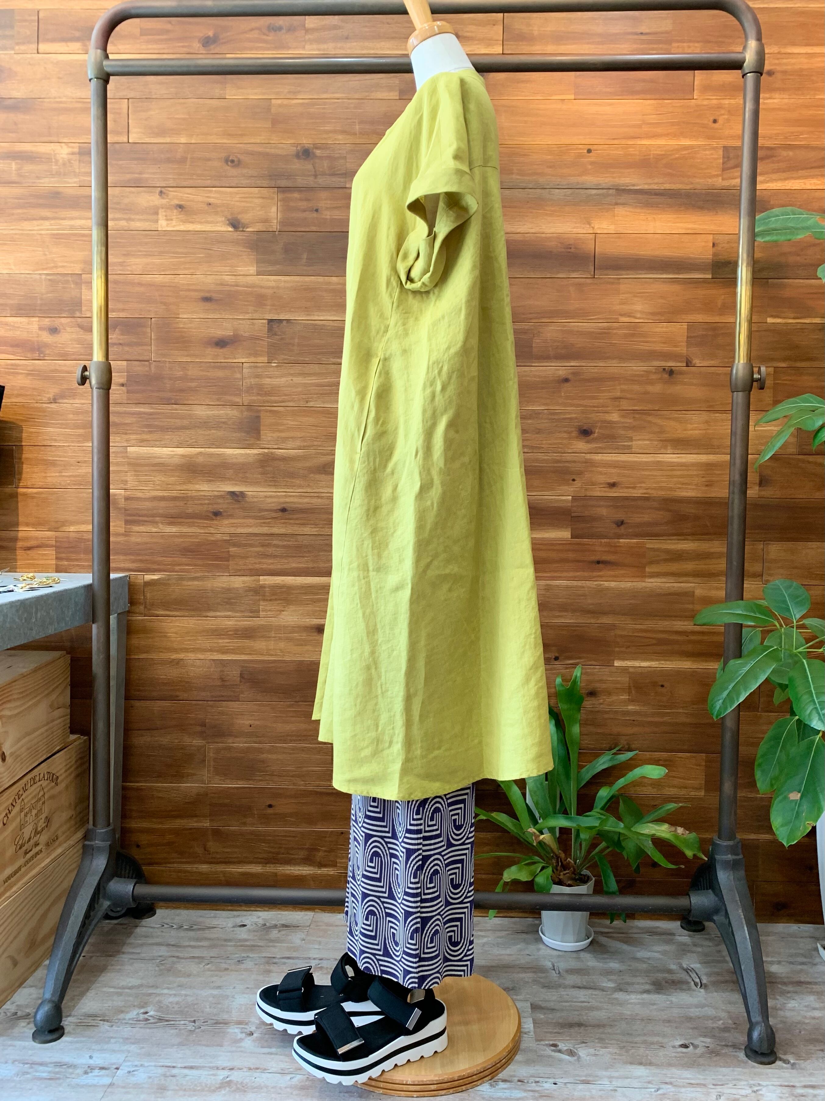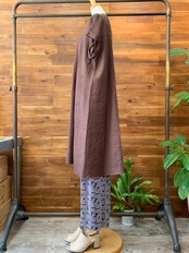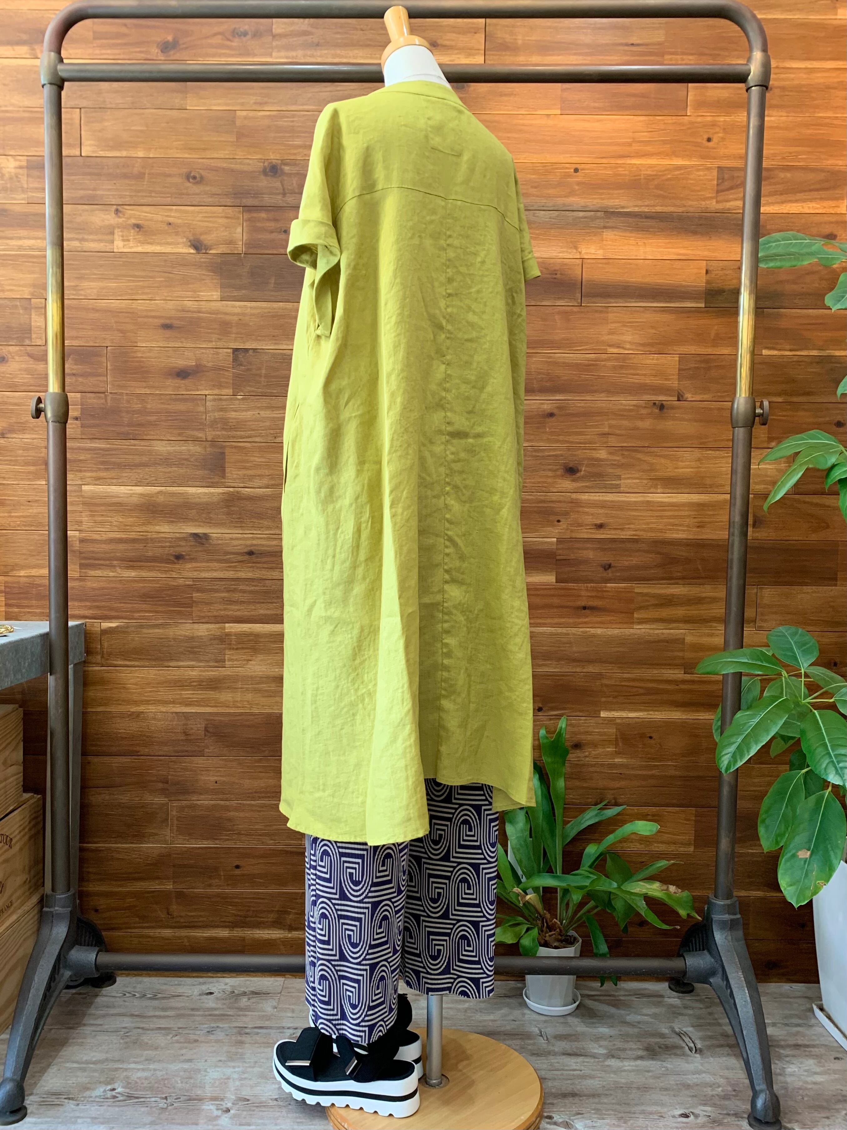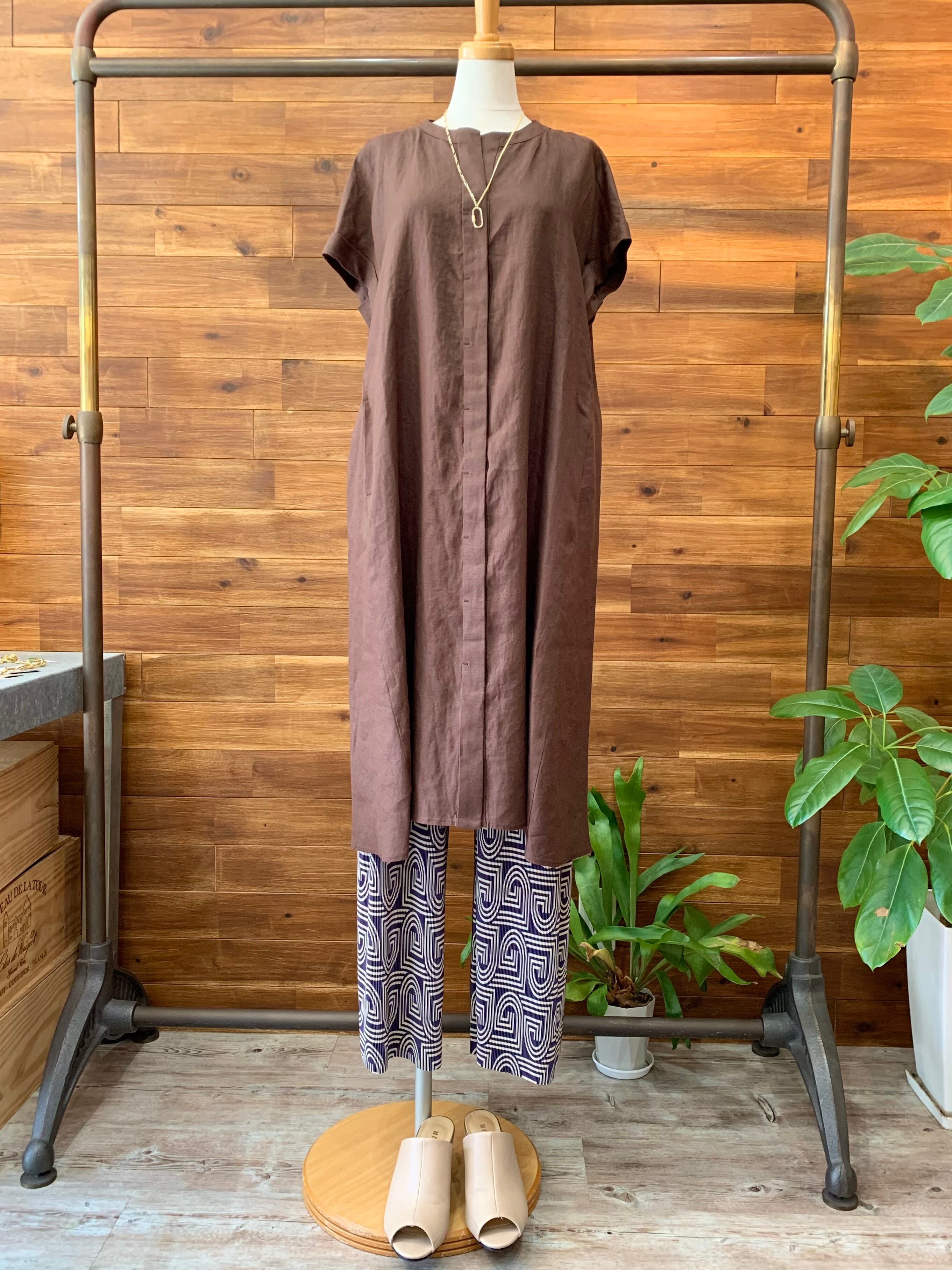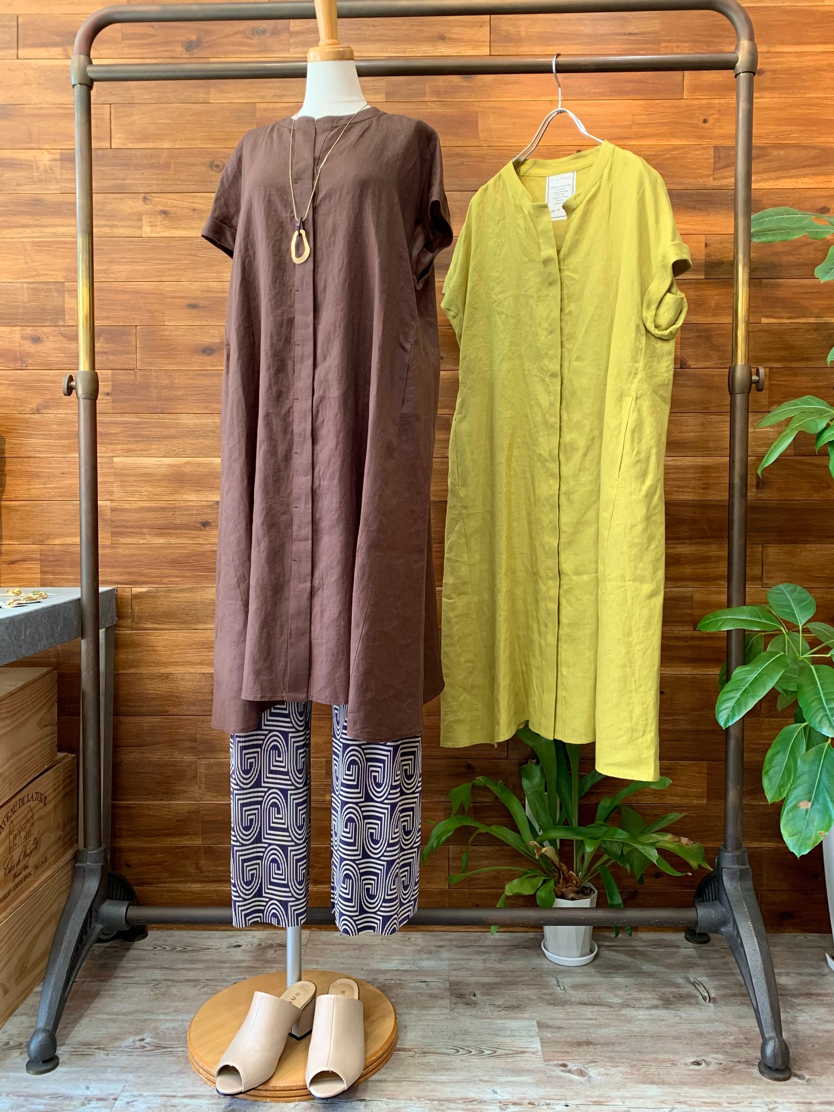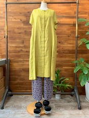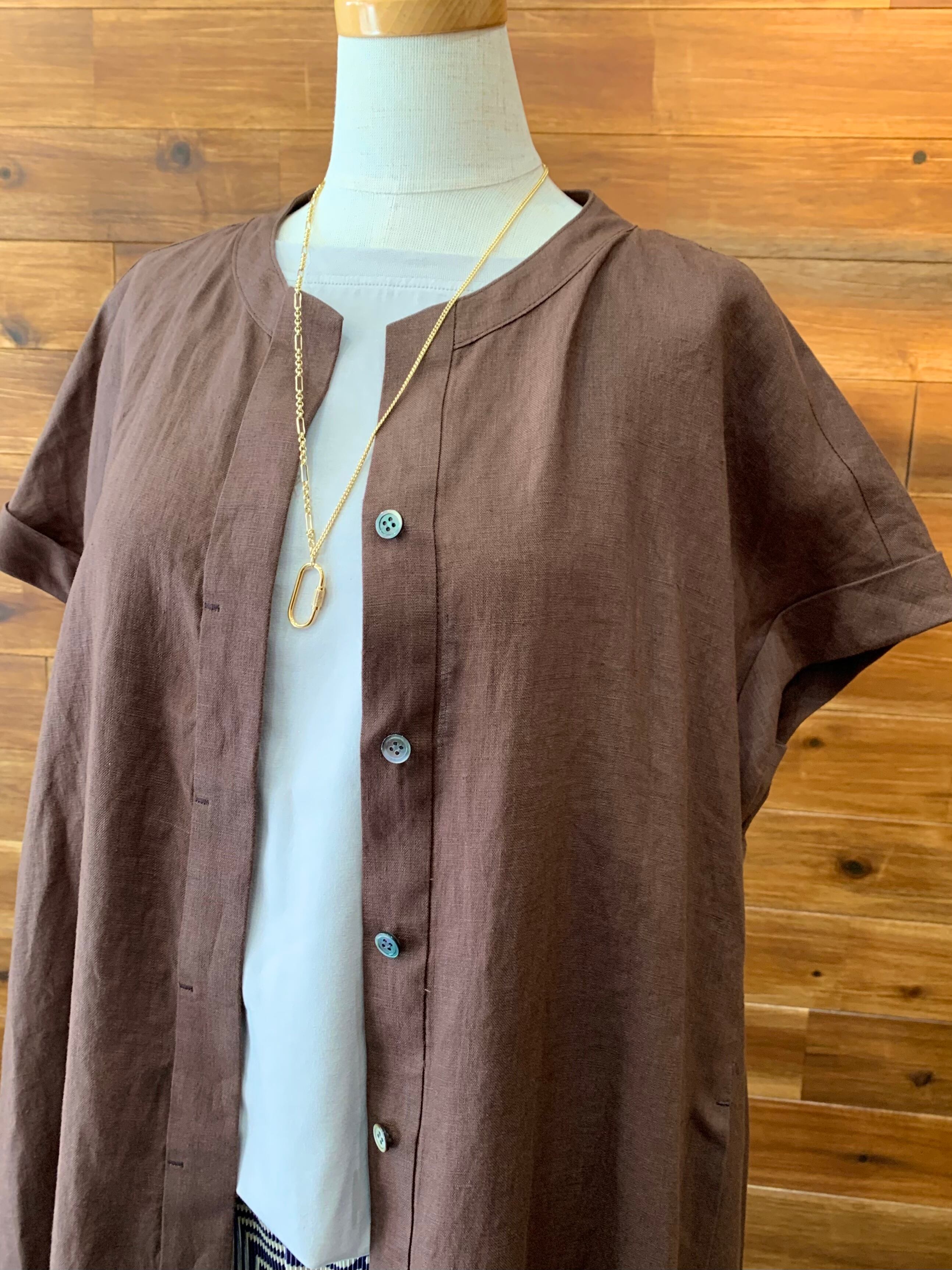 選りすぐりのフレンチリネン100%の涼しい素材で、フロントは比翼ボタン、袖に折り返しのデザイン、脇は添え布で一枚で着ても脇が見えないようになっています。