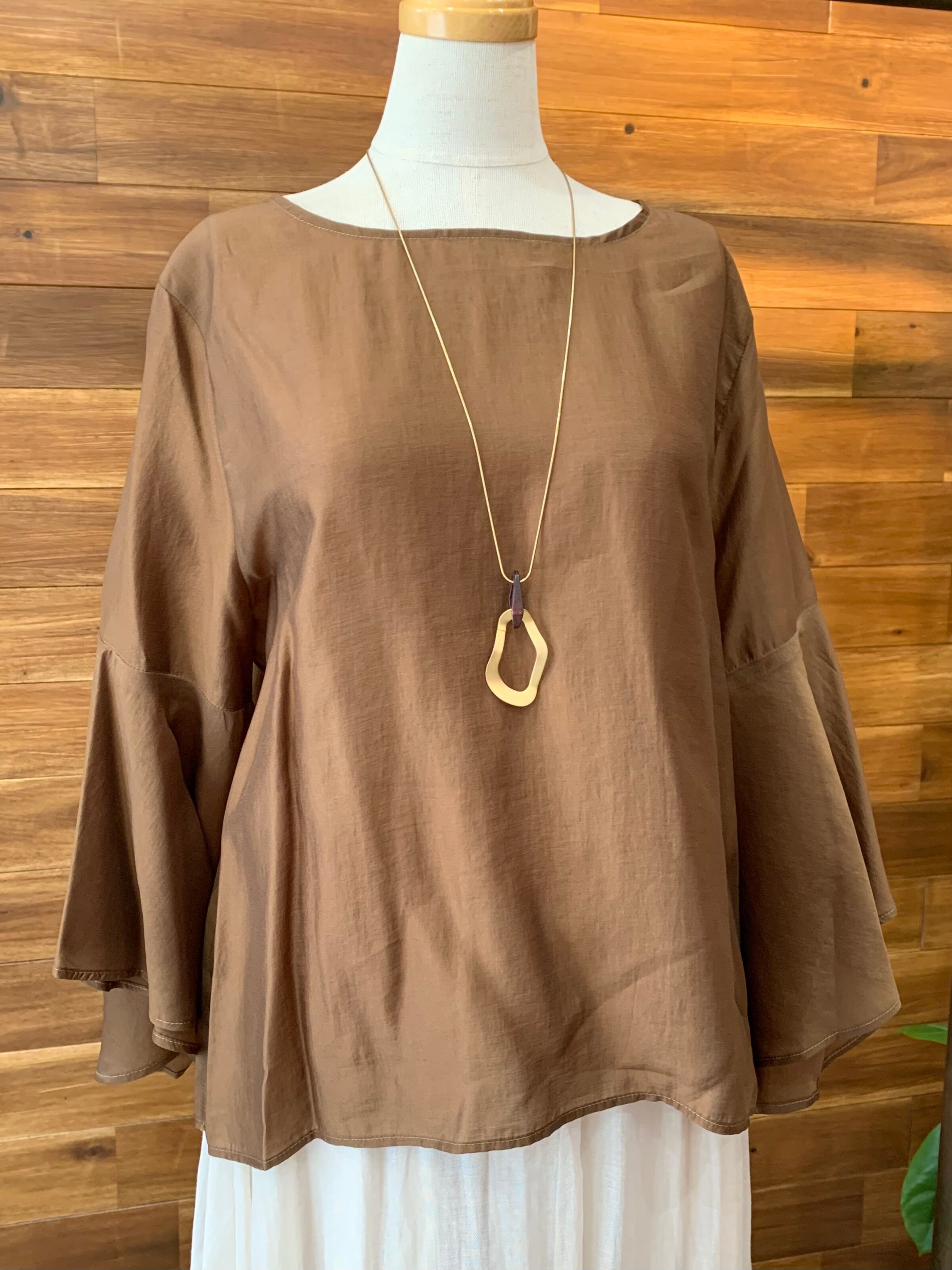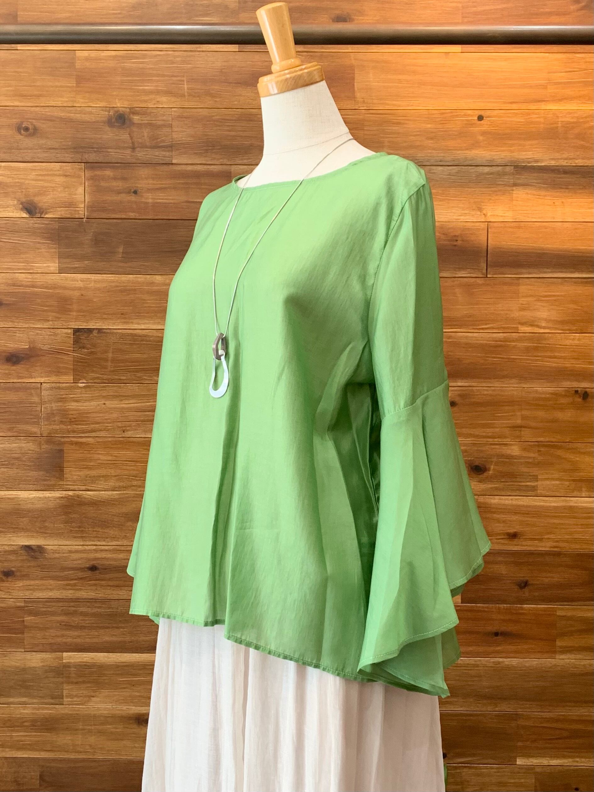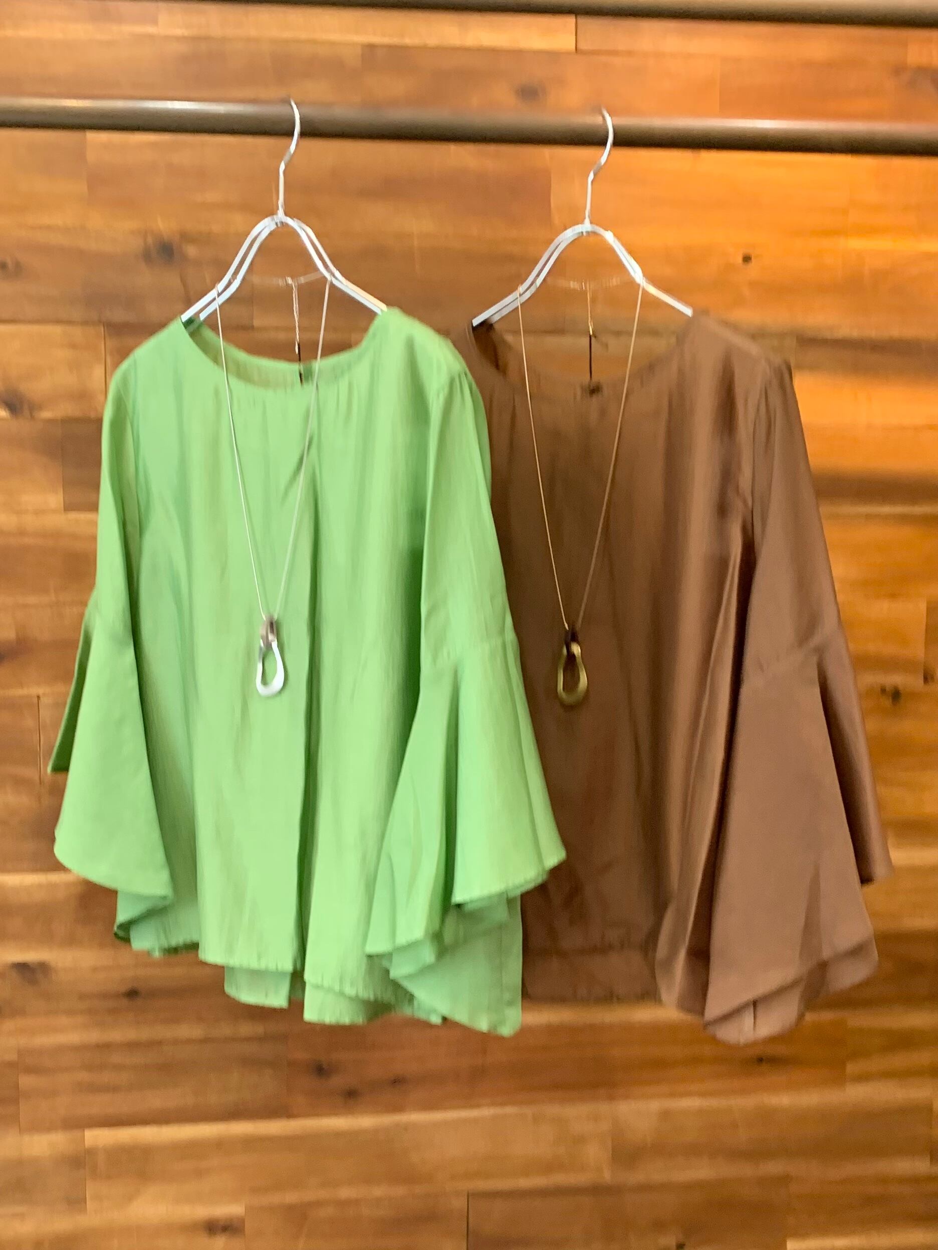 光沢感のあるシルクのような風合いの素材がオシャレなベルスリーブブラウス♪