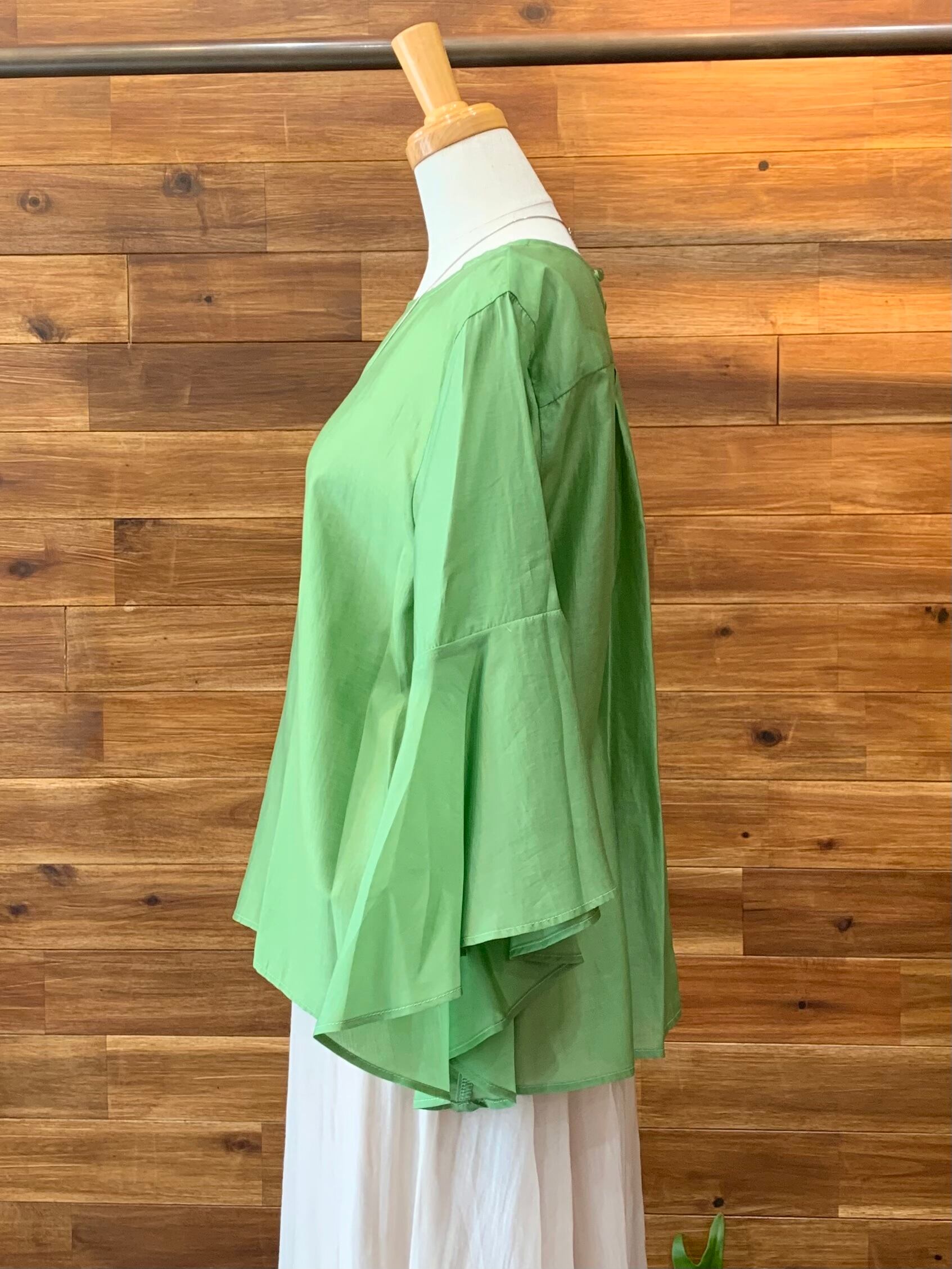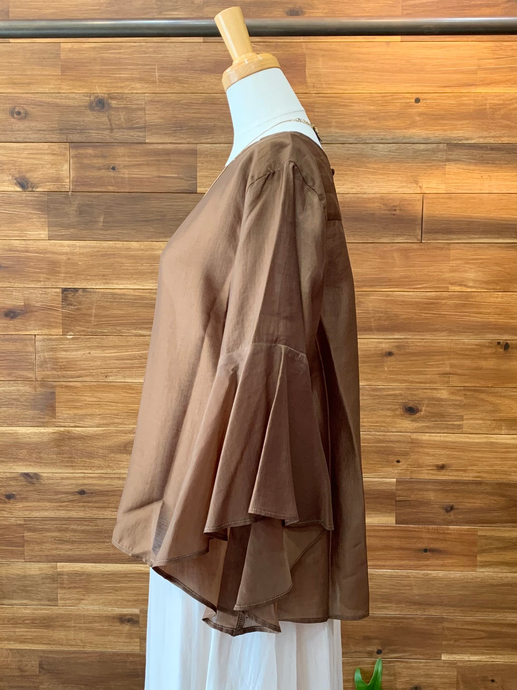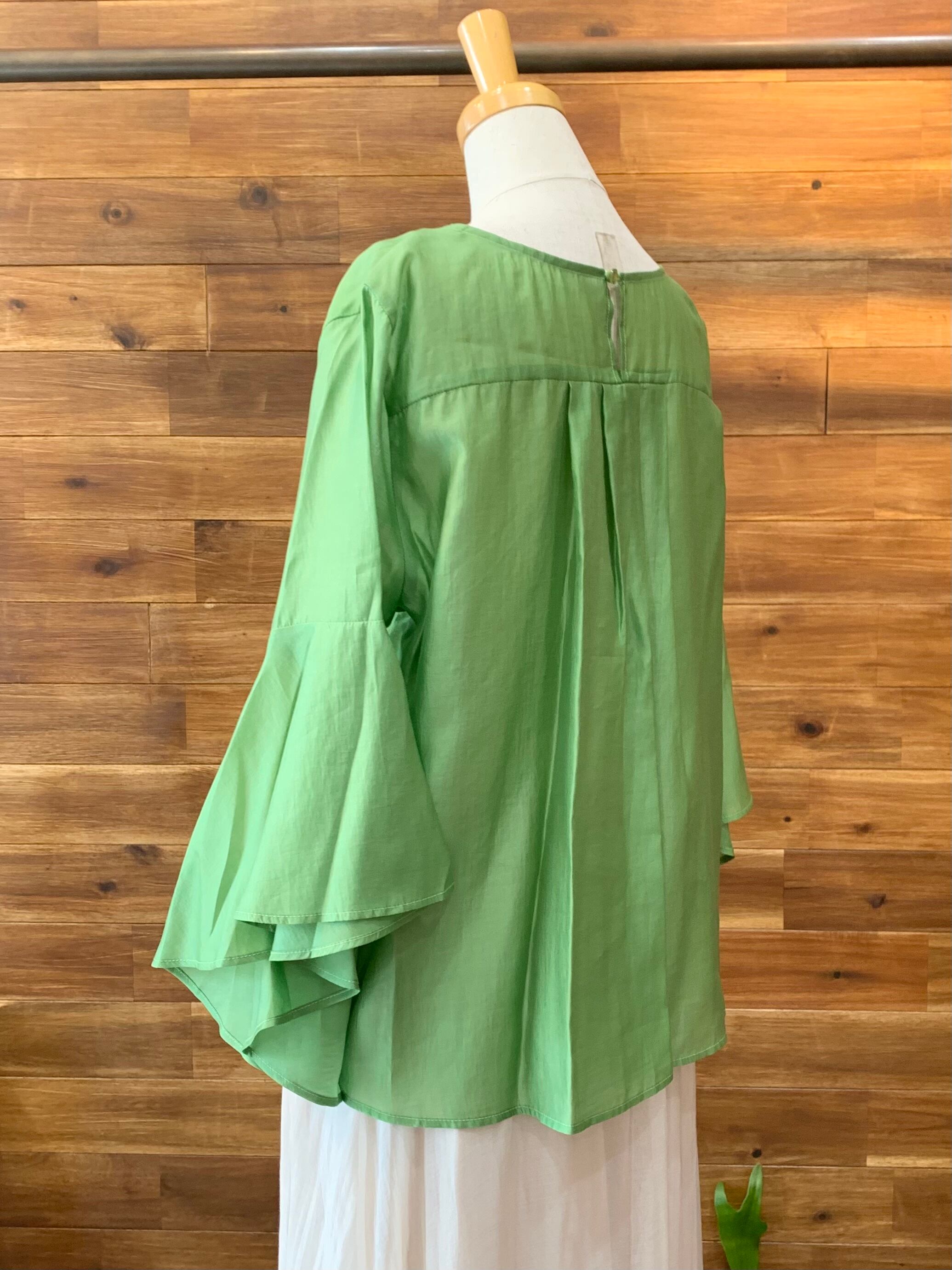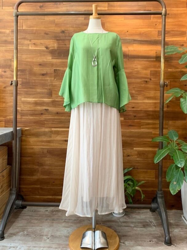 光沢感のあるシルクのような風合いの素材がオシャレなベルスリーブブラウス♪
