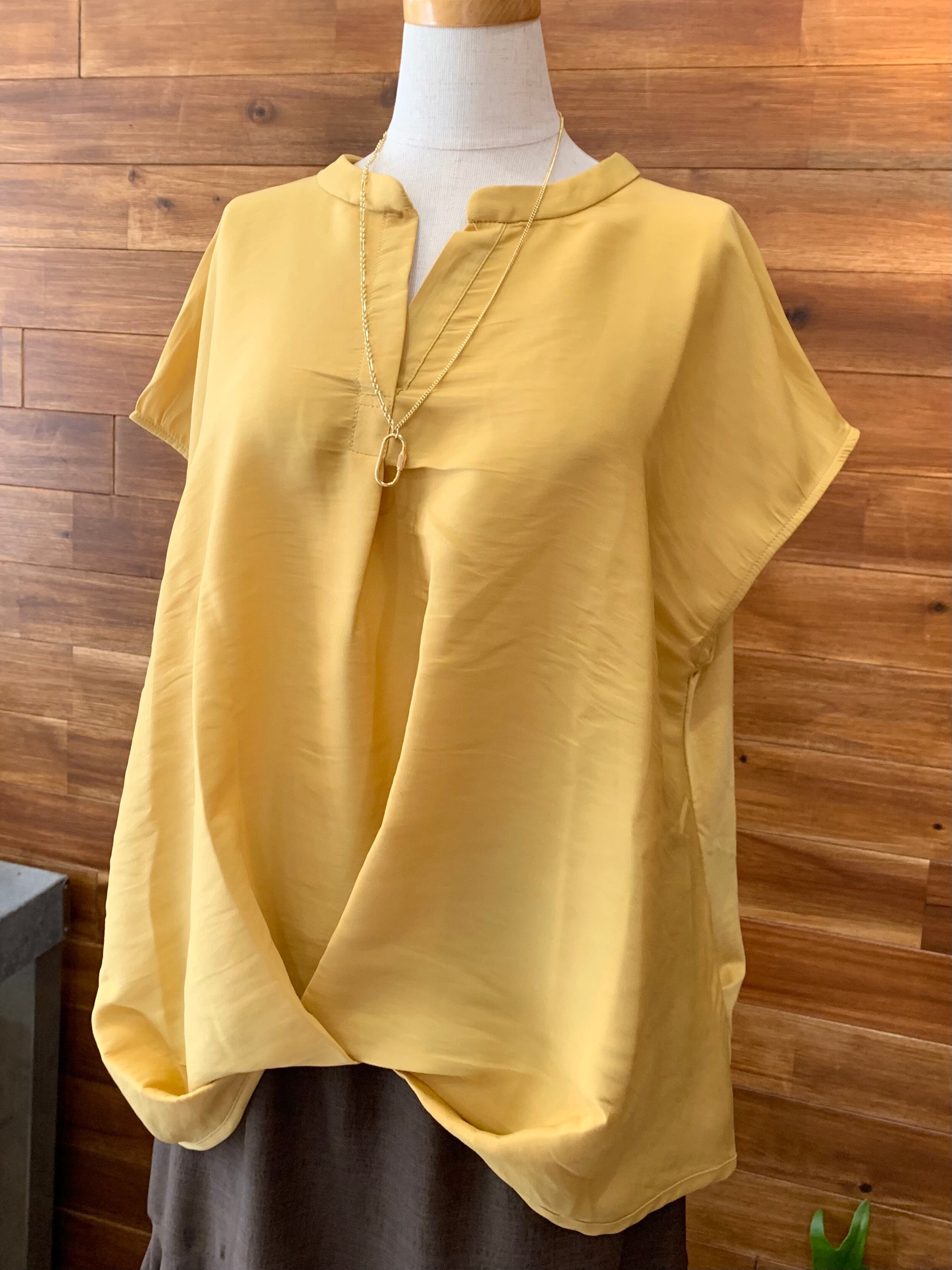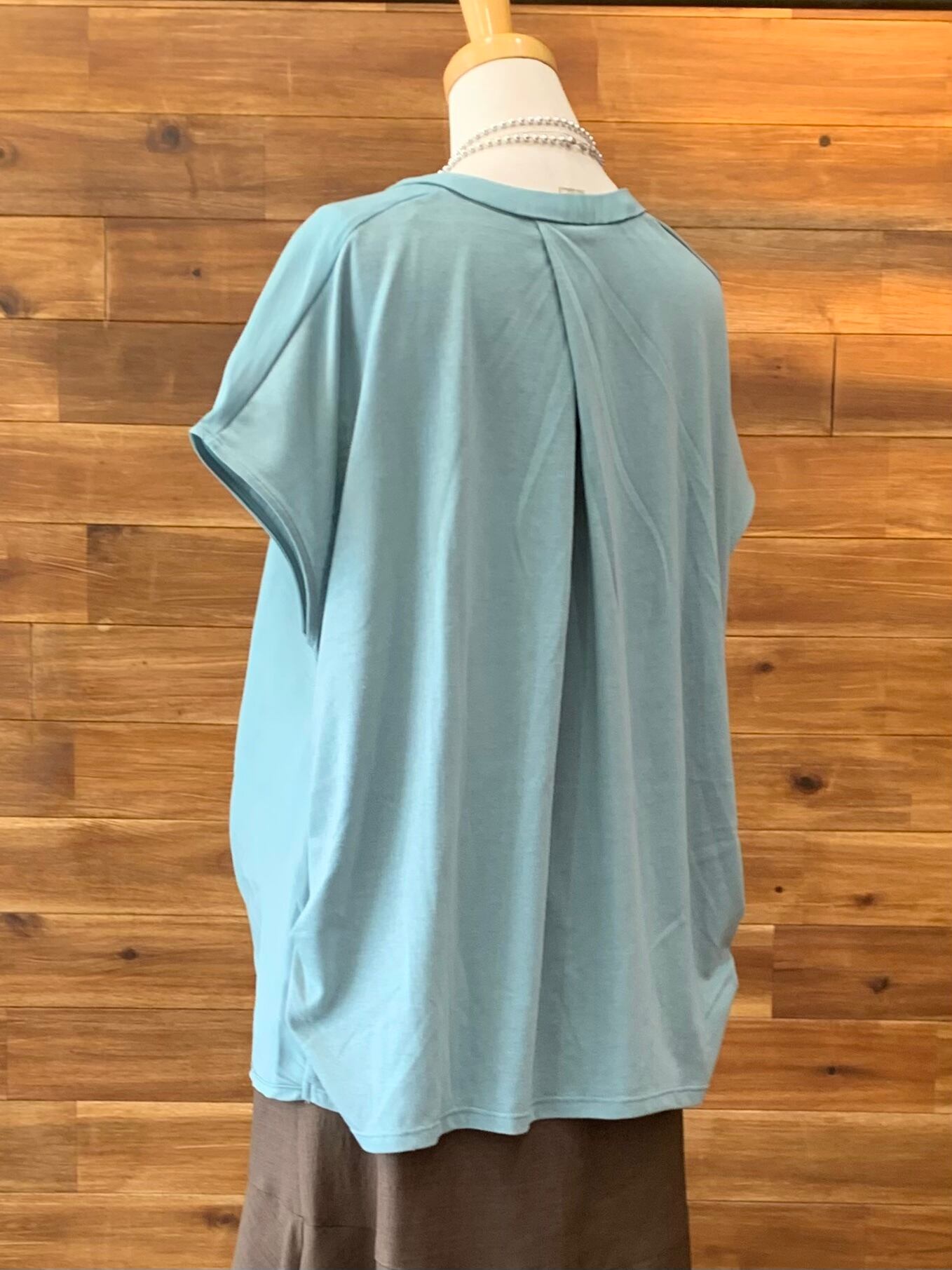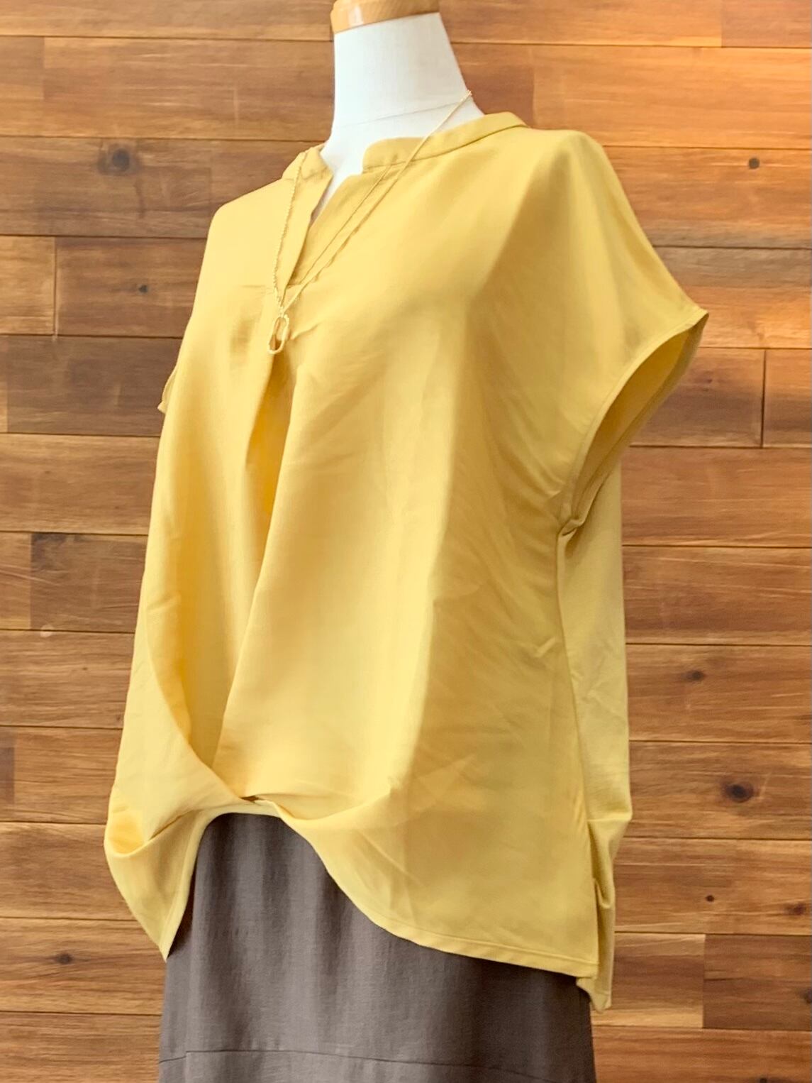 バンドカラーVカットの襟元とフレンチスリーブが涼しげで、スッキリ見え効果抜群◎