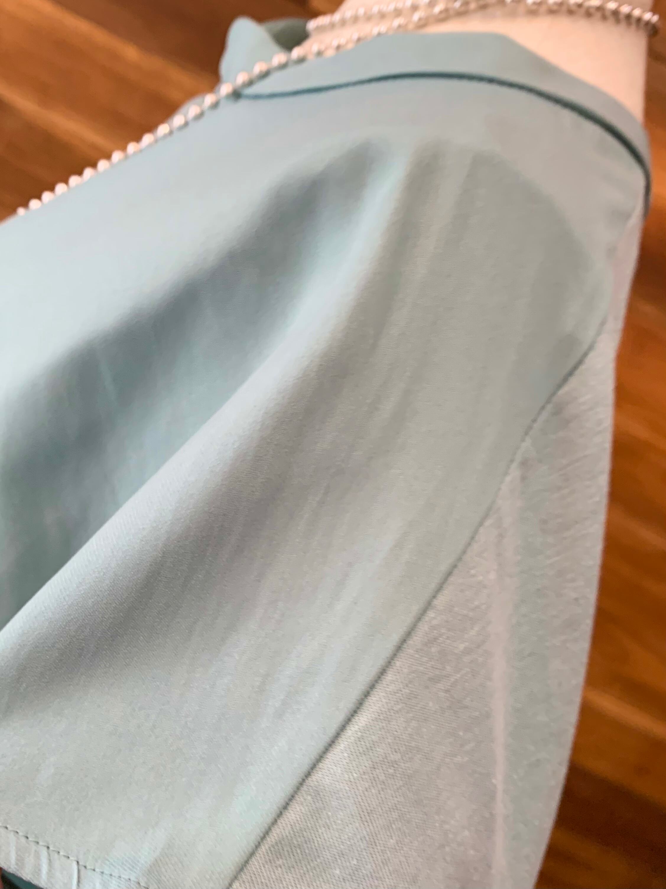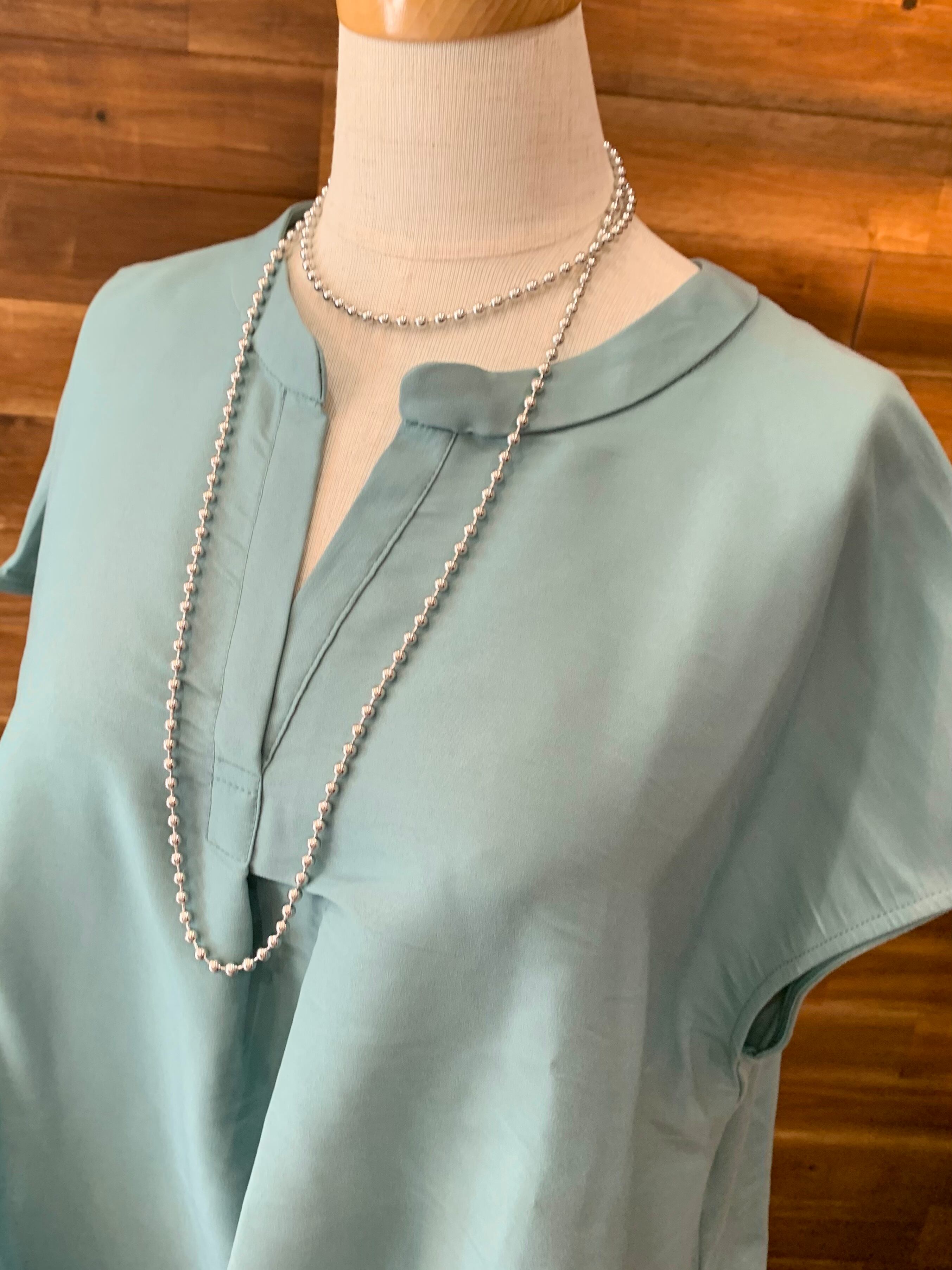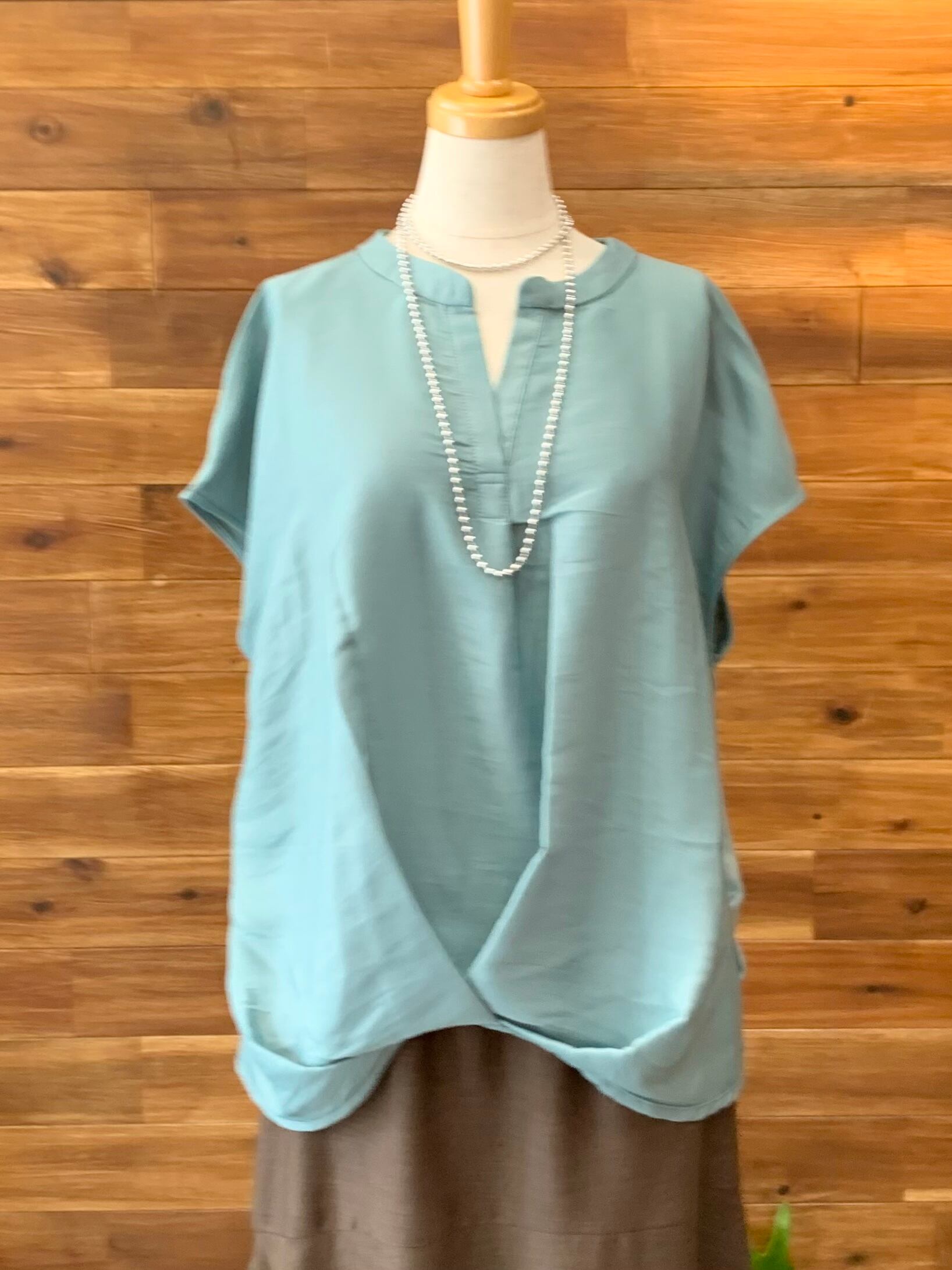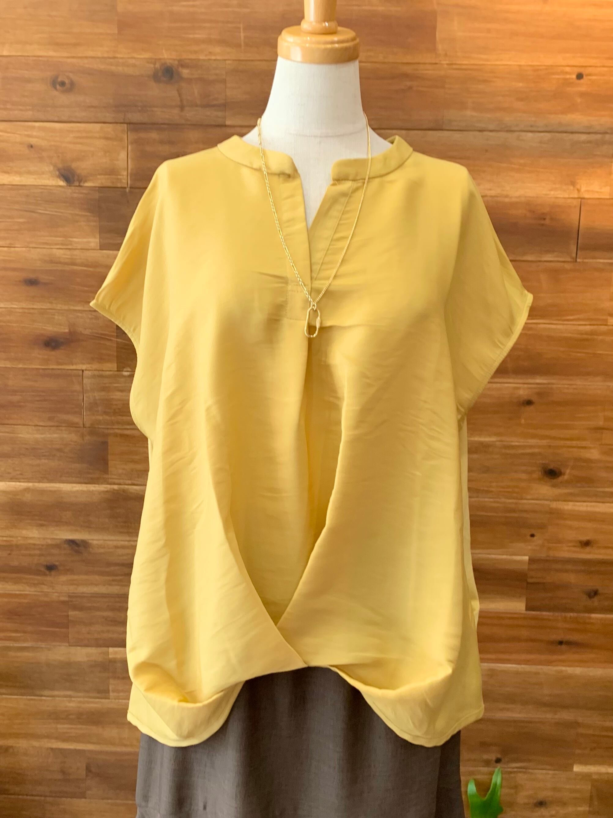 バンドカラーVカットの襟元とフレンチスリーブが涼しげで、スッキリ見え効果抜群◎