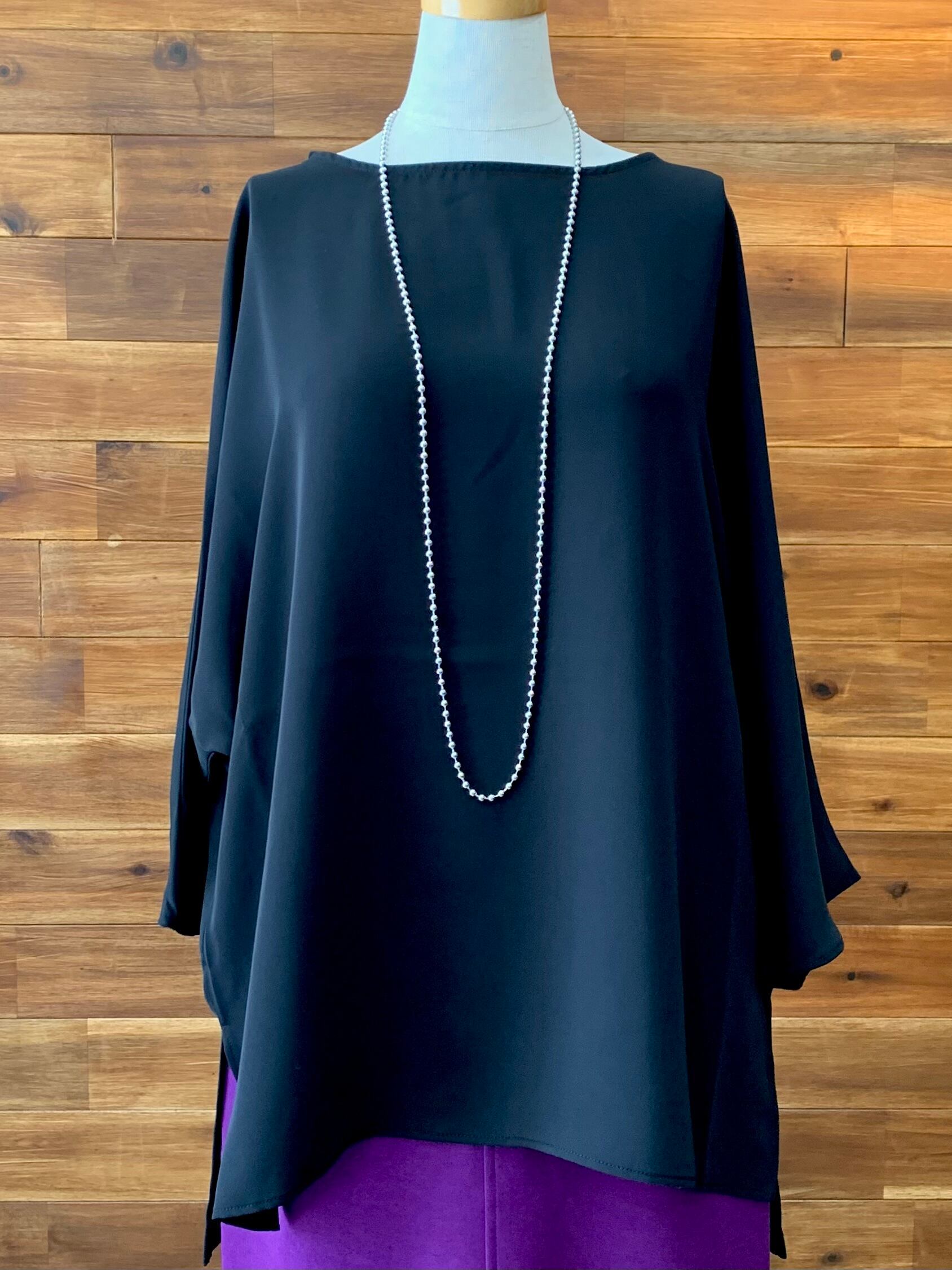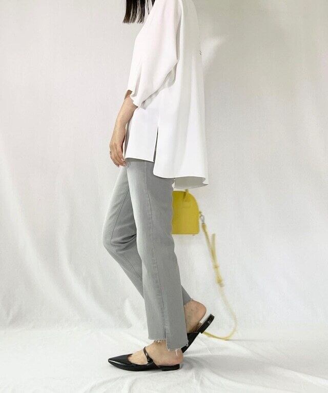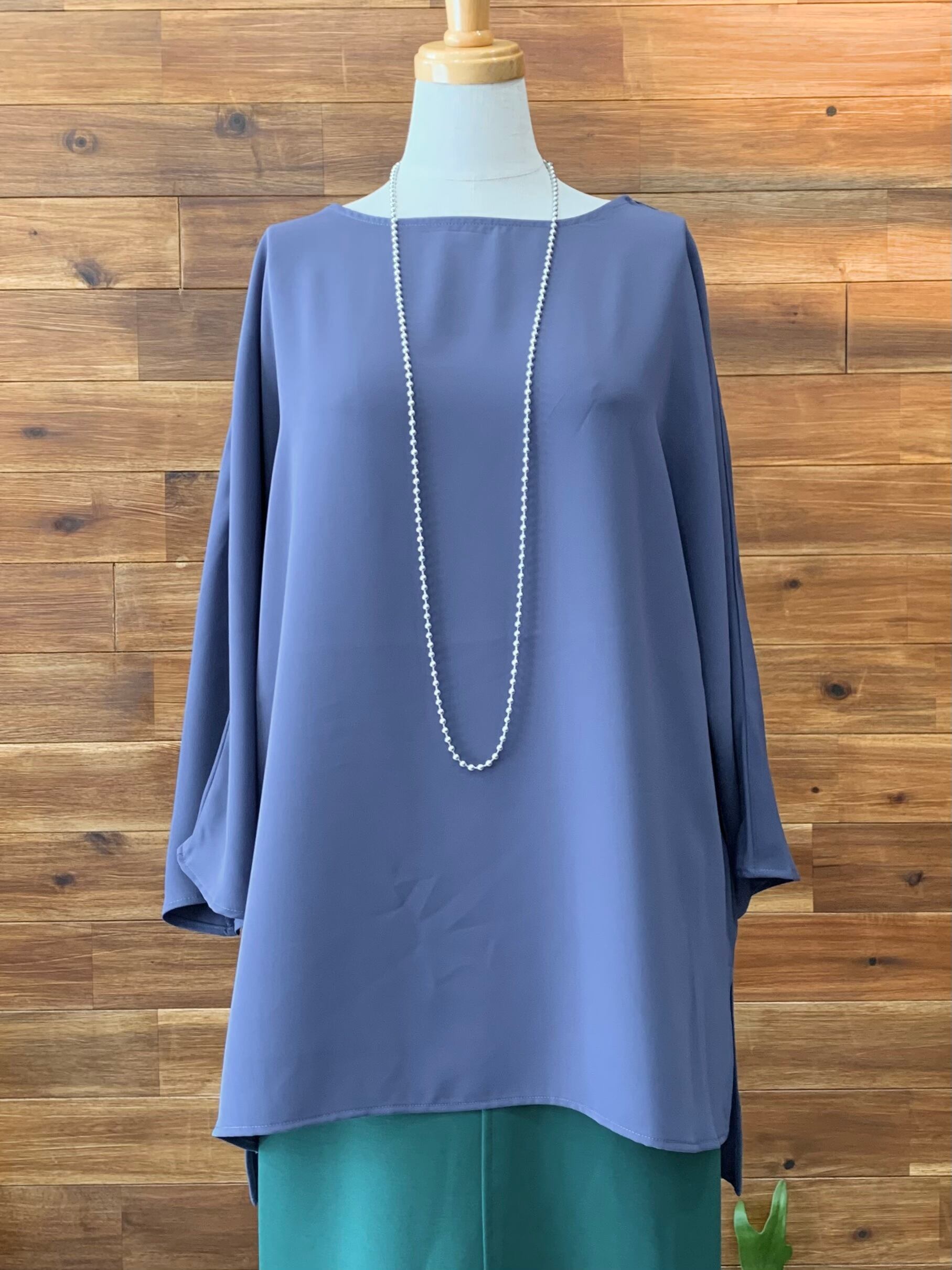 Tシャツのようなシンプルなデザインですが、ボートネック気味に開いた襟元と長めの袖丈、裾サイドのスリットで、綺麗目な雰囲気で着て頂けます♪