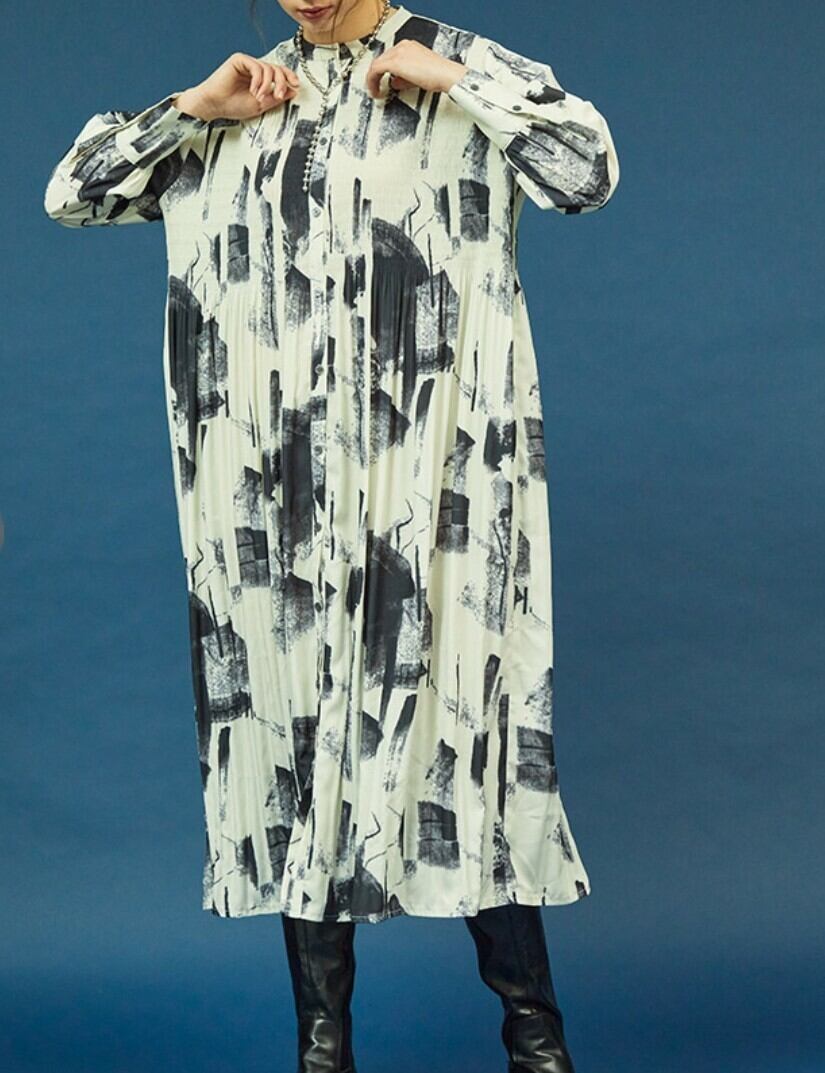 アートプリントショルダープリーツワンピース