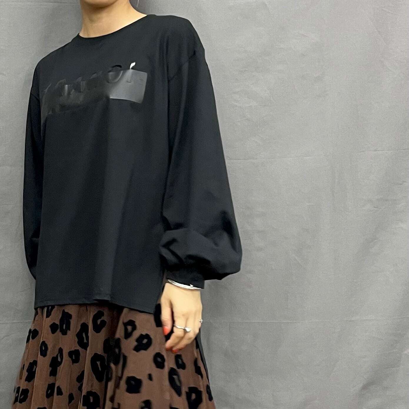 モードなラバープリントは、すっきりカッコいい印象で、一枚着はもちろん、インナー使いでもコーディネートのポイントになってくれますよ!