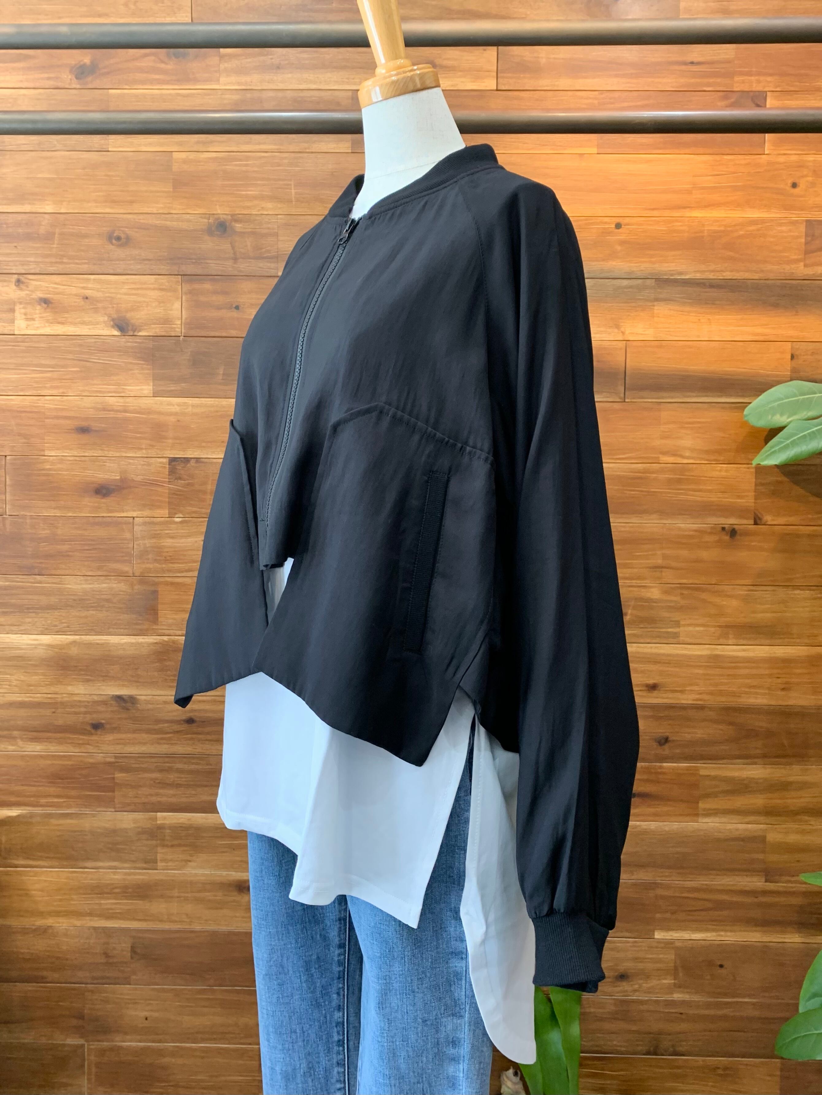 ショートブルゾンはフロント裾がスクエアなカッティング、短めのジッパーが特徴で個性的なデザイン♫