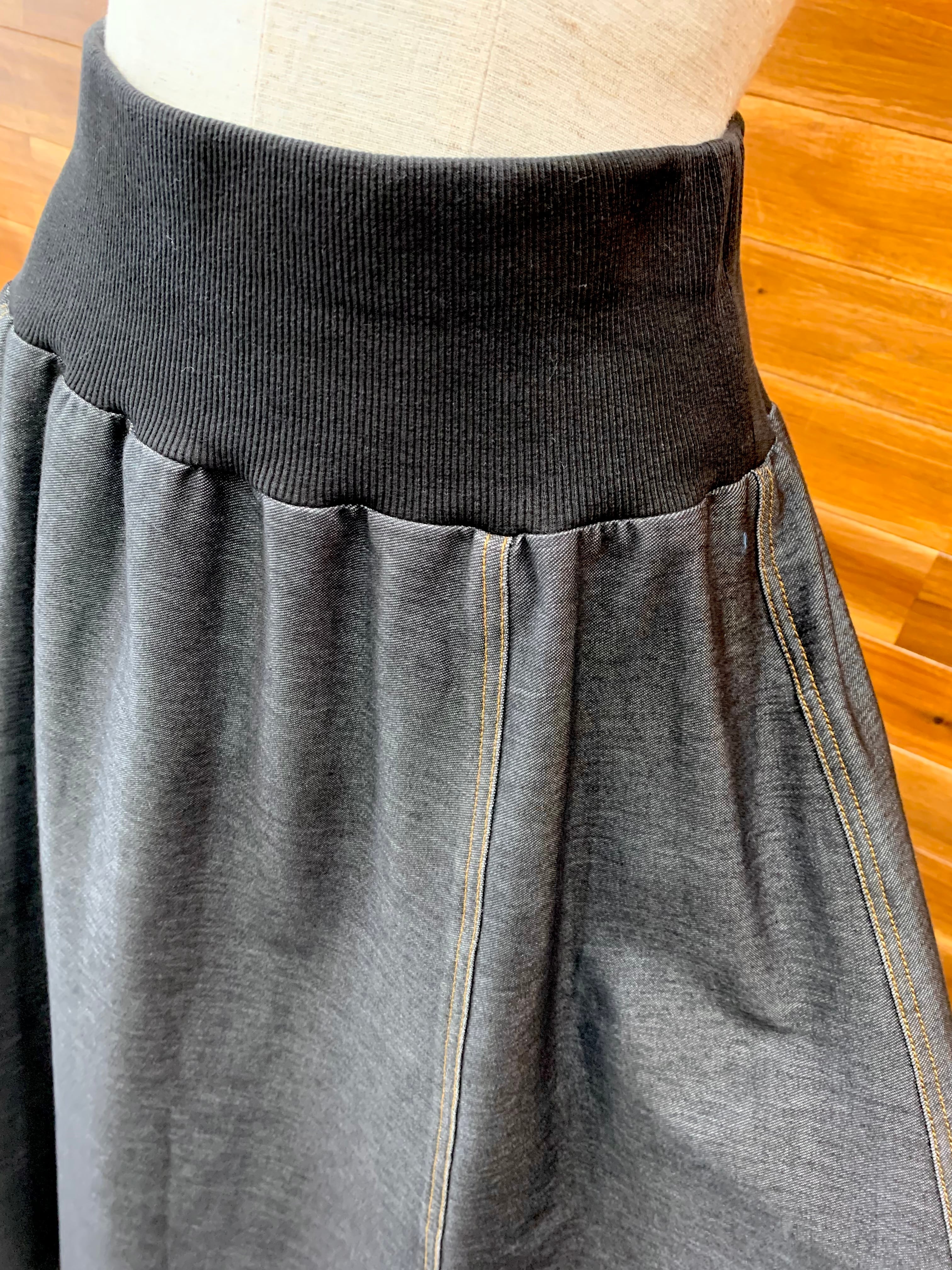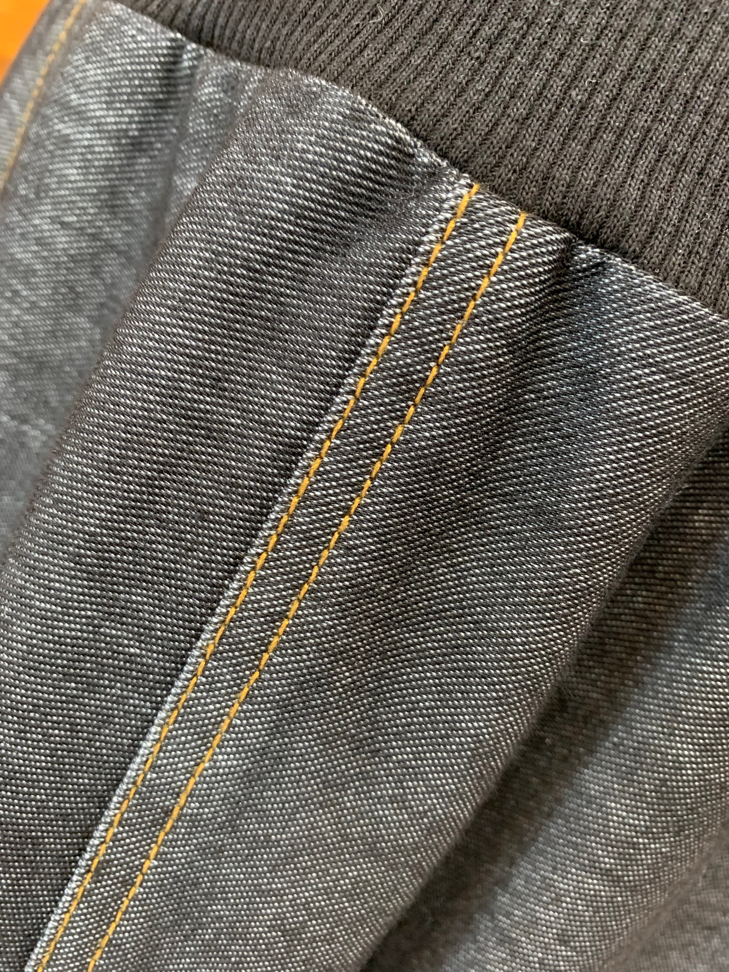 伸縮性のあるブラックデニム調素材に茶系のステッチが縦長ラインを強調♫ベーシックなカラーで、トップスの色を選びません♪