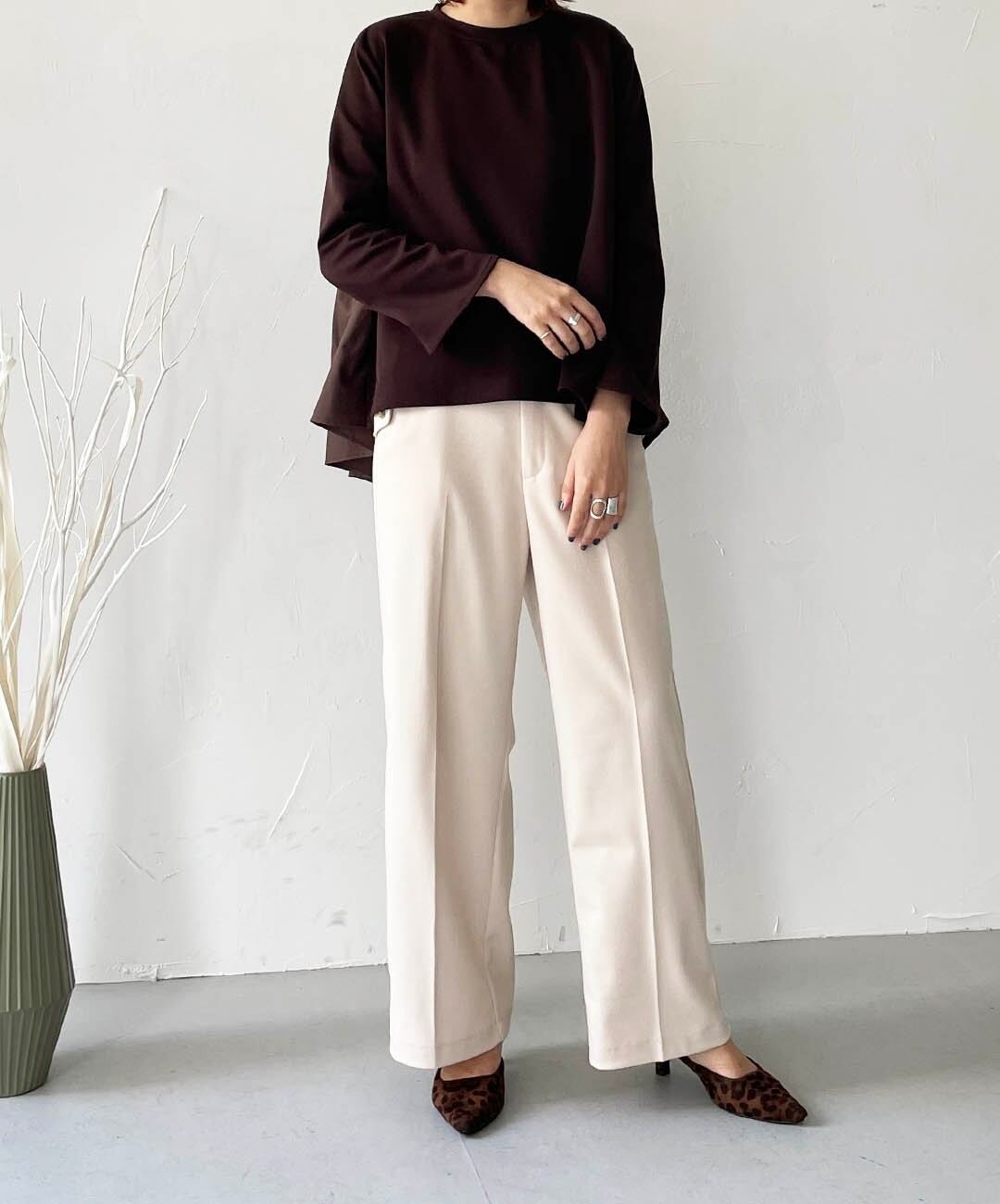 程良いレングスで、スカートにもパンツにも合わせやすい、オススメのデザイントップスです。