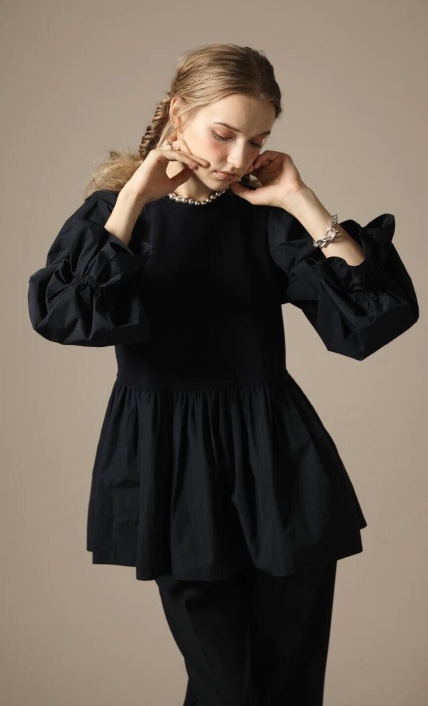 柔らかみのあるニットソー×ハリ感のある布帛のコントラストが魅力。