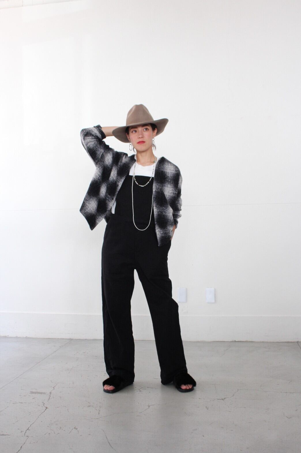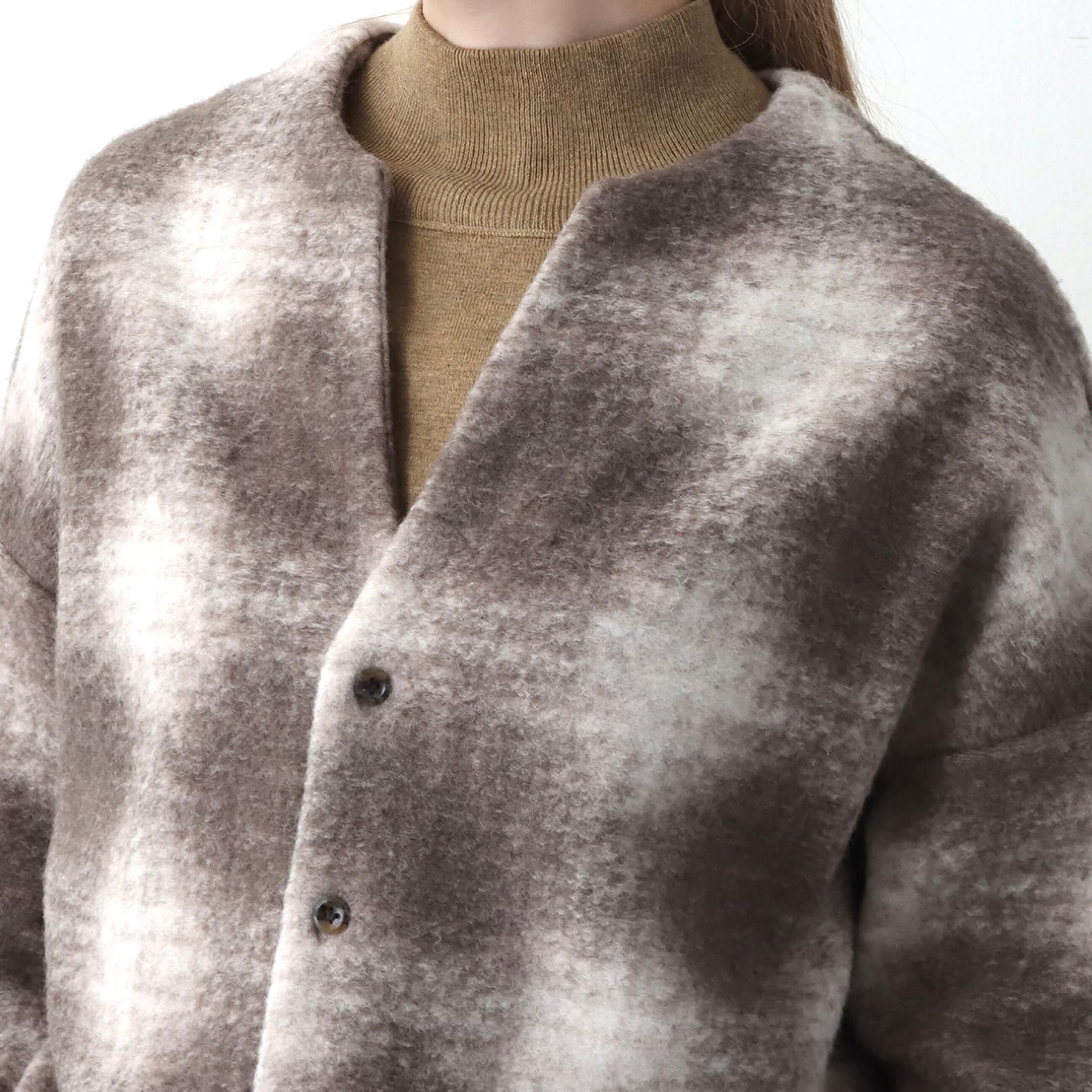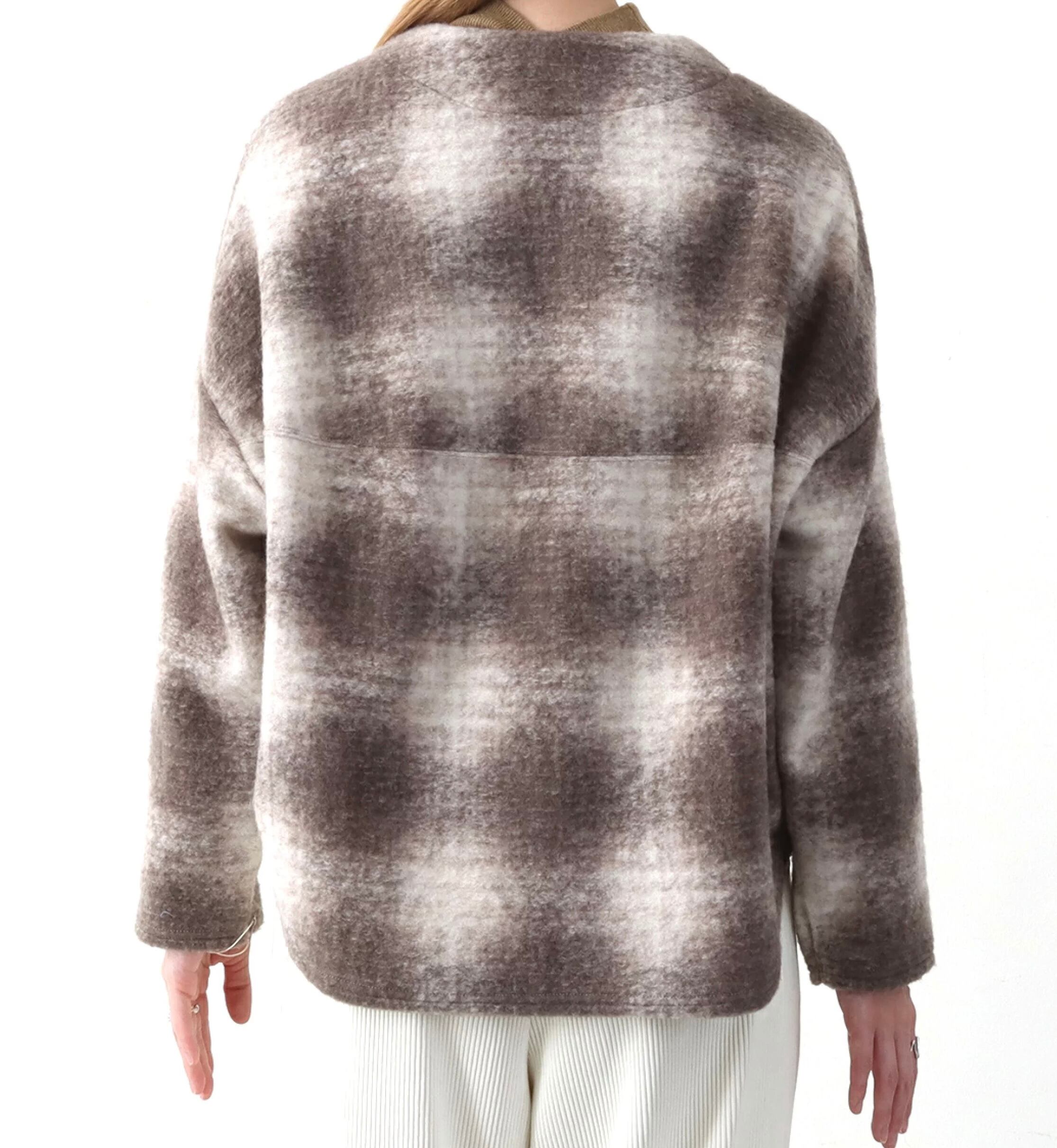 角度をつけた肩ラインは、少し後ろに抜けるような着用感で、後身頃やアームまわりのたっぷりとしたボリューム感をより引き立てるようなシルエットになっています。