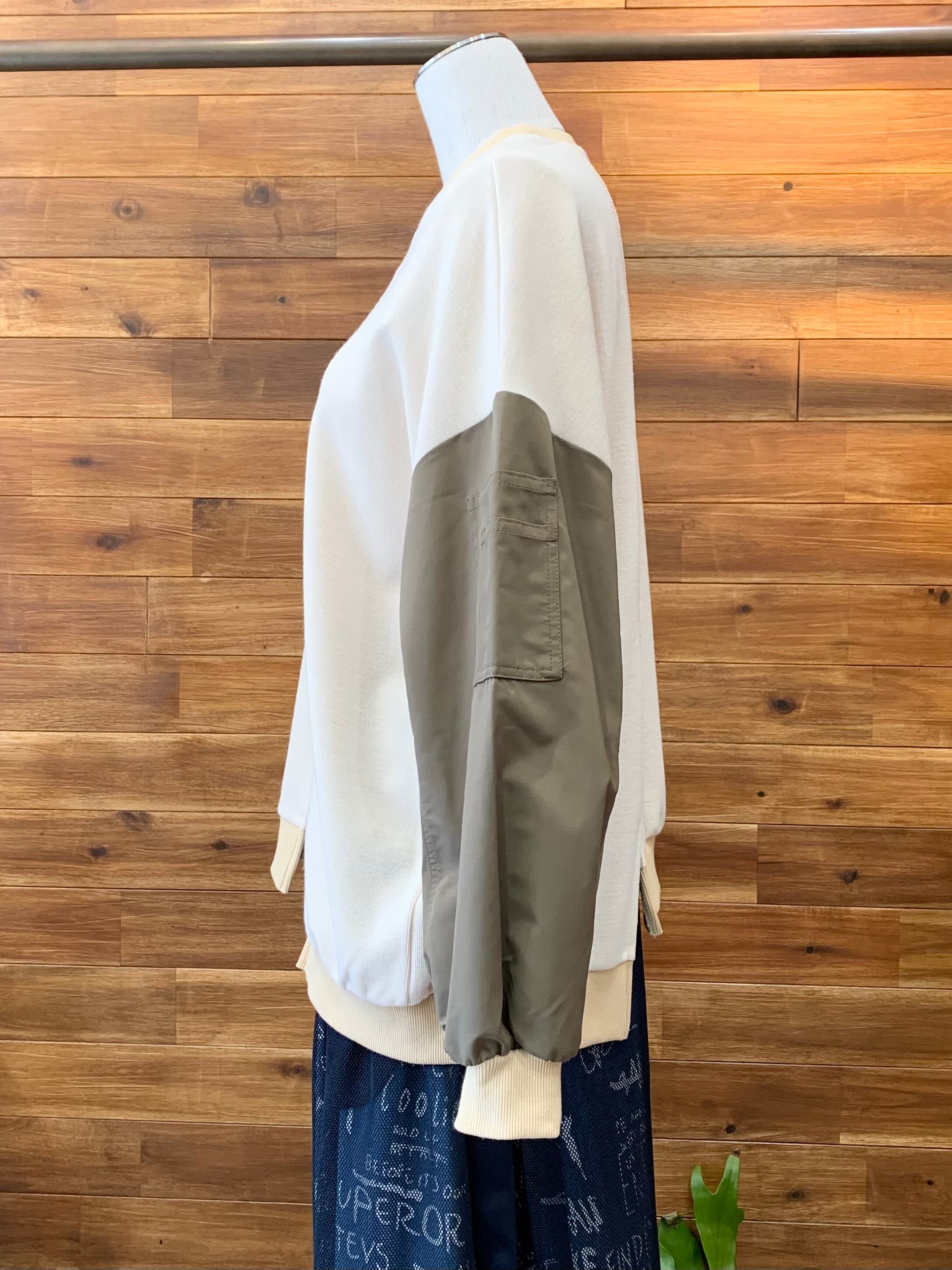 身頃は裏起毛の生地に、袖は異素材切り替えのドッキングトレーナーです。