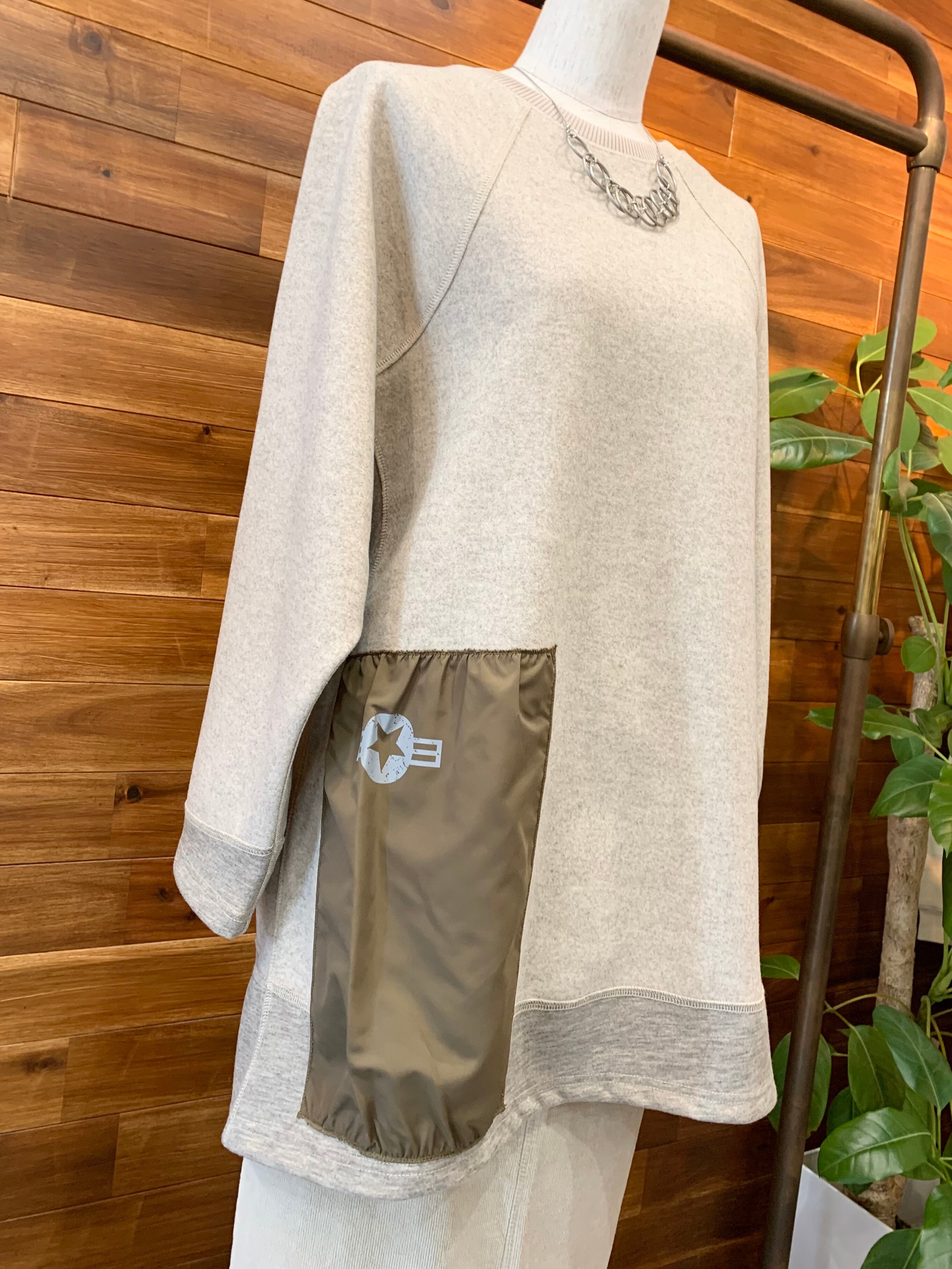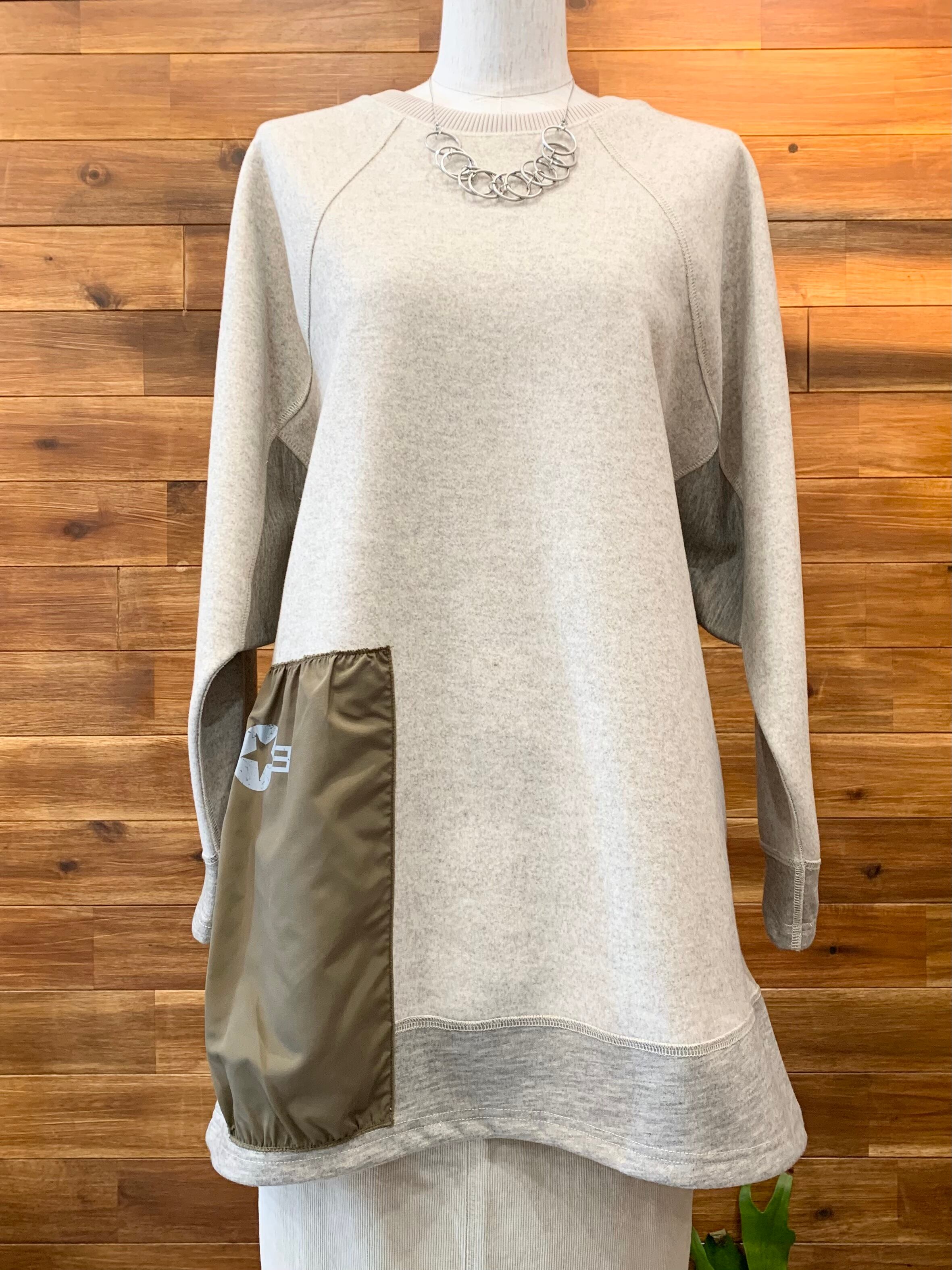 ゆとりのあるラグラン袖で、脇下、袖口、裾に裏を表にした同素材生地で切り替えています◎