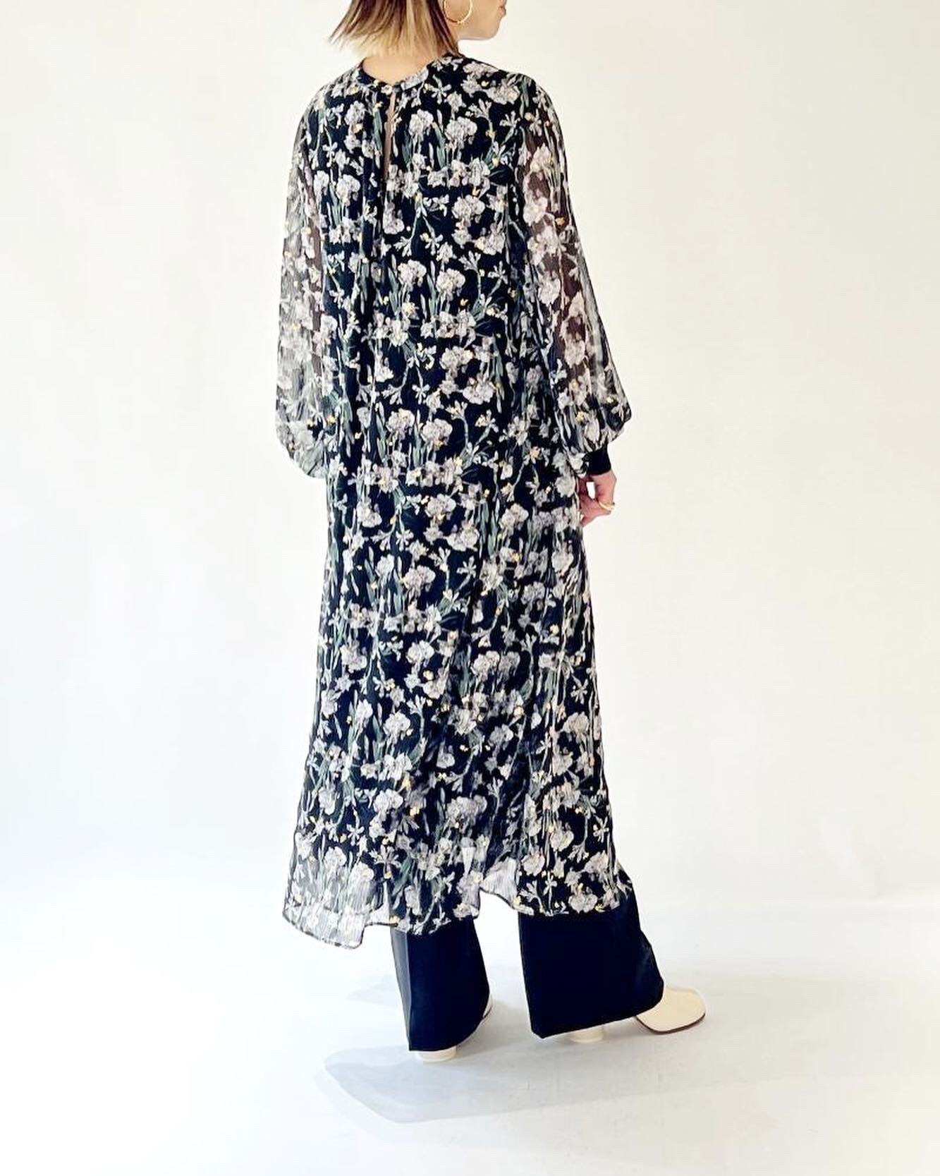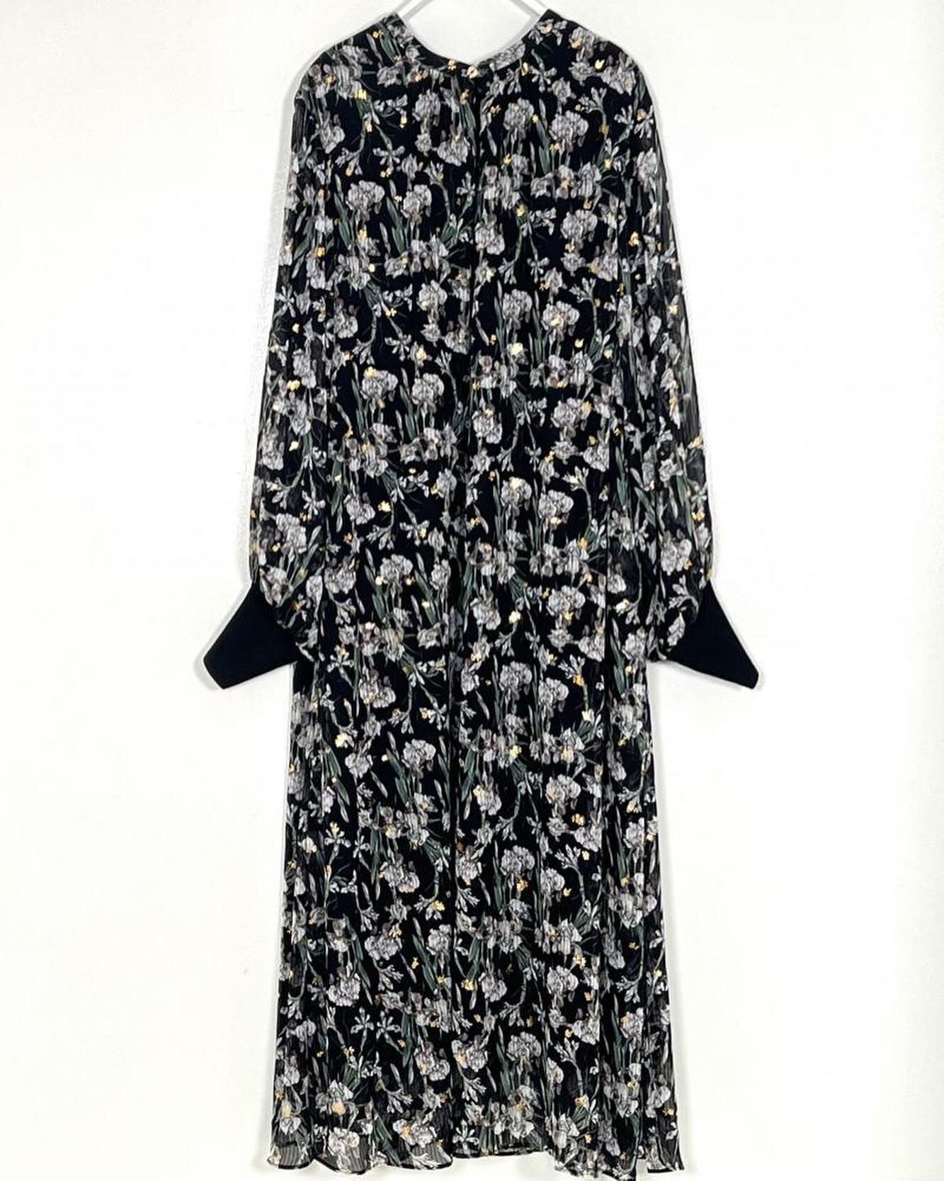 箔フラワープリント袖リブワンピース ブラック