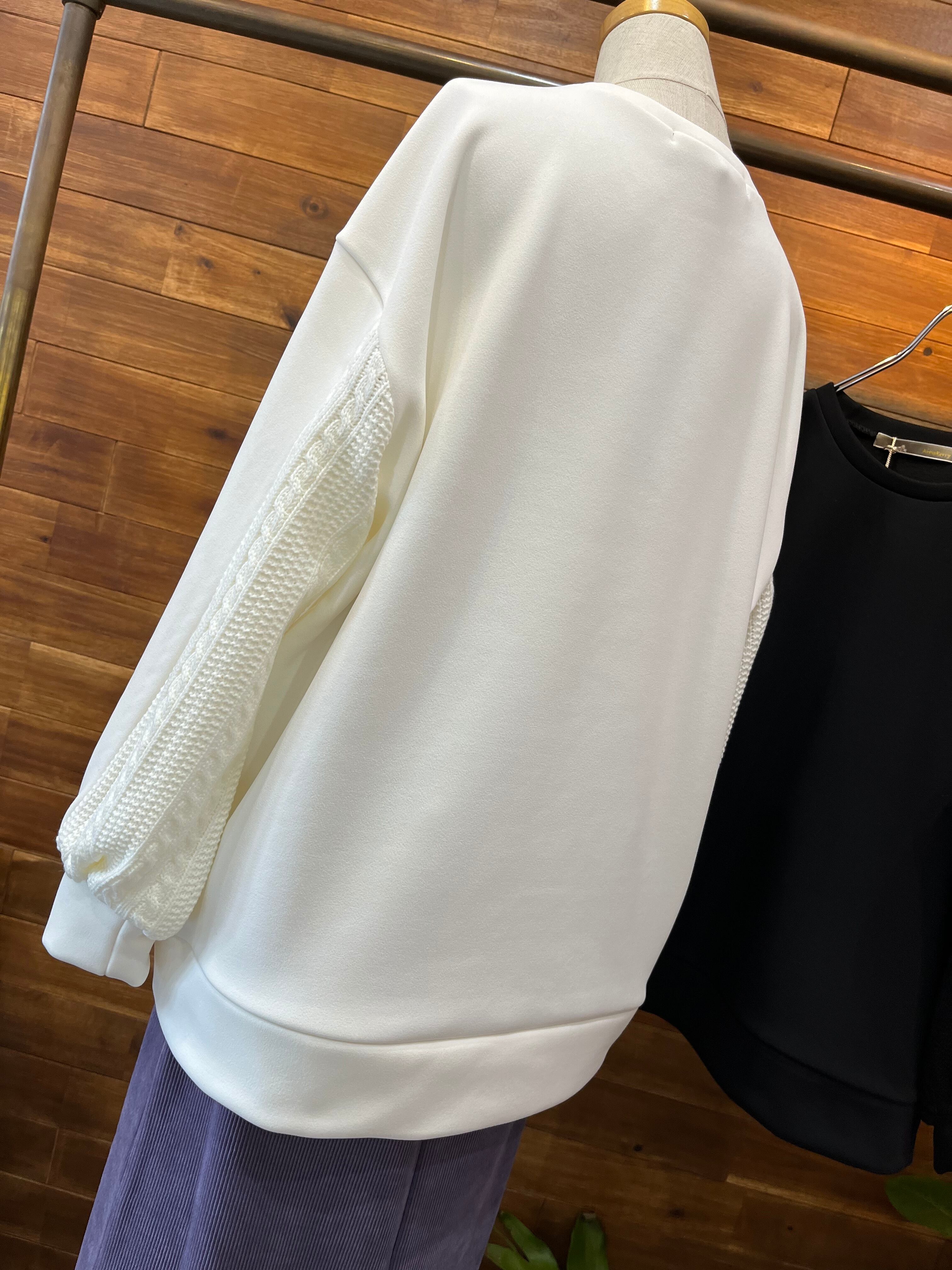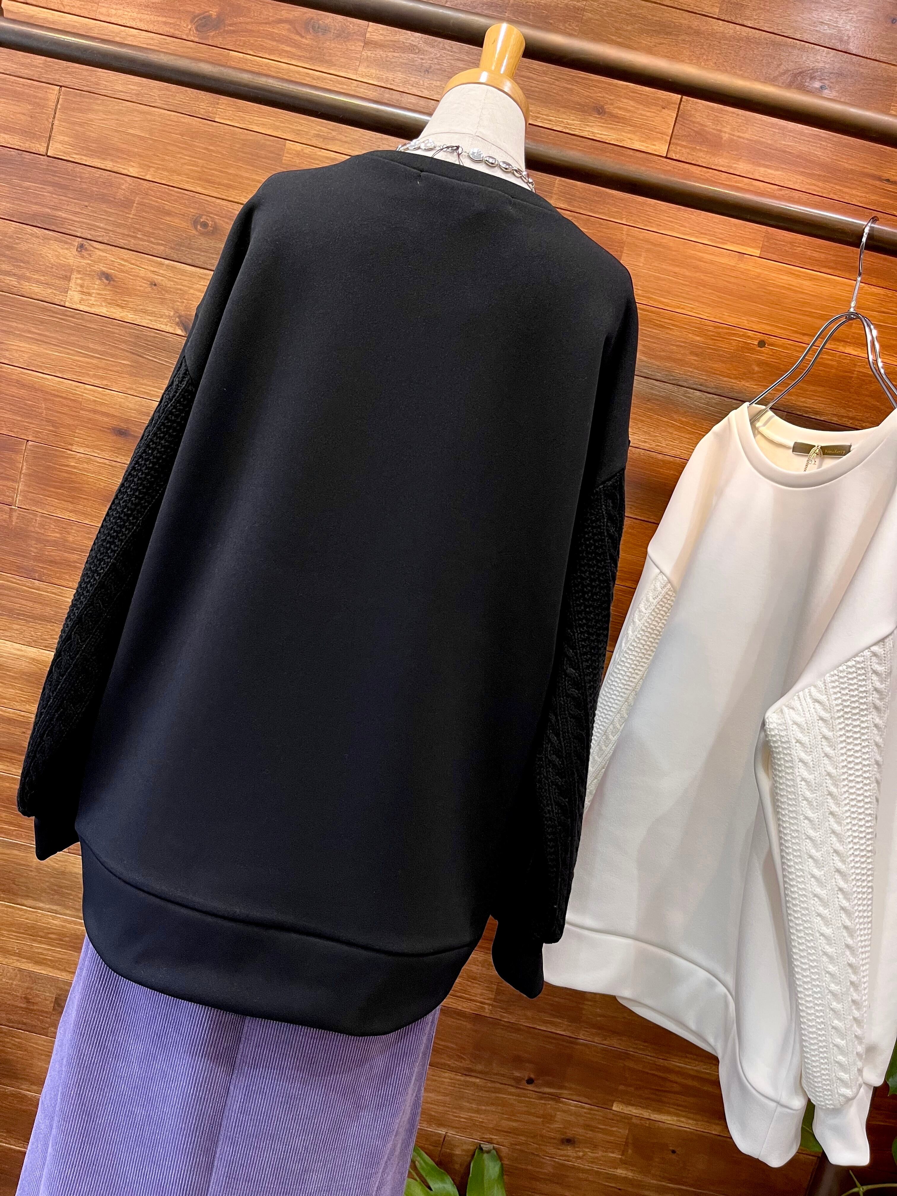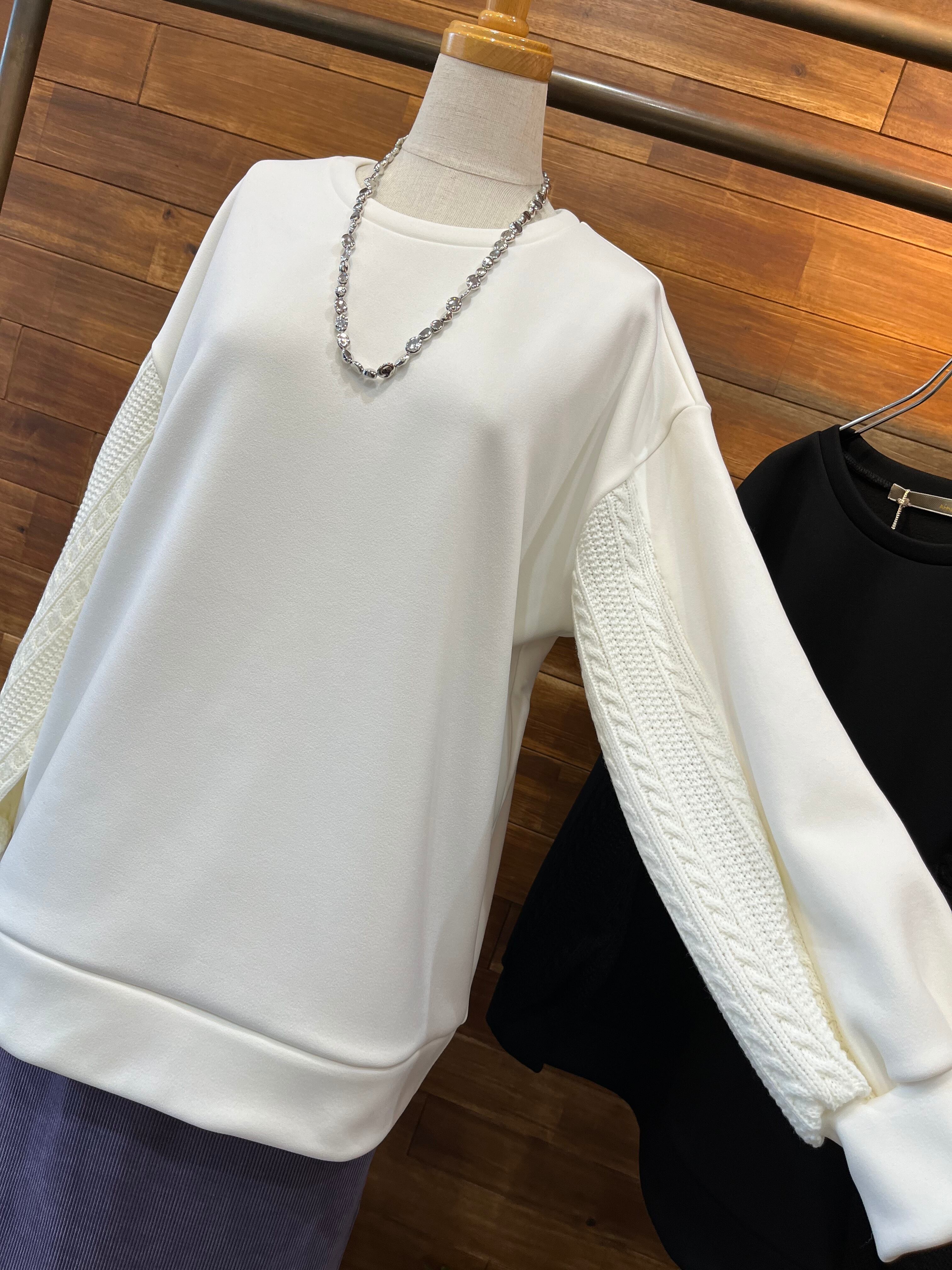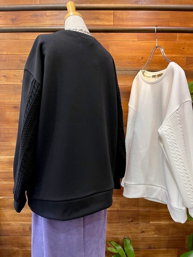 袖のケーブルニット切り替えがポイントで、一枚で着映えするトップスです。
