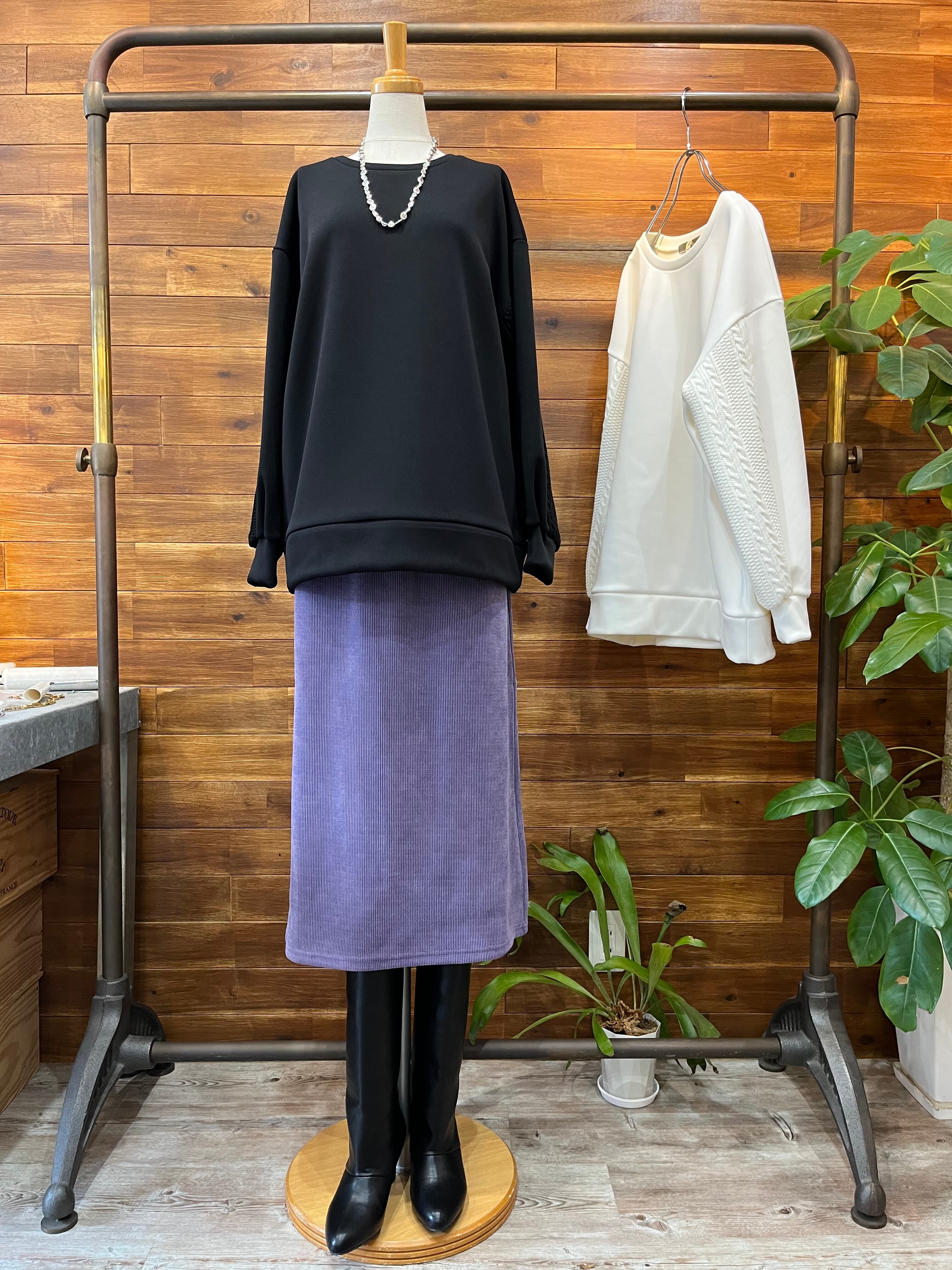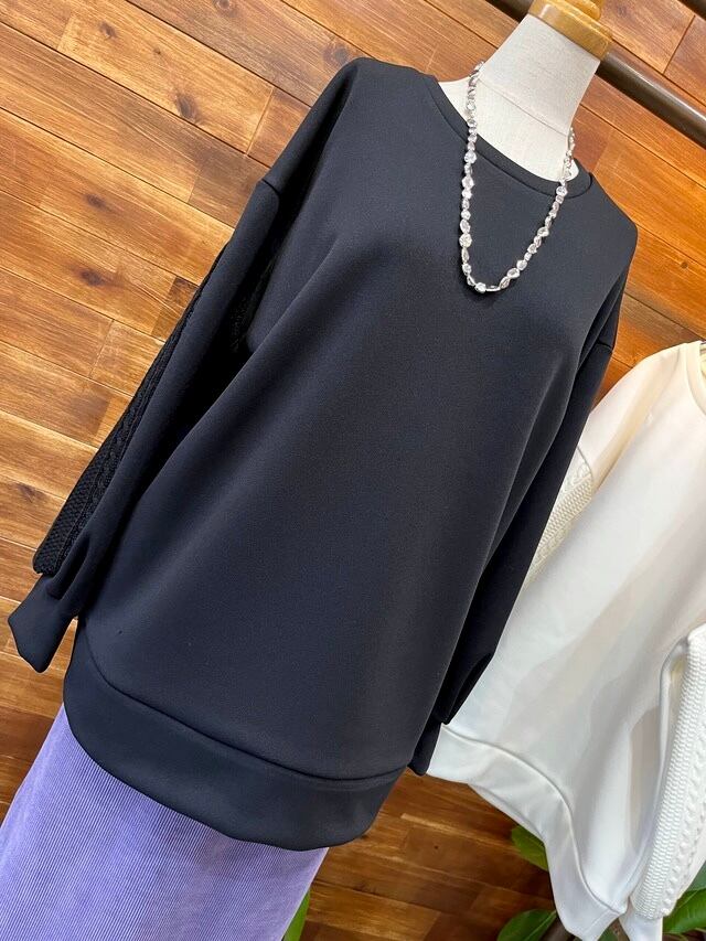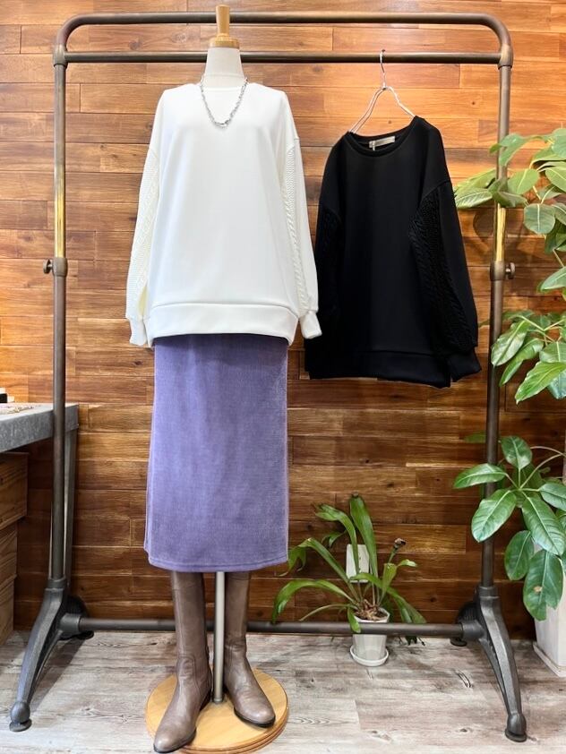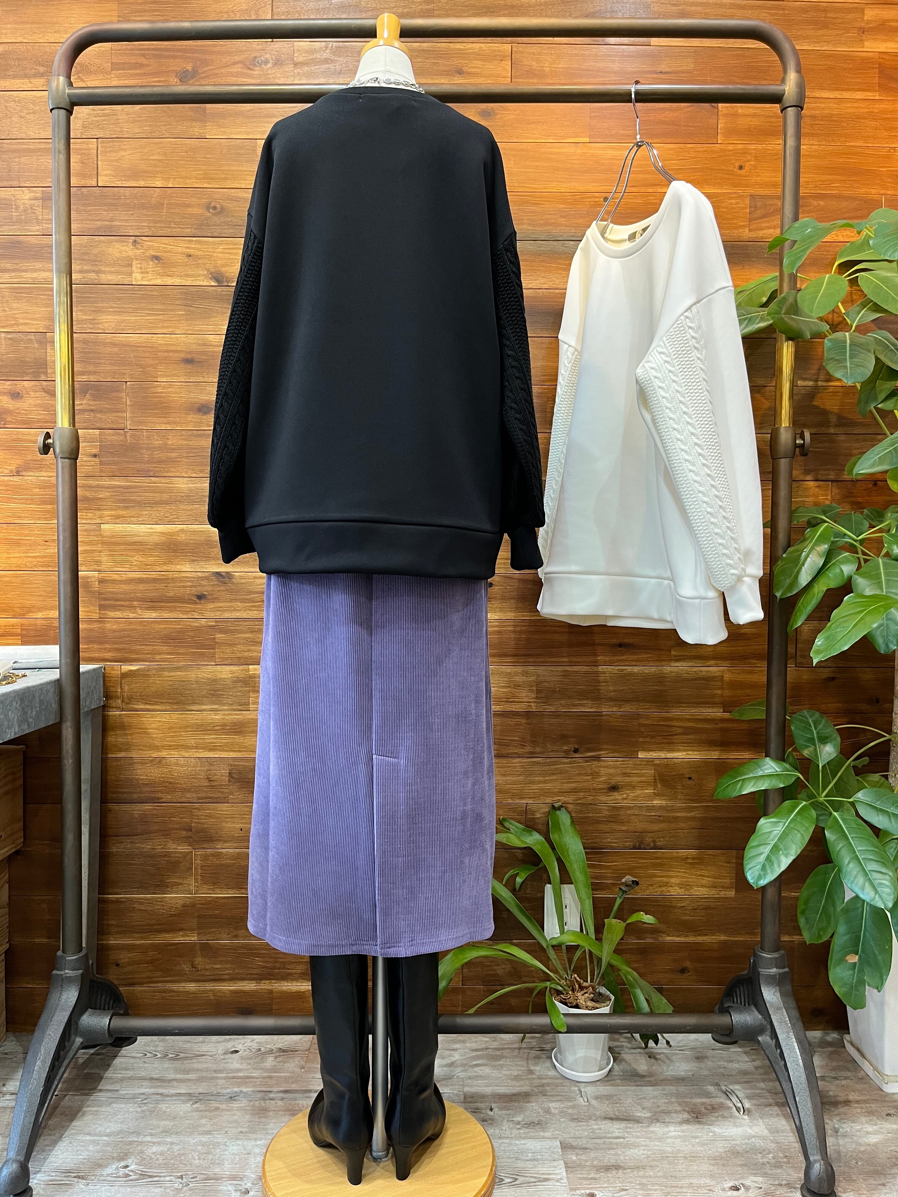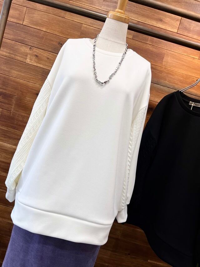 袖のケーブルニット切り替えがポイントで、一枚で着映えするトップスです。