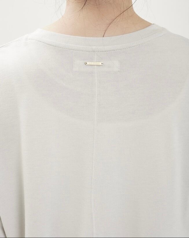 身頃と同系配色のロゴで大人っぽくシンプルに仕上げ、腰回りまで隠れる着丈で体型カバーにも使えるようにしました。