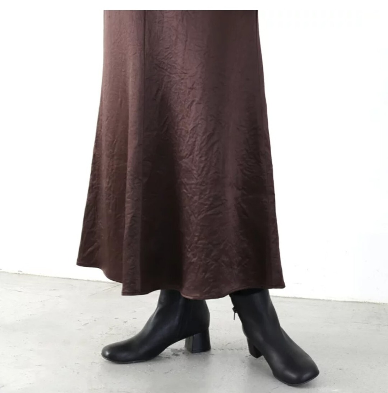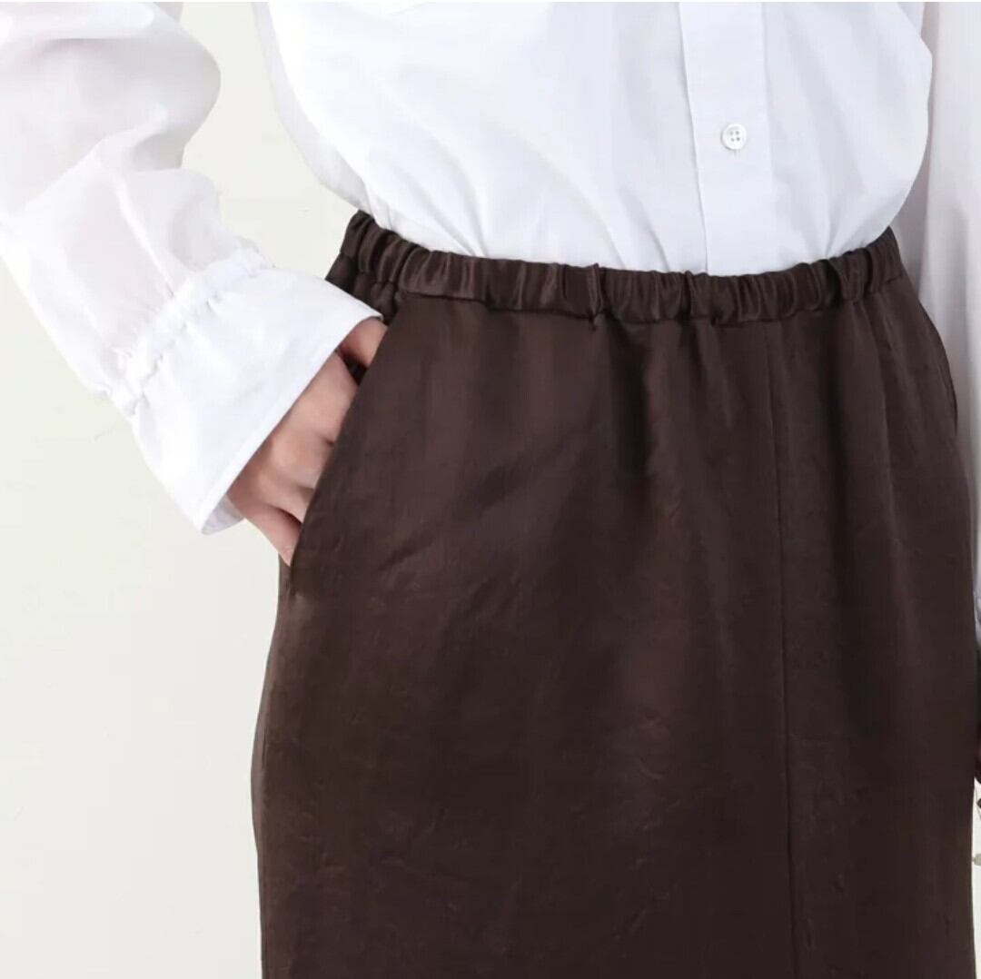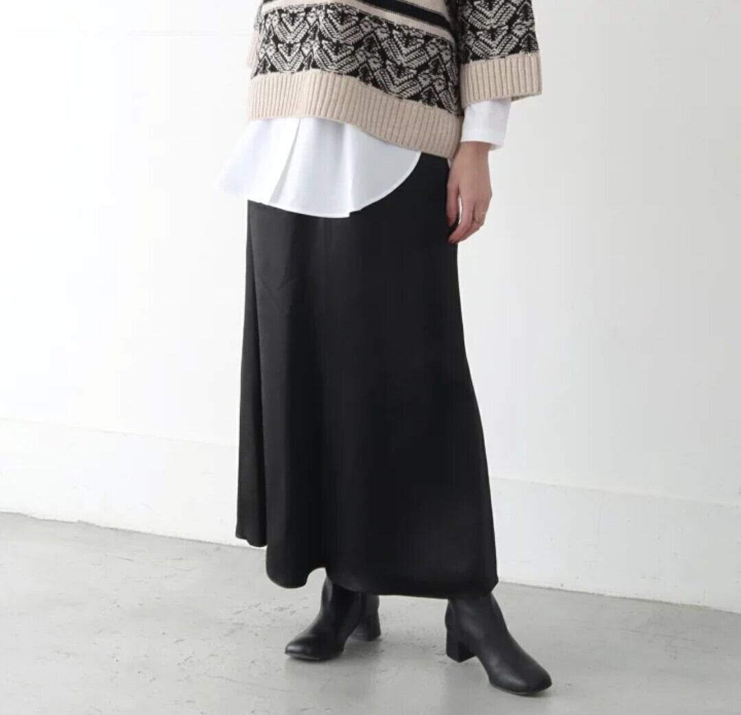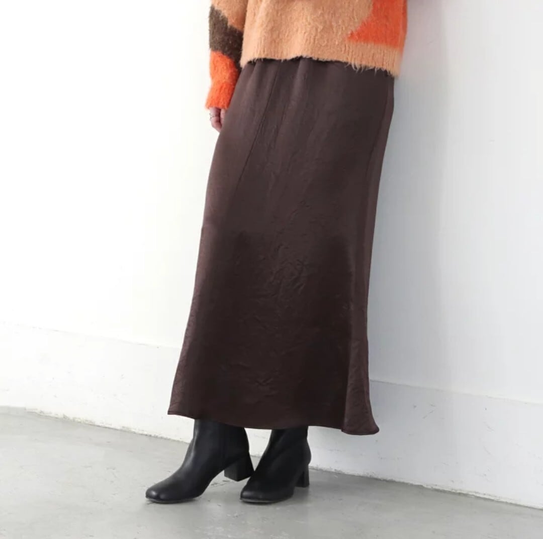 光沢もあり、主張が強そうに見えますが、意外とカジュアルから綺麗めまでどんなスタイリングにもマッチするスカートです。