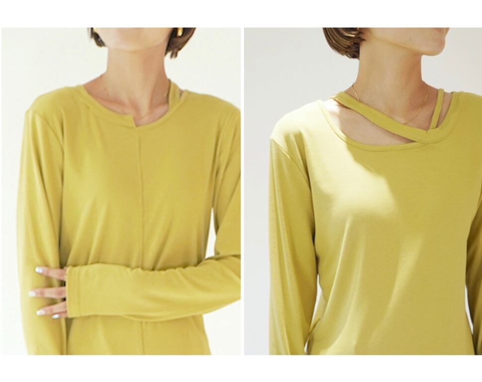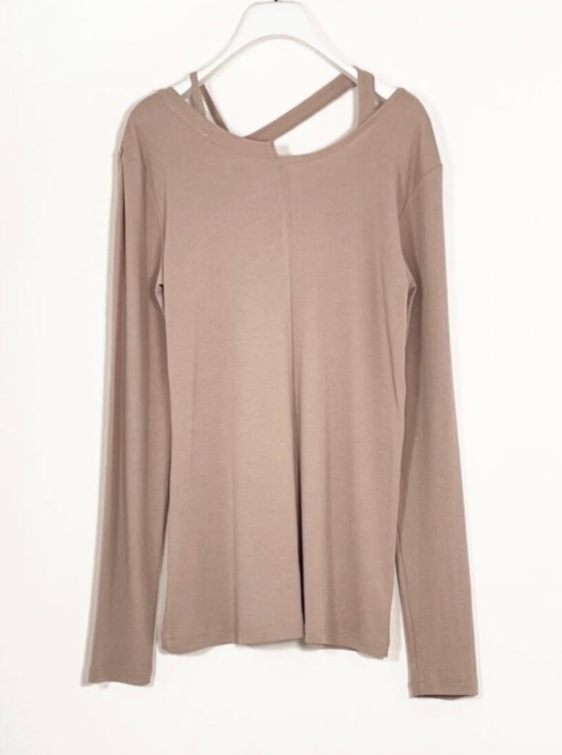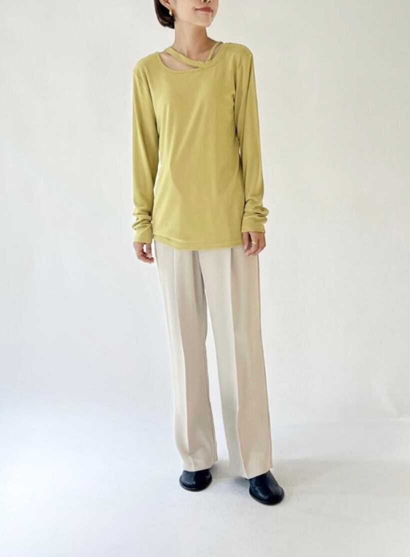 左右で幅の異なる衿から続くストラップをアシンメトリーに配置したデザイン性のあるトップスで、ニットやシャツのレイヤードから覗かせるのがおすすめです。