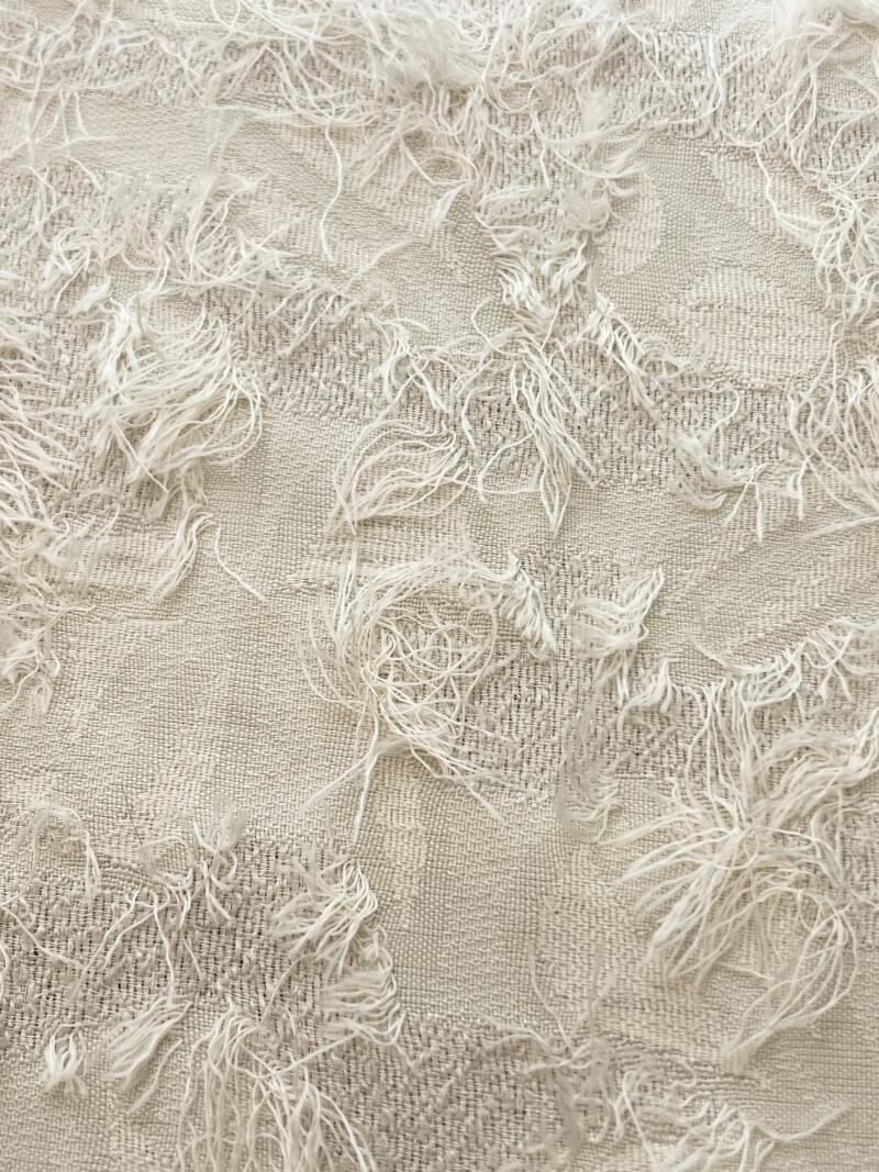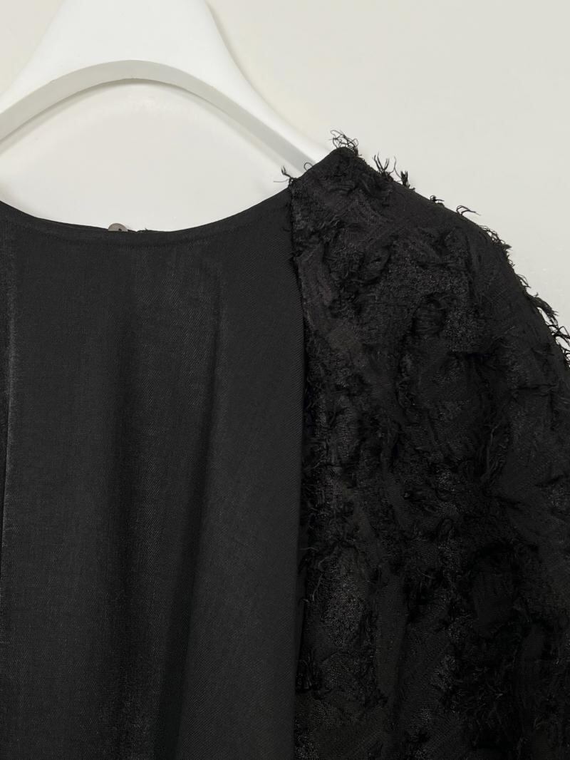 身頃部分は柔らかいツイル素材を使用し、袖には毛足のあるジャガード素材を使用したドッキングブラウスです。