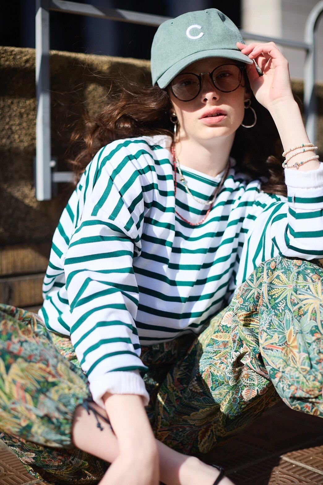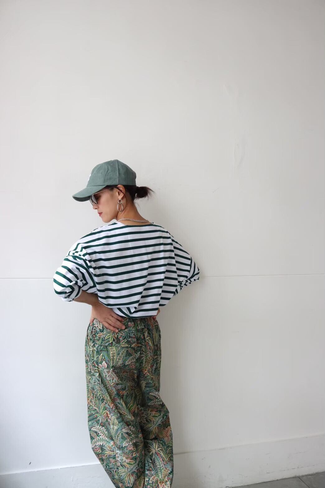 目をひく柄なのでシンプルなトップスで決まりますが、ボーダートップスなどとの、柄×柄のコーデにチャレンジしてみるのもおすすめです◎