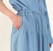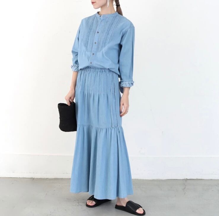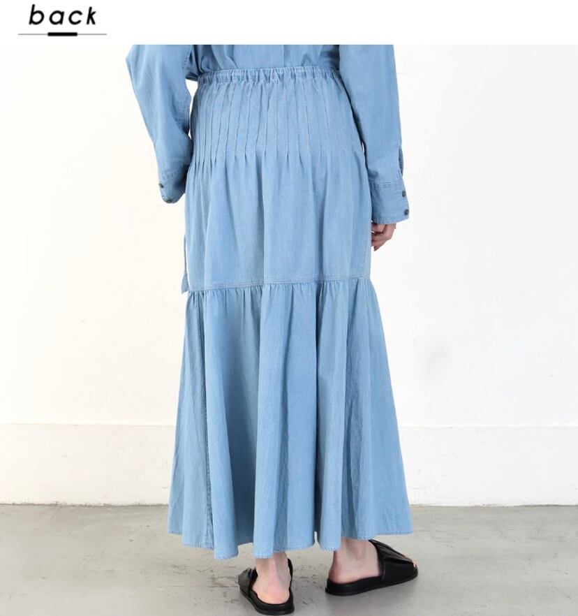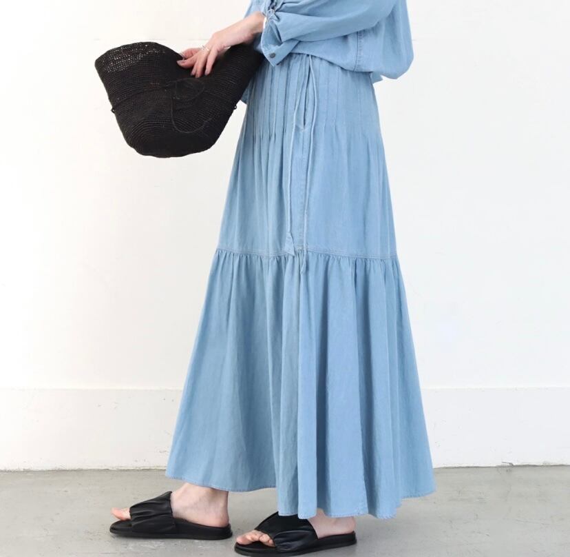 素材はカジュアルですが、全体的にすっきりとした女性らしいシルエットで、切り換え下はギャザーとたっぷりのフレアーが華やかな印象に。
