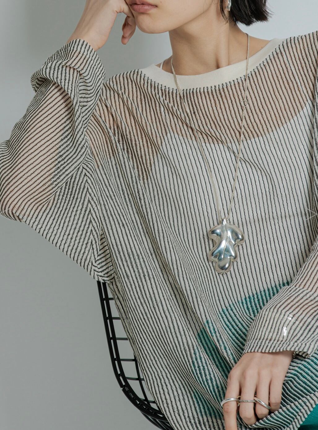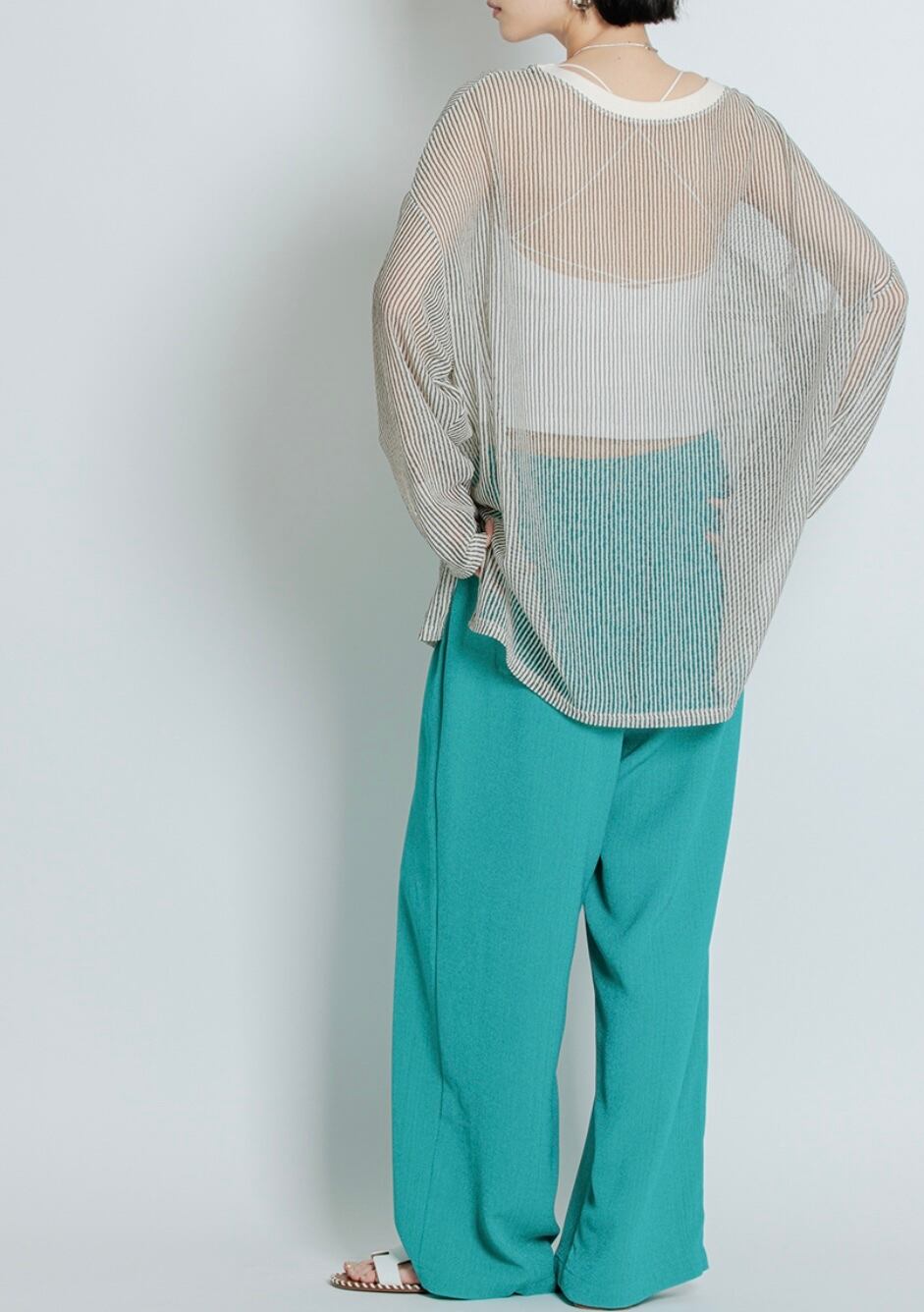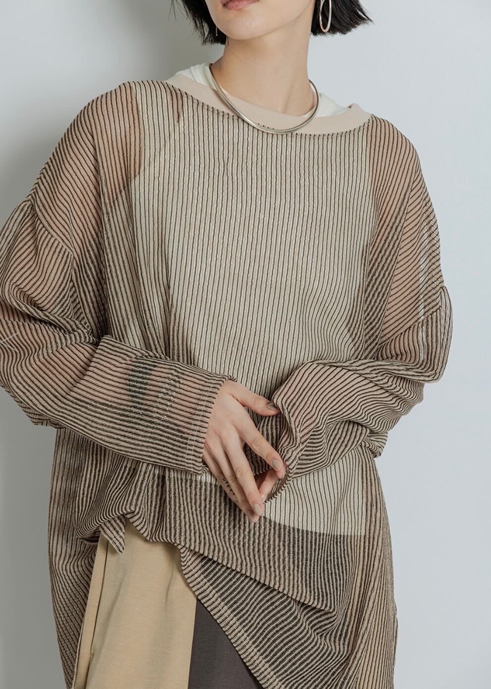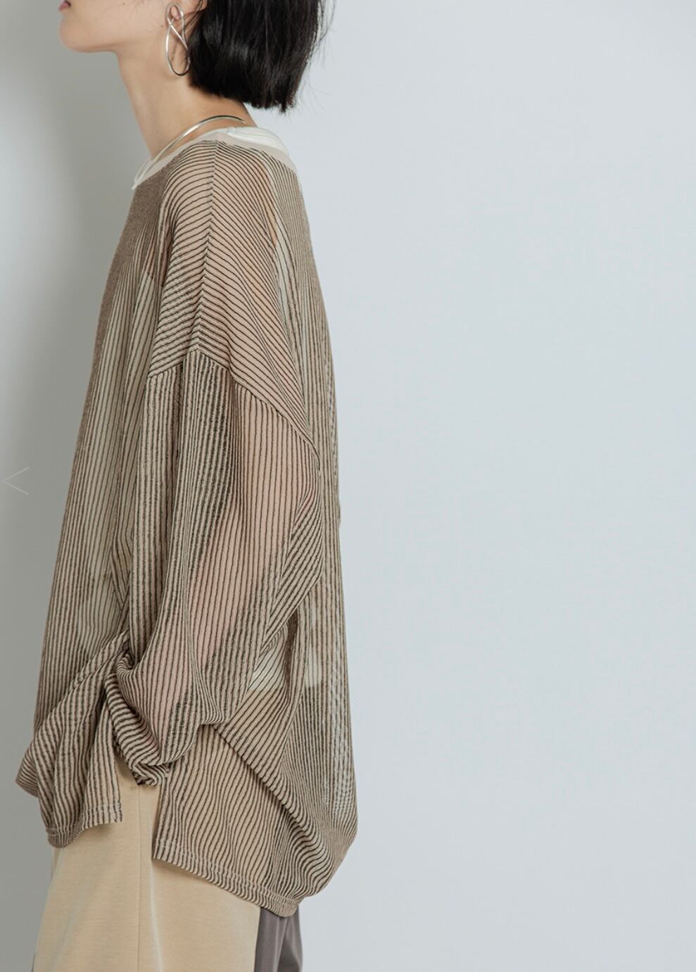 シャリ感と透け感のあるストライプ素材を使用した、ゆるっとしたシルエットのカットソープルオーバー。