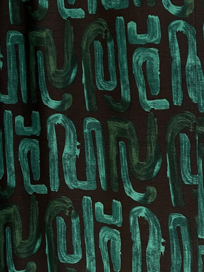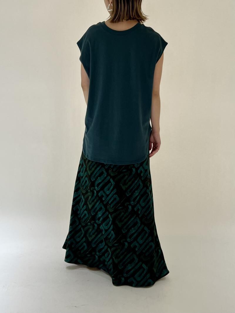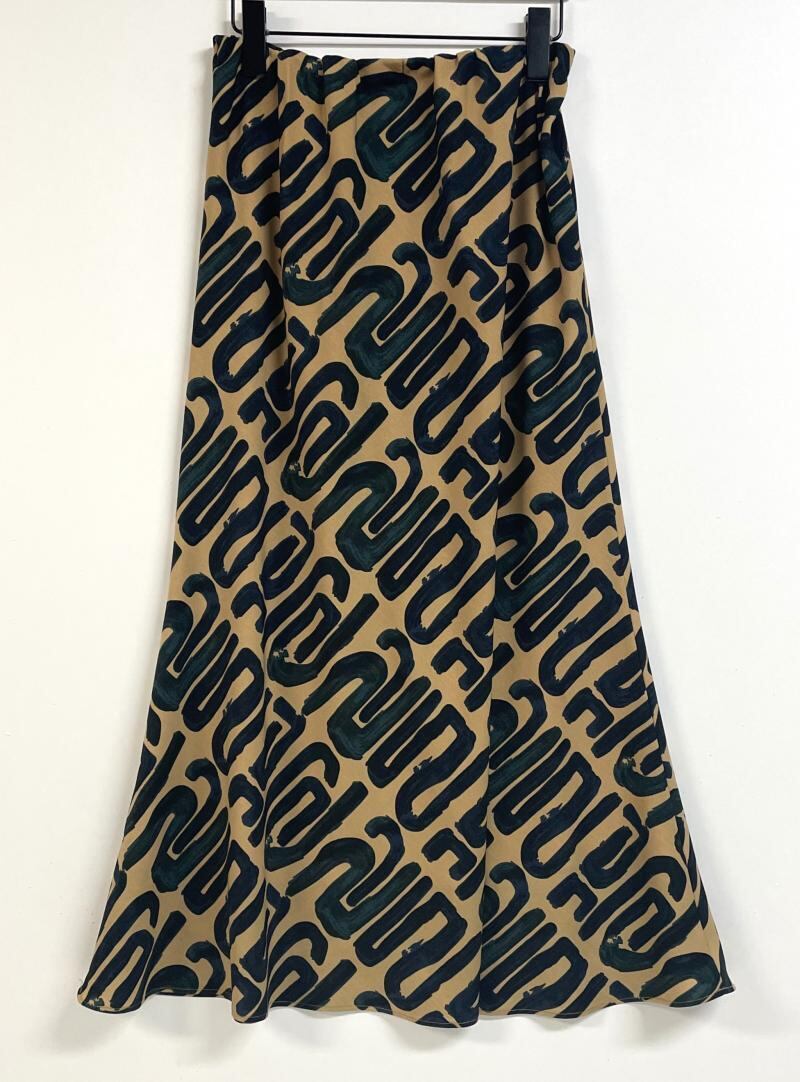 絵具で描いたような印象的なアート柄素材を使用した、バイアスマーメイドスカートです。