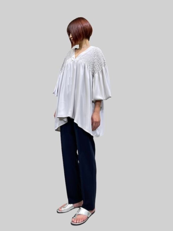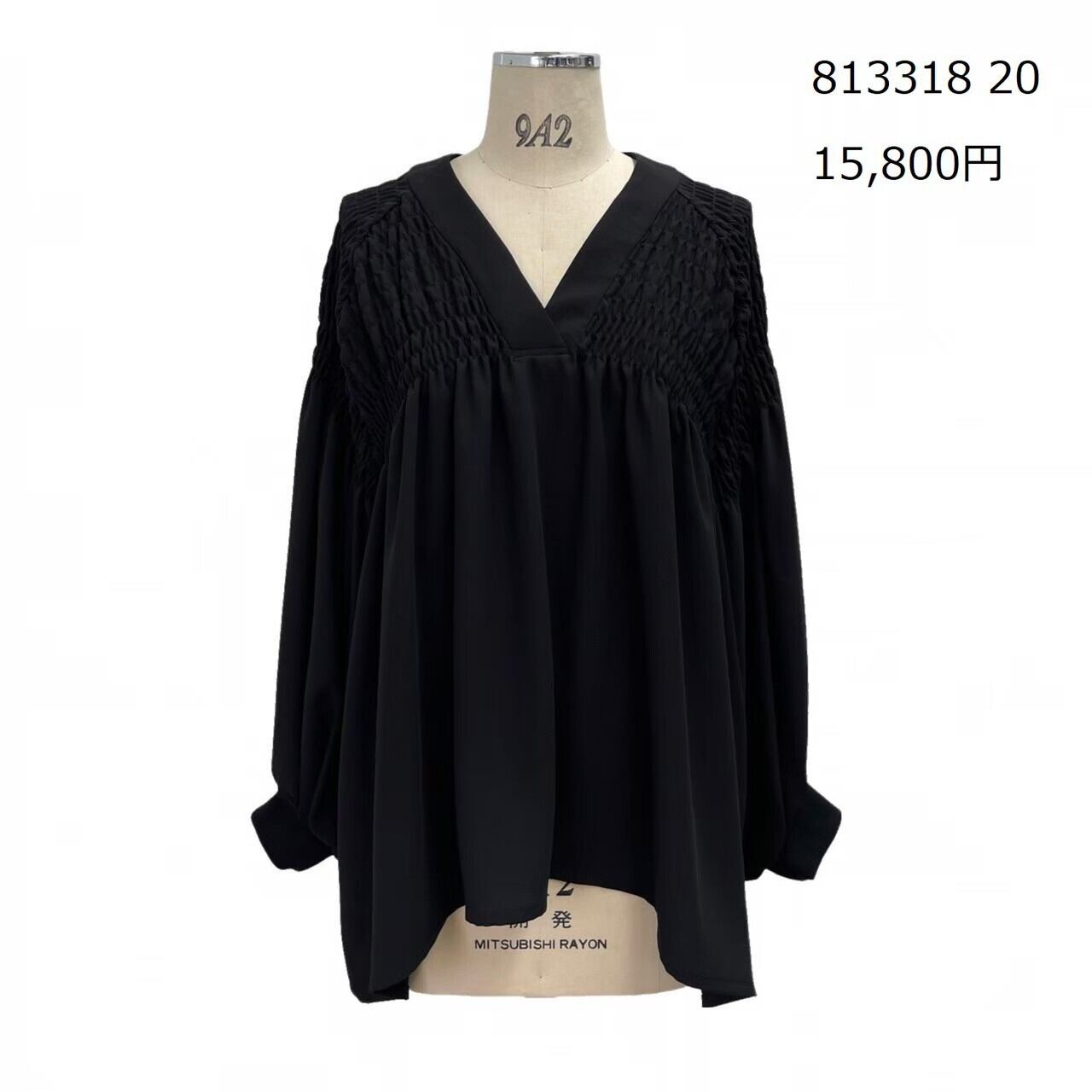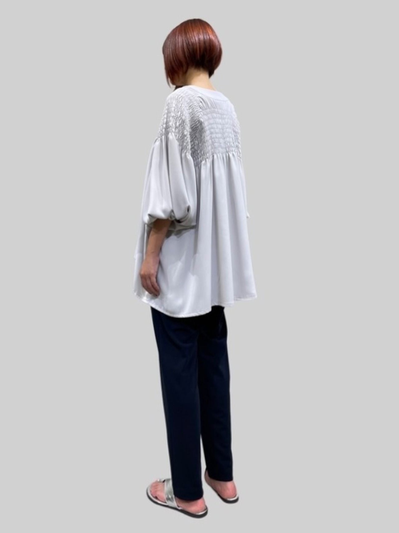 ボリューミーなシルエットが華やかですが、すっきりとしたVネックで甘くなりすぎない印象なので、カジュアルなボトムとの甘辛コーデにも最適です♪